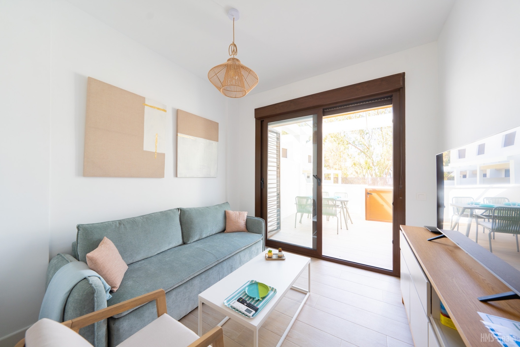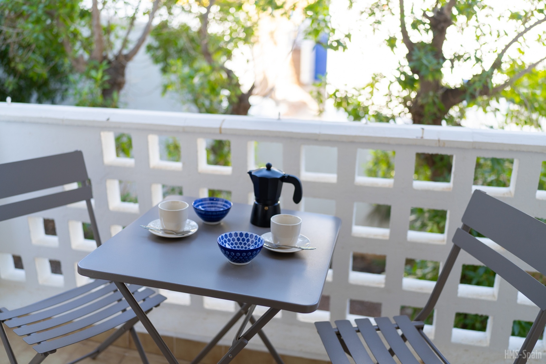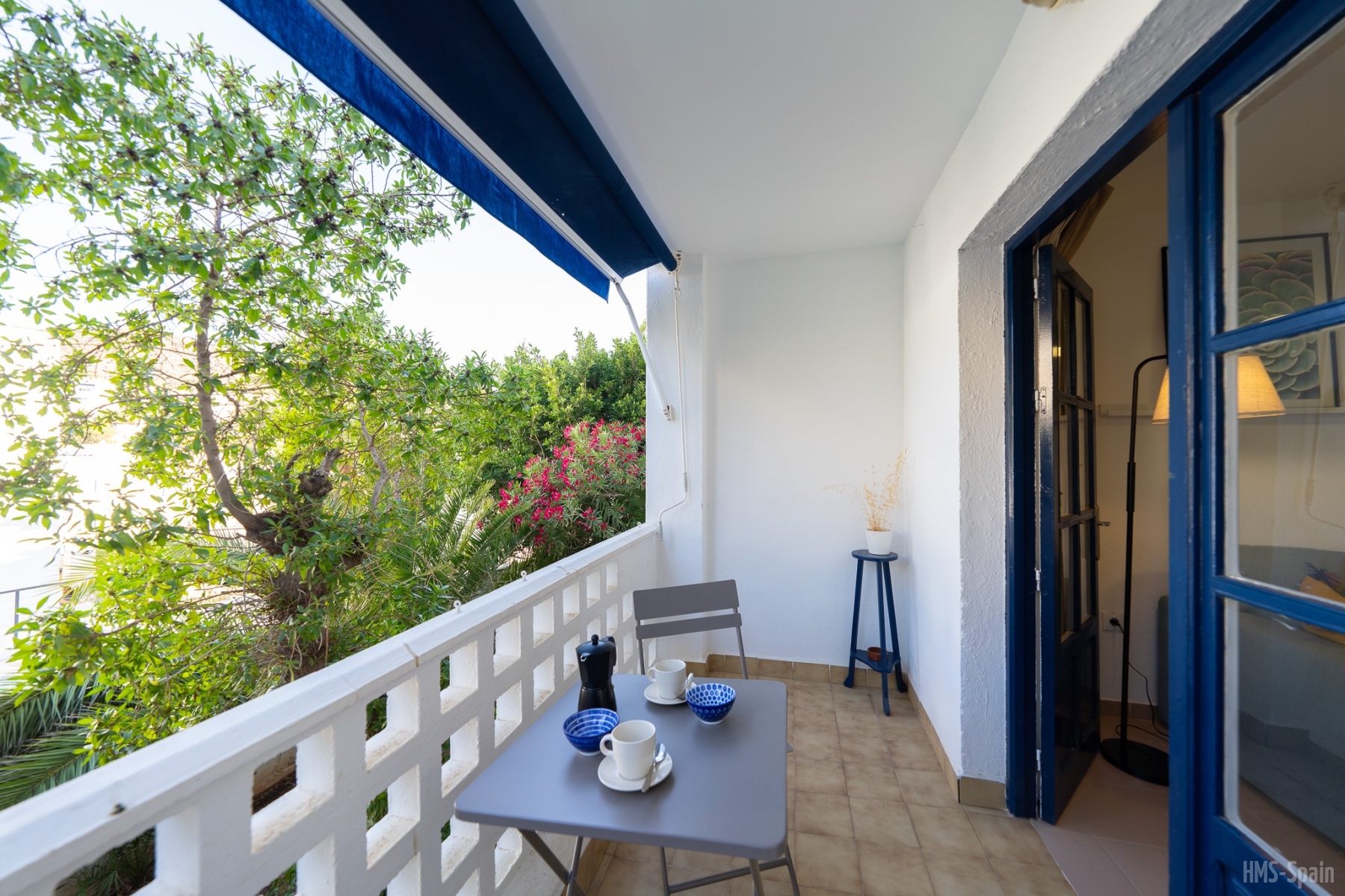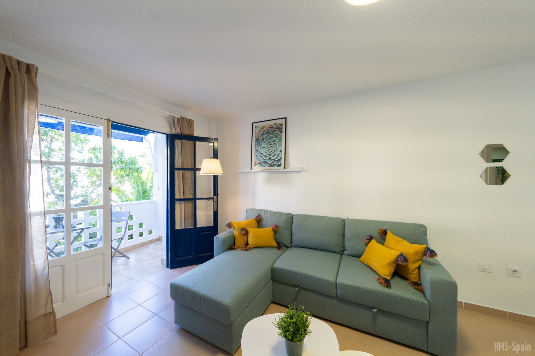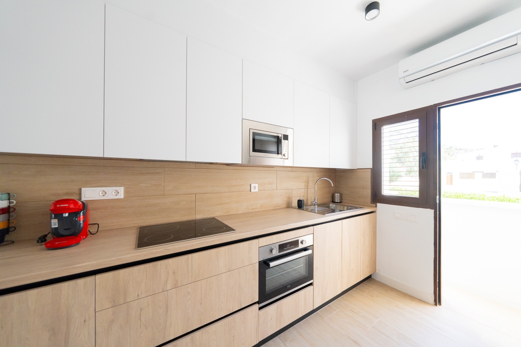 Precioso apartamento de planta baja con 2 dormitorios a un paso de la playa central de San José. Dispone de cocina totalmente equipada con microondas, horno, cafetera y lavadora. Ventiladores de techo en el salón y en los dormitorios.
