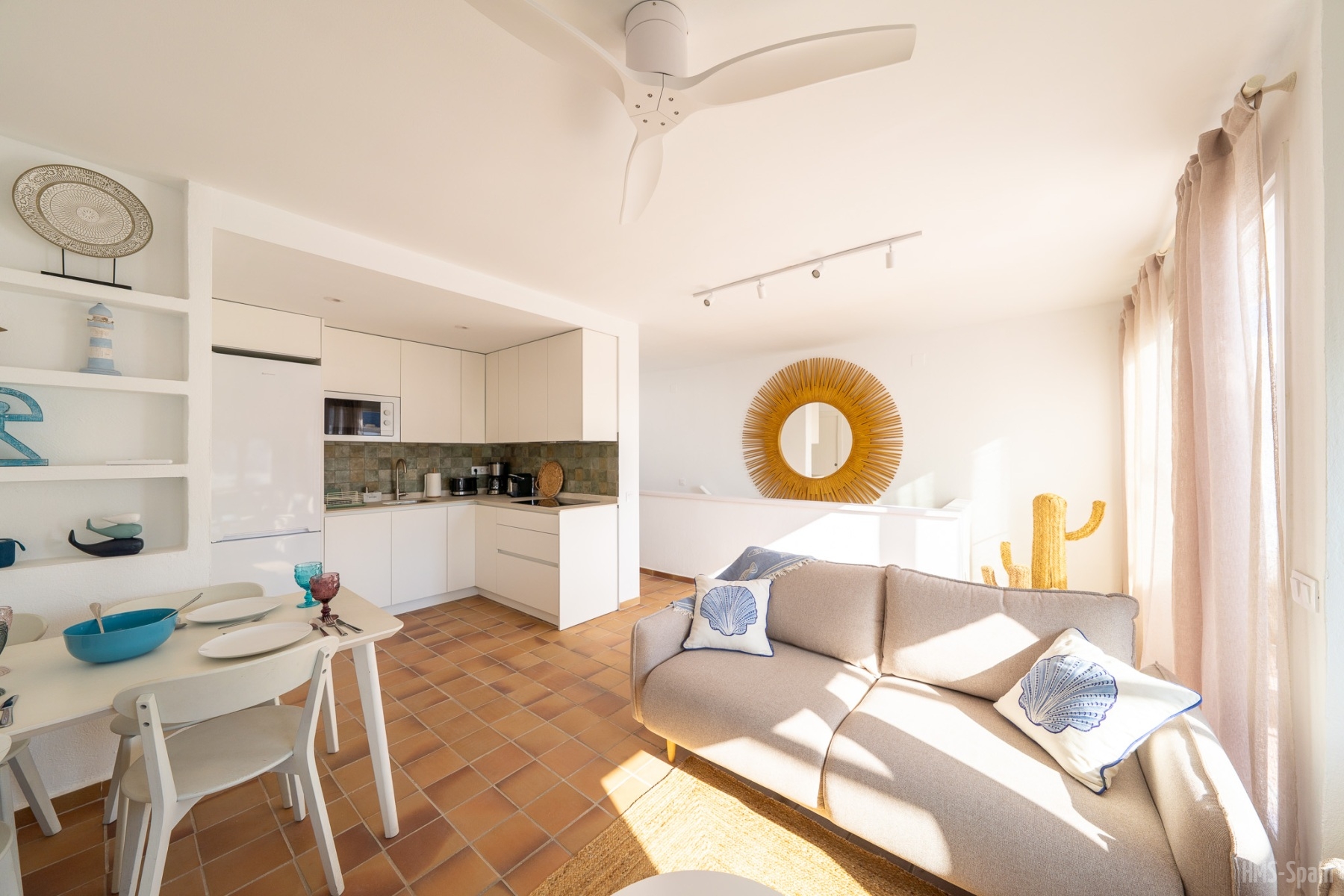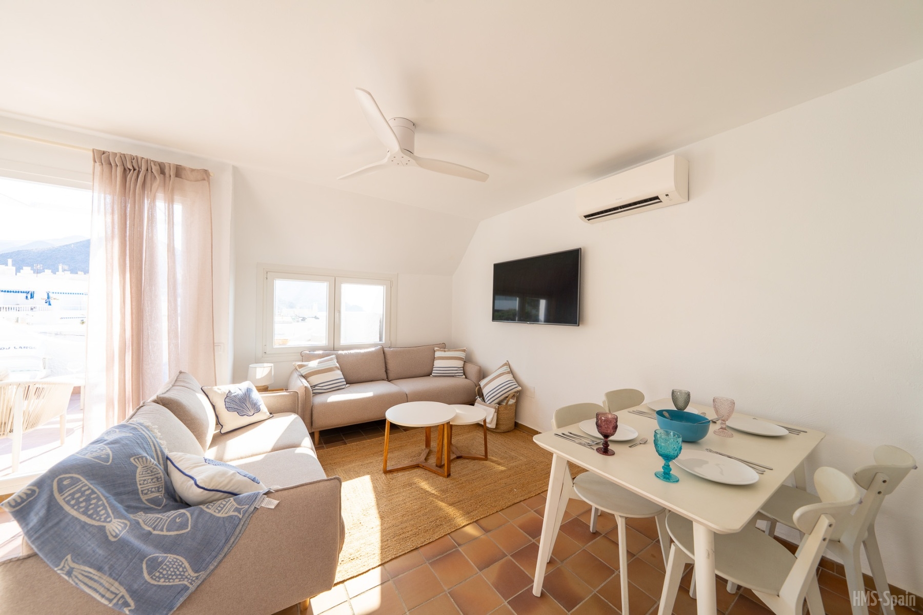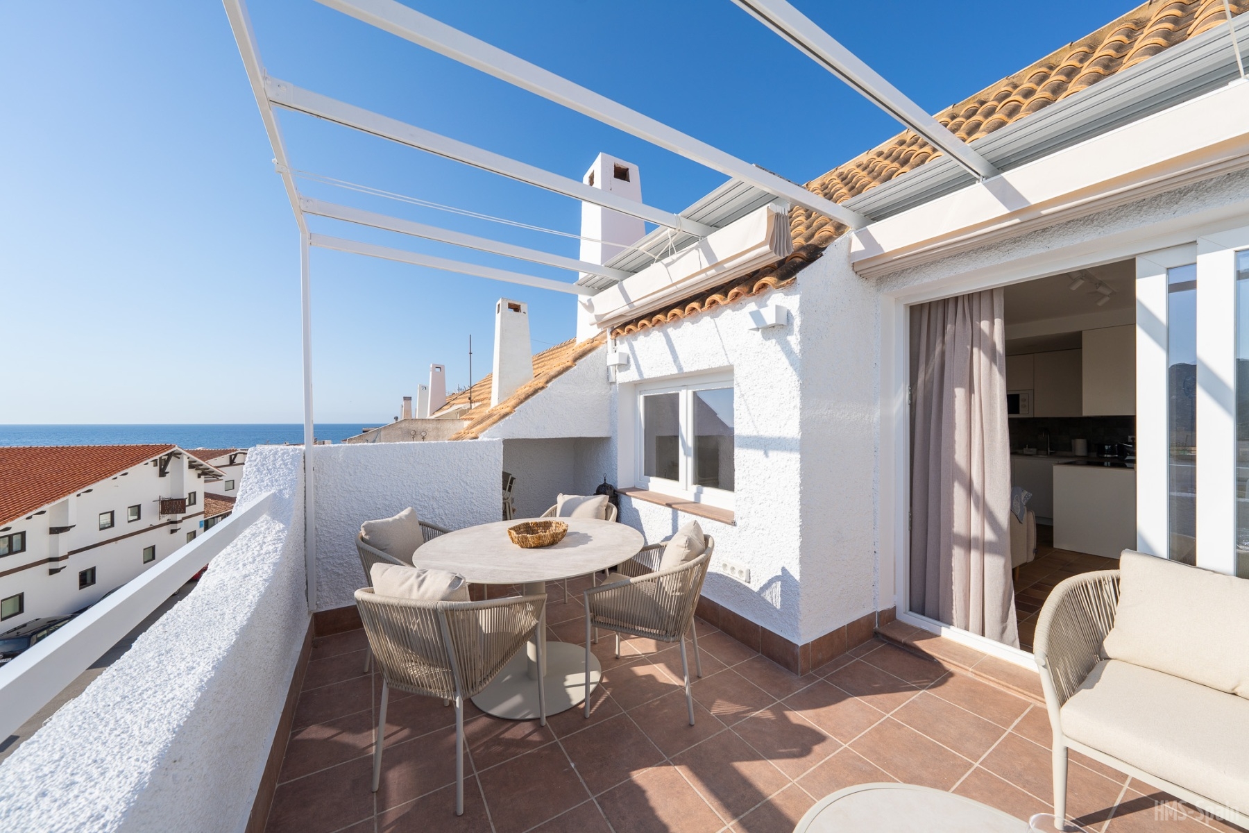 Fabuloso dúplex de dos dormitorios y dos baños ubicado en urbanización con piscina. Con capacidad para cuatro personas, dispone de cocina totalmente equipada, salón-comedor, dos dormitorios y amplia terraza equipada con mesas y sillas con vistas al mar. Aire acondicionado en todas las habitaciones y en el salón. wifi gratis