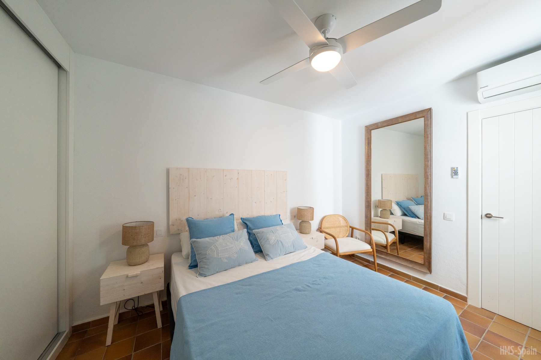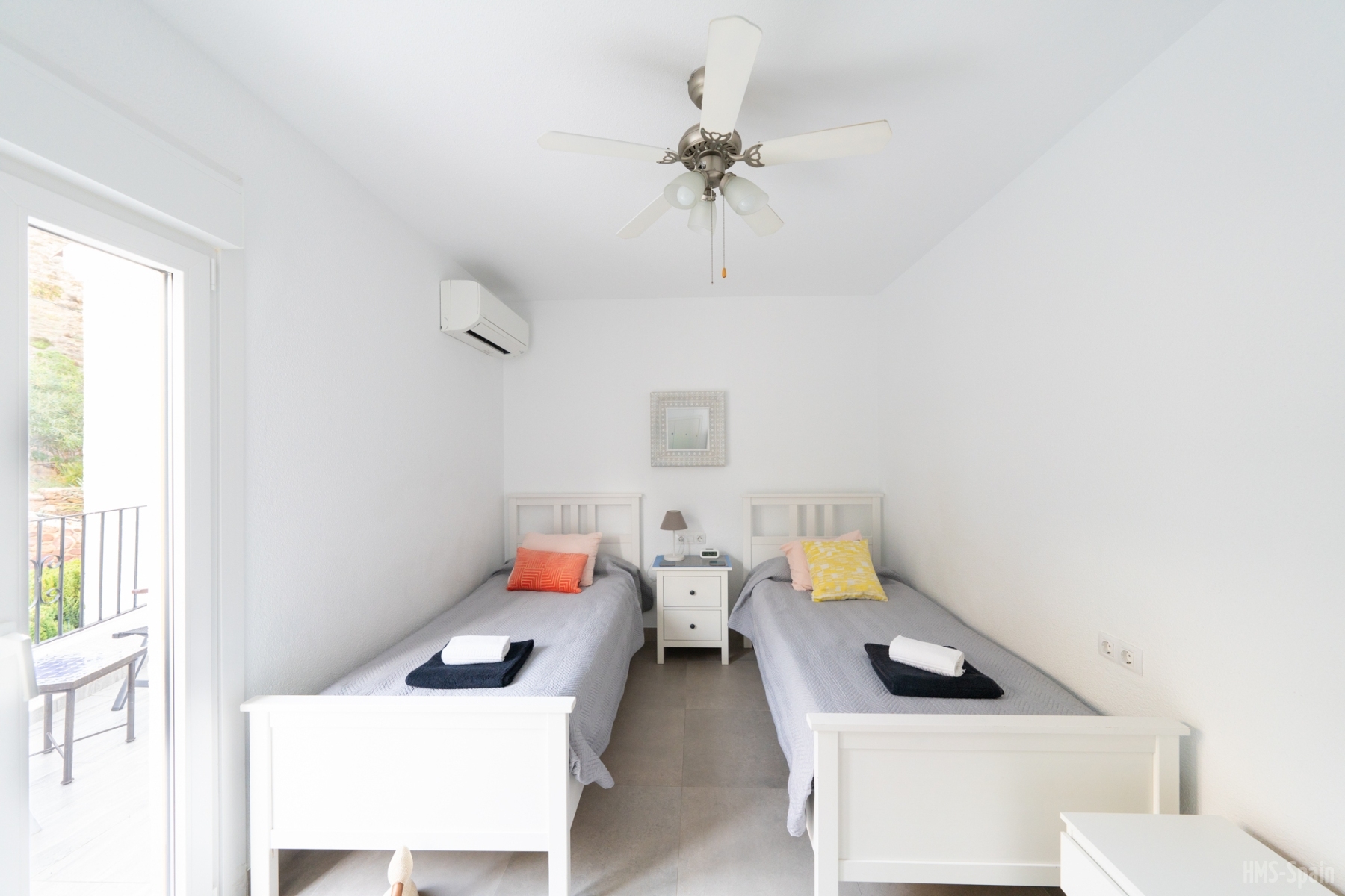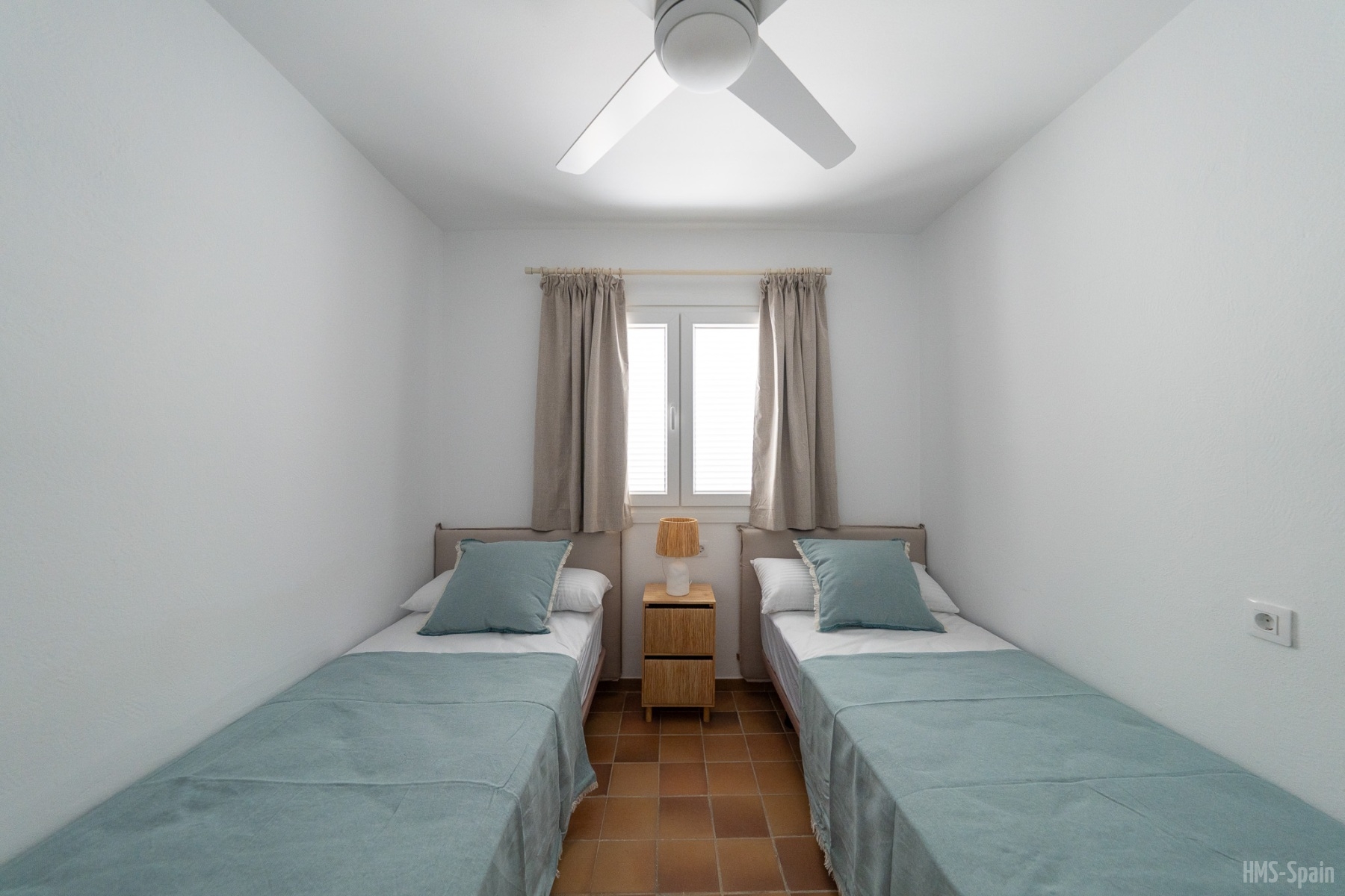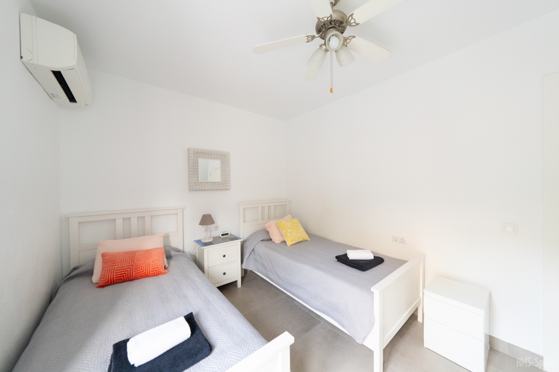 Cuenta con 2 habitaciones: una equipada con dos camas individuales de 90 cm, y otra con una cama de matrimonio de 150 cm, perfectas para familias o grupos pequeños. Todas las estancias disponen de aire acondicionado, garantizando el máximo confort durante todo el año.