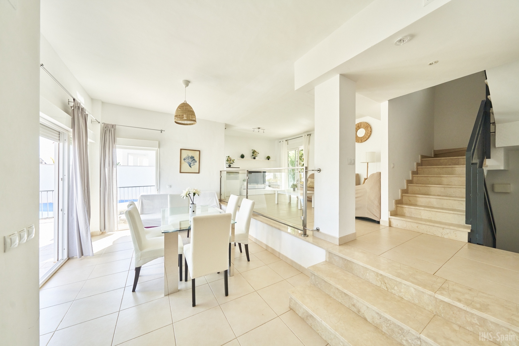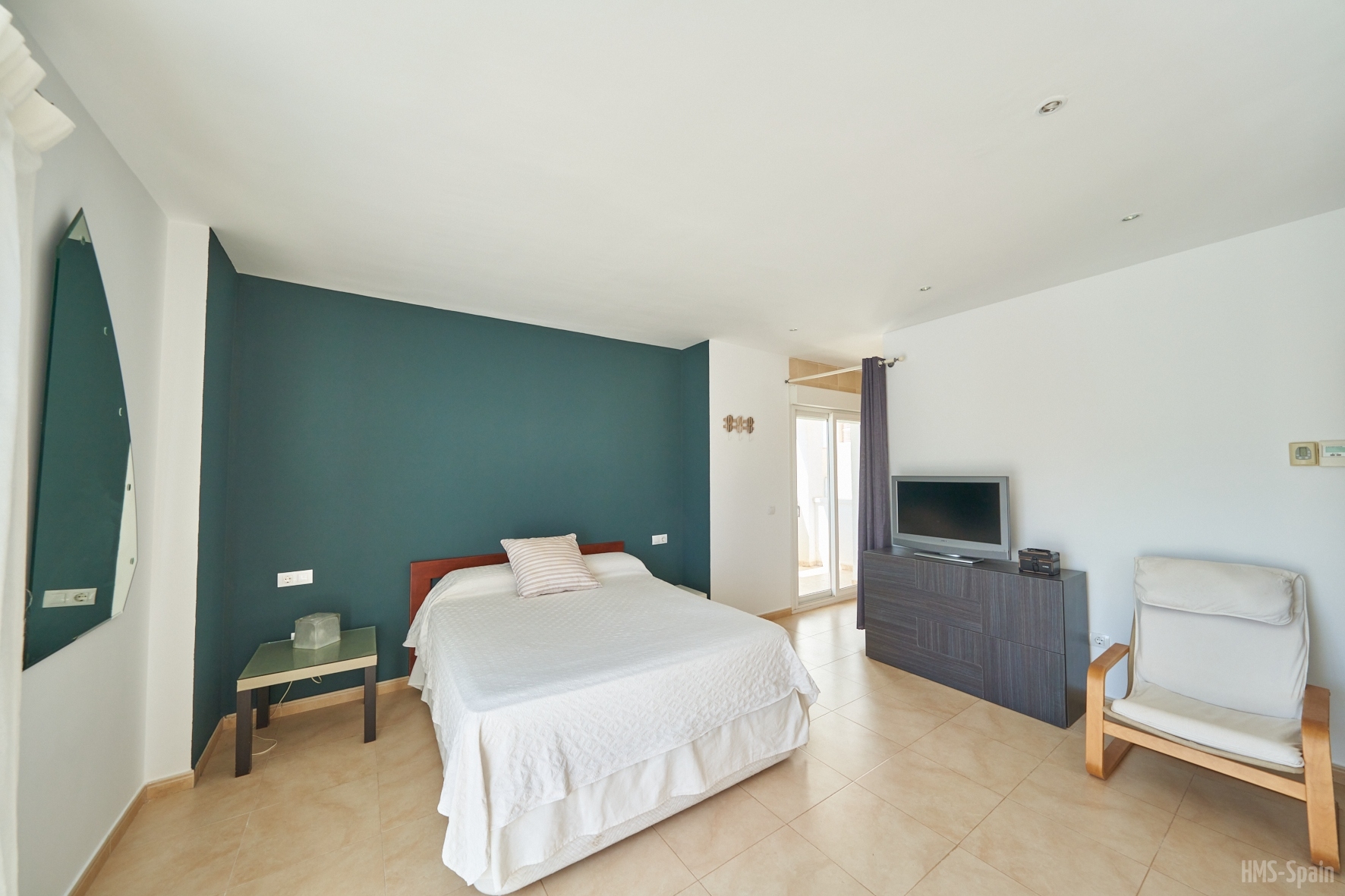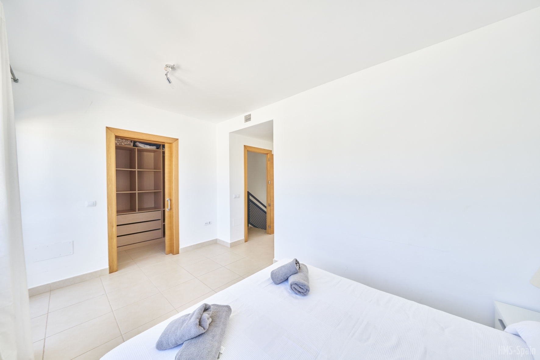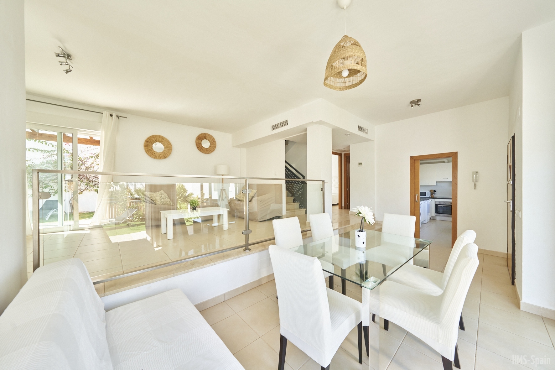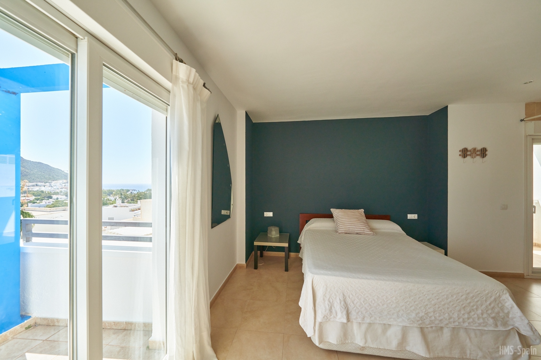 Magnifica vivienda con inmejorables vistas a toda la bahÃa de San José. Dispone de tres dormitorios con baños en Suite, un aseo en la planta principal, cocina totalmente equipada, terraza con muebles de exterior, garaje con capacidad para 3 coches y piscina comunitaria. Ideal para pasar unas fantásticas vacaciones en familia.