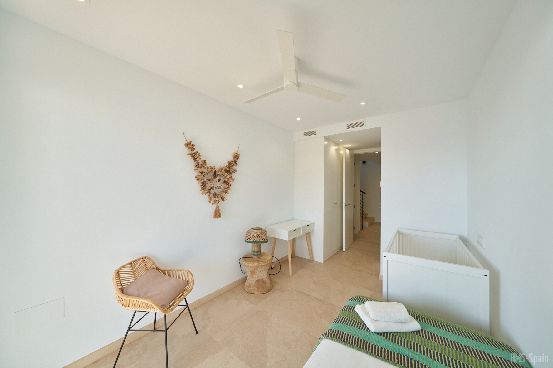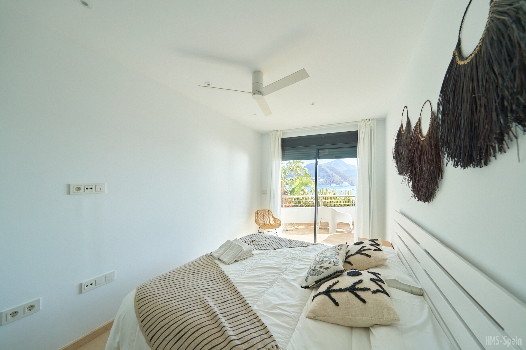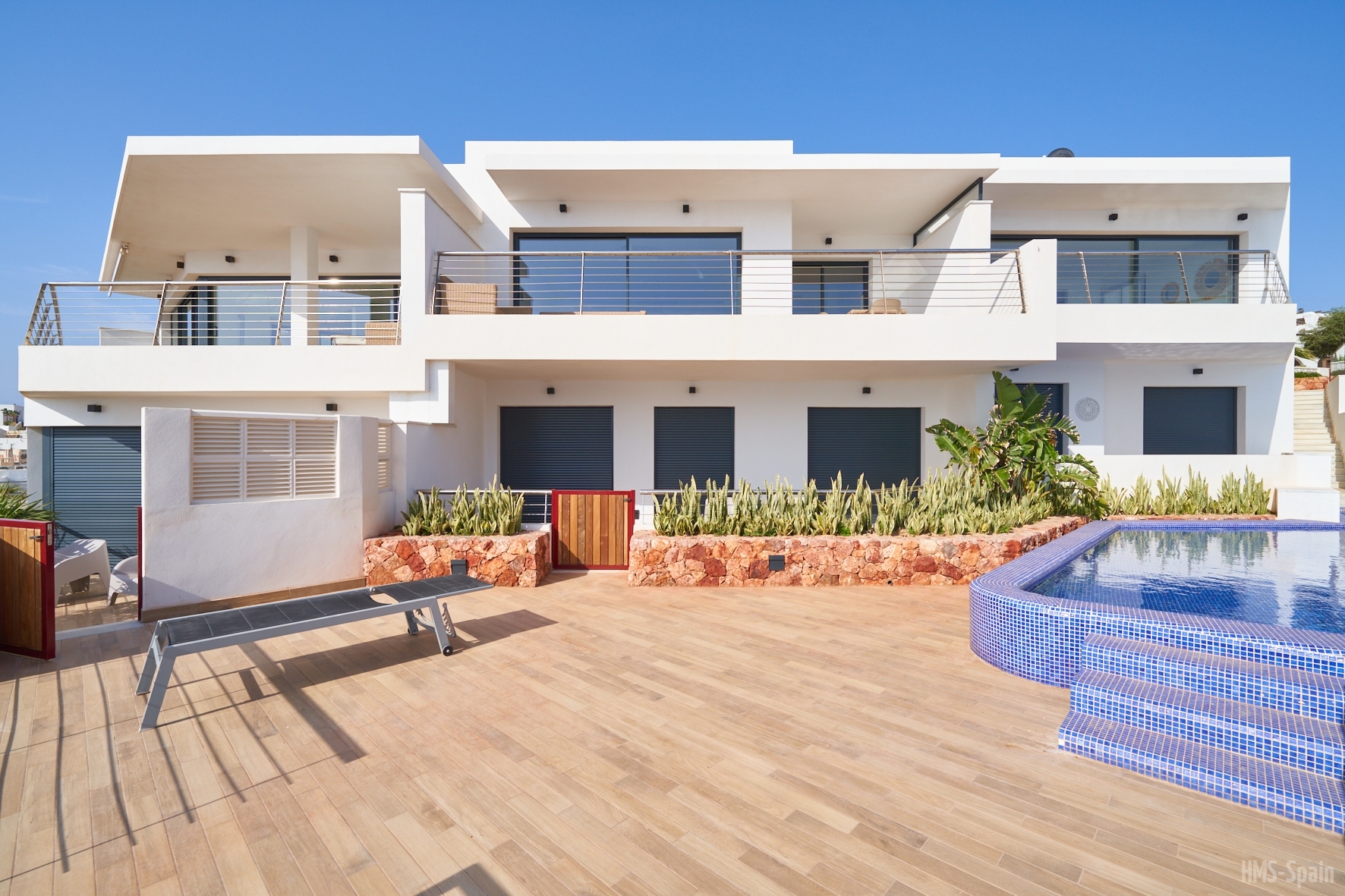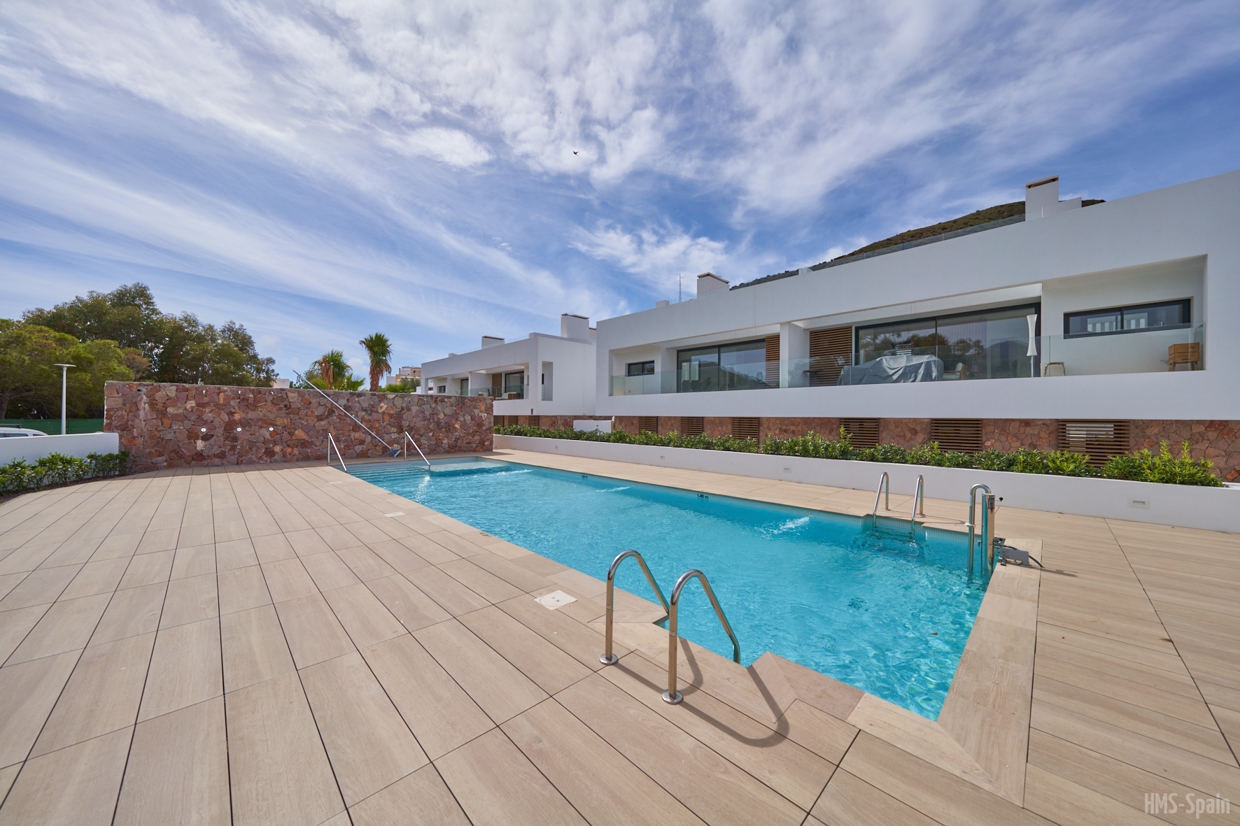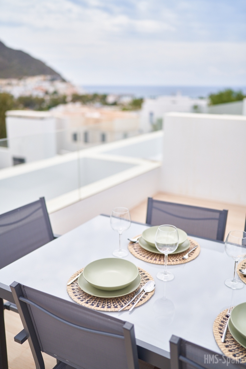 Magnifica vivienda con inmejorables vistas a toda la bahÃa de San José. Dispone de tres dormitorios con baños en Suite, un aseo en la planta principal, cocina totalmente equipada, terraza con muebles de exterior, garaje con capacidad para 3 coches y piscina comunitaria. Ideal para pasar unas fantásticas vacaciones en familia.