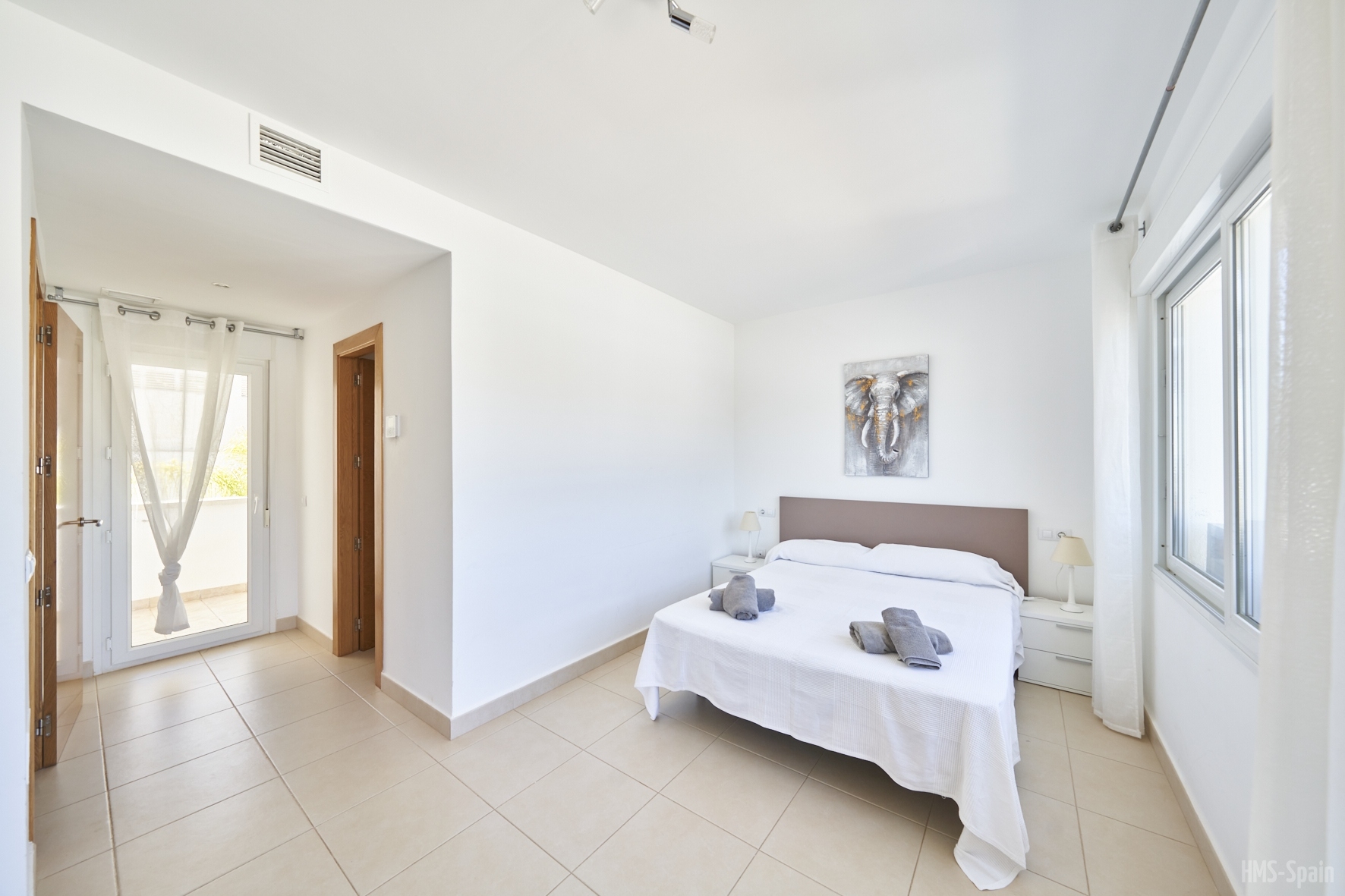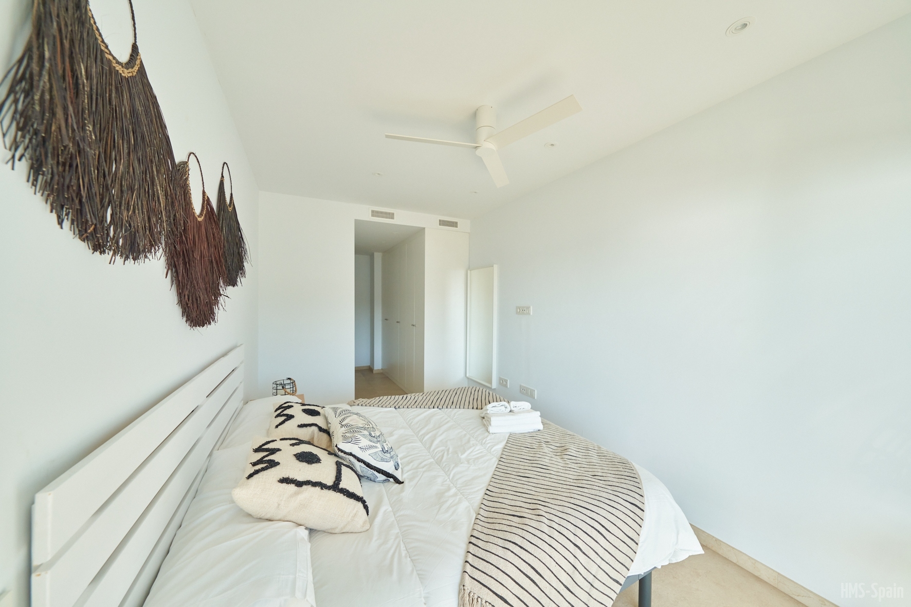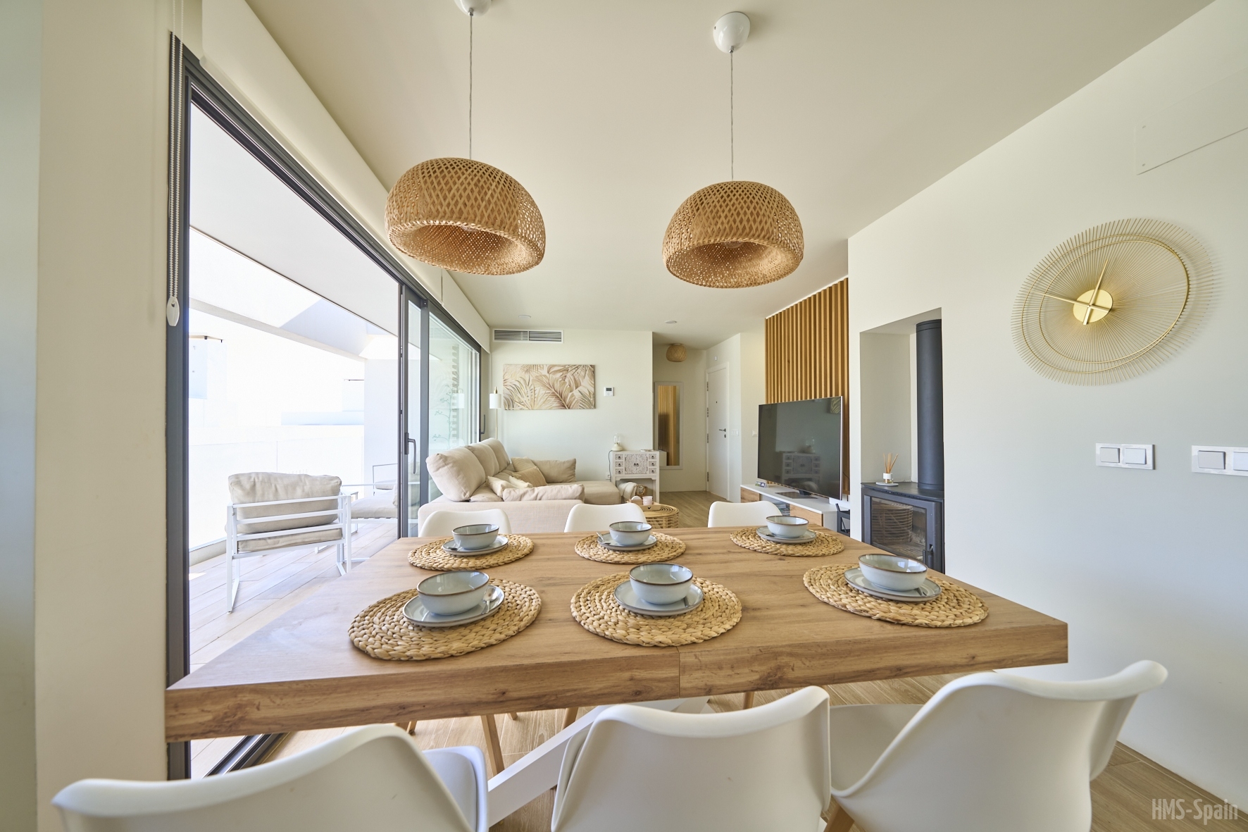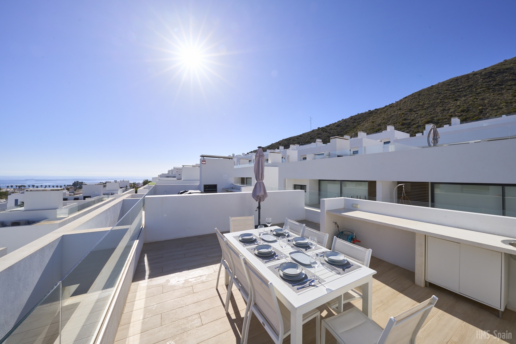 Magnifica vivienda con inmejorables vistas a toda la bahÃa de San José. Dispone de tres dormitorios con baños en Suite, un aseo en la planta principal, cocina totalmente equipada, terraza con muebles de exterior, garaje con capacidad para 3 coches y piscina comunitaria. Ideal para pasar unas fantásticas vacaciones en familia.