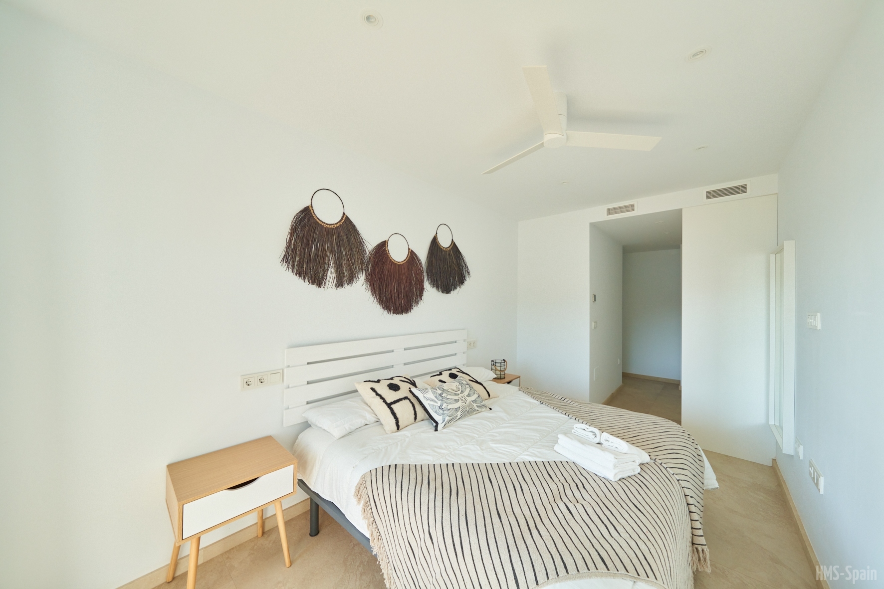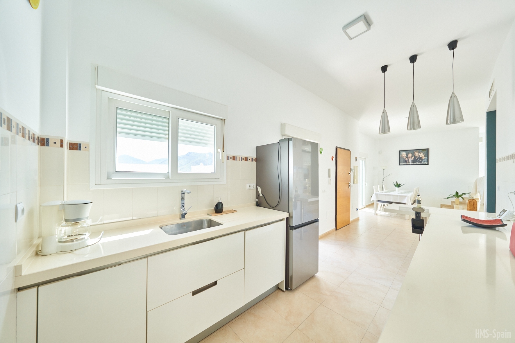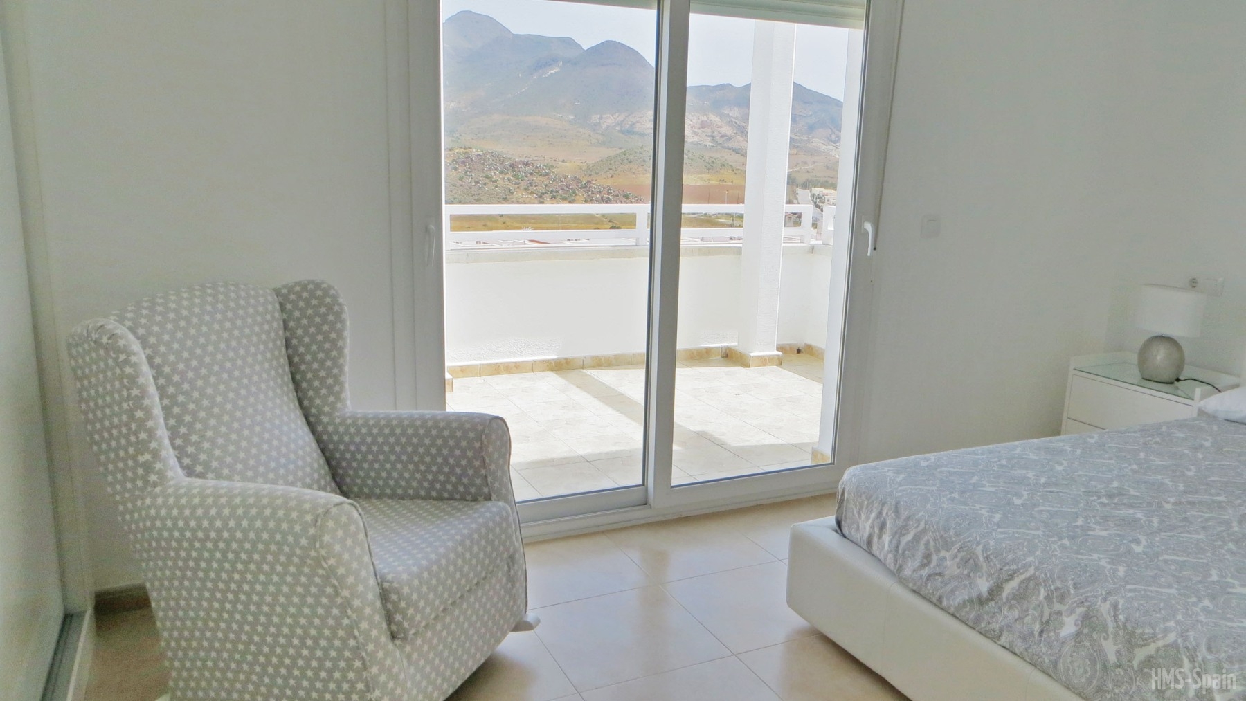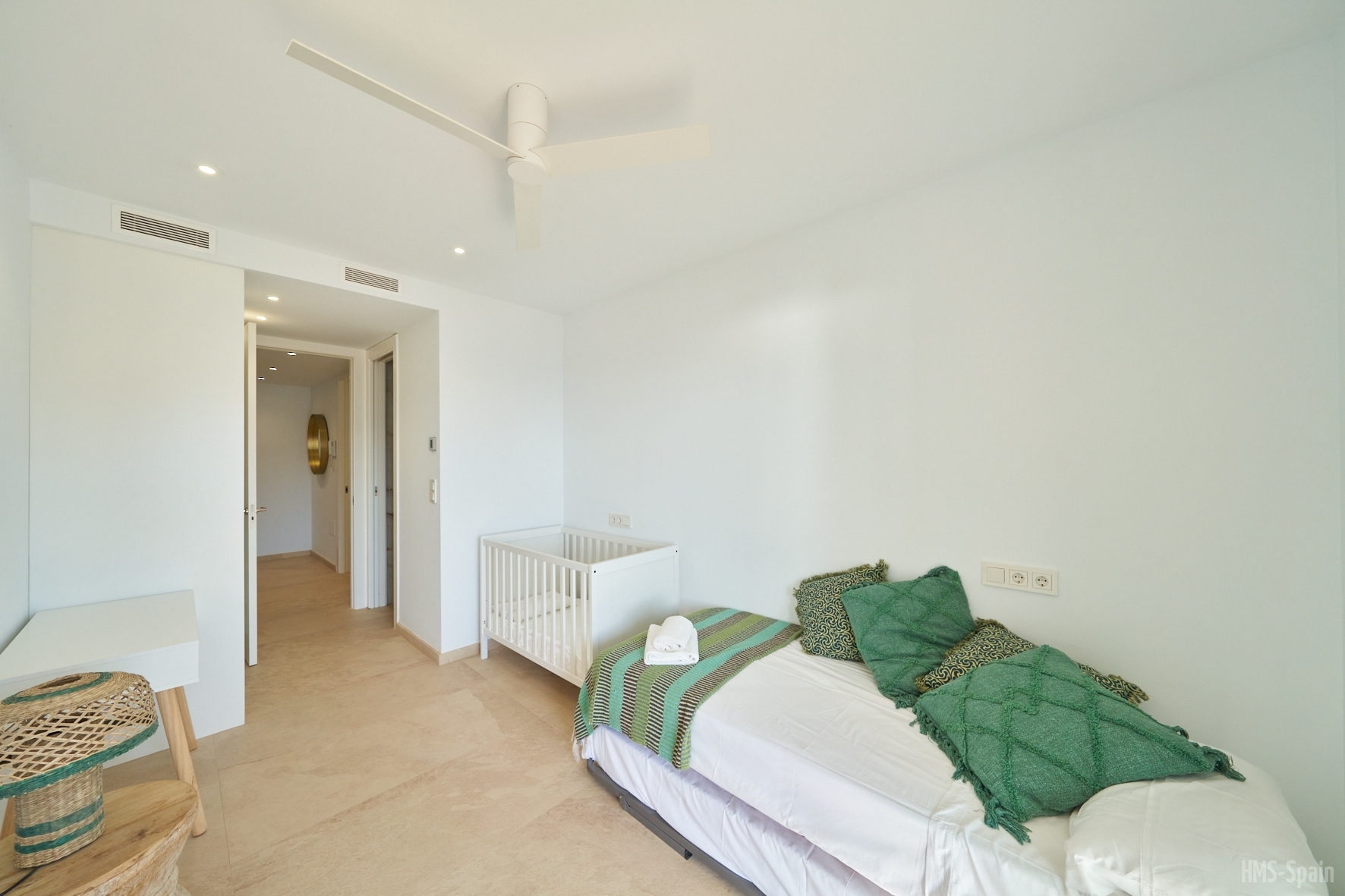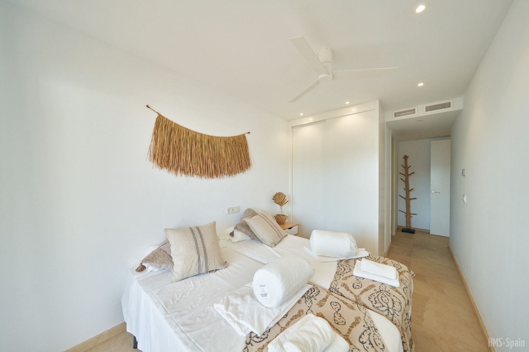 Magnifica vivienda con inmejorables vistas a toda la bahÃa de San José. Dispone de tres dormitorios con baños en Suite, un aseo en la planta principal, cocina totalmente equipada, terraza con muebles de exterior, garaje con capacidad para 3 coches y piscina comunitaria. Ideal para pasar unas fantásticas vacaciones en familia.