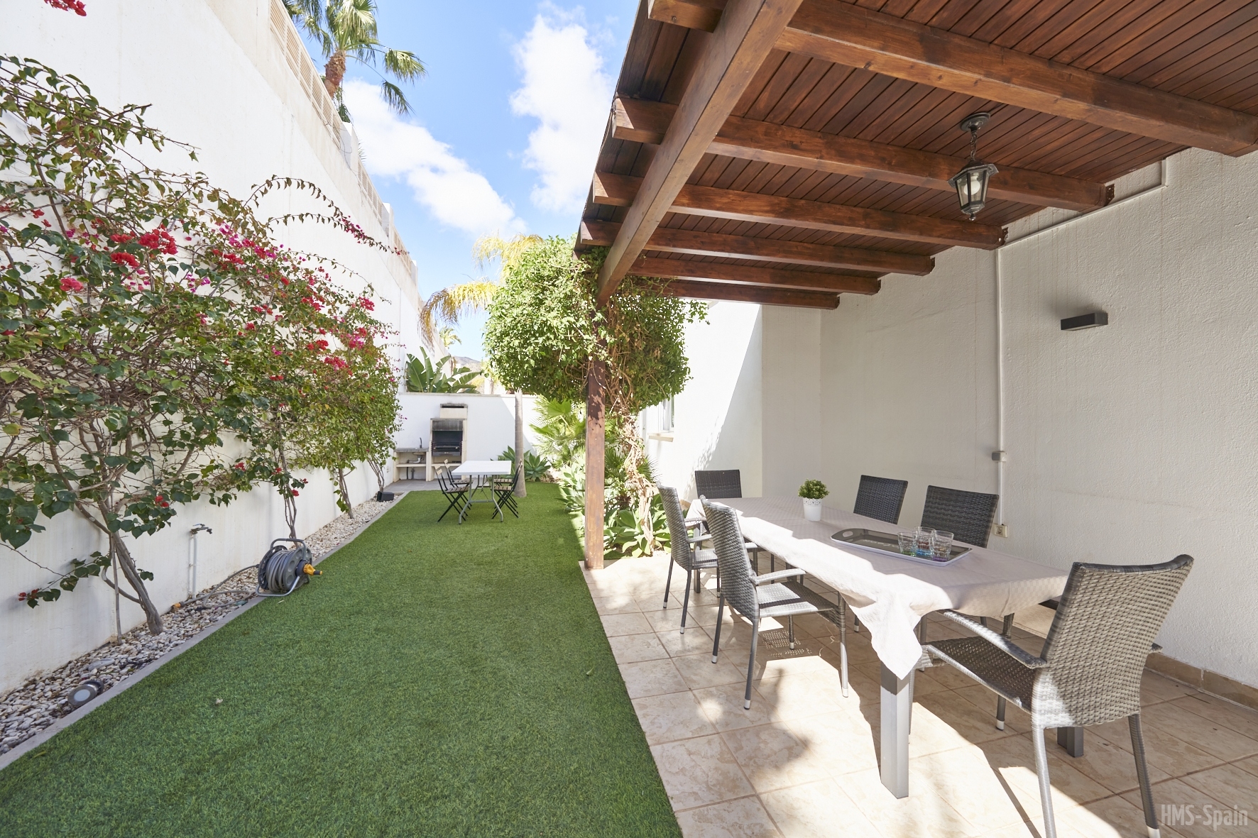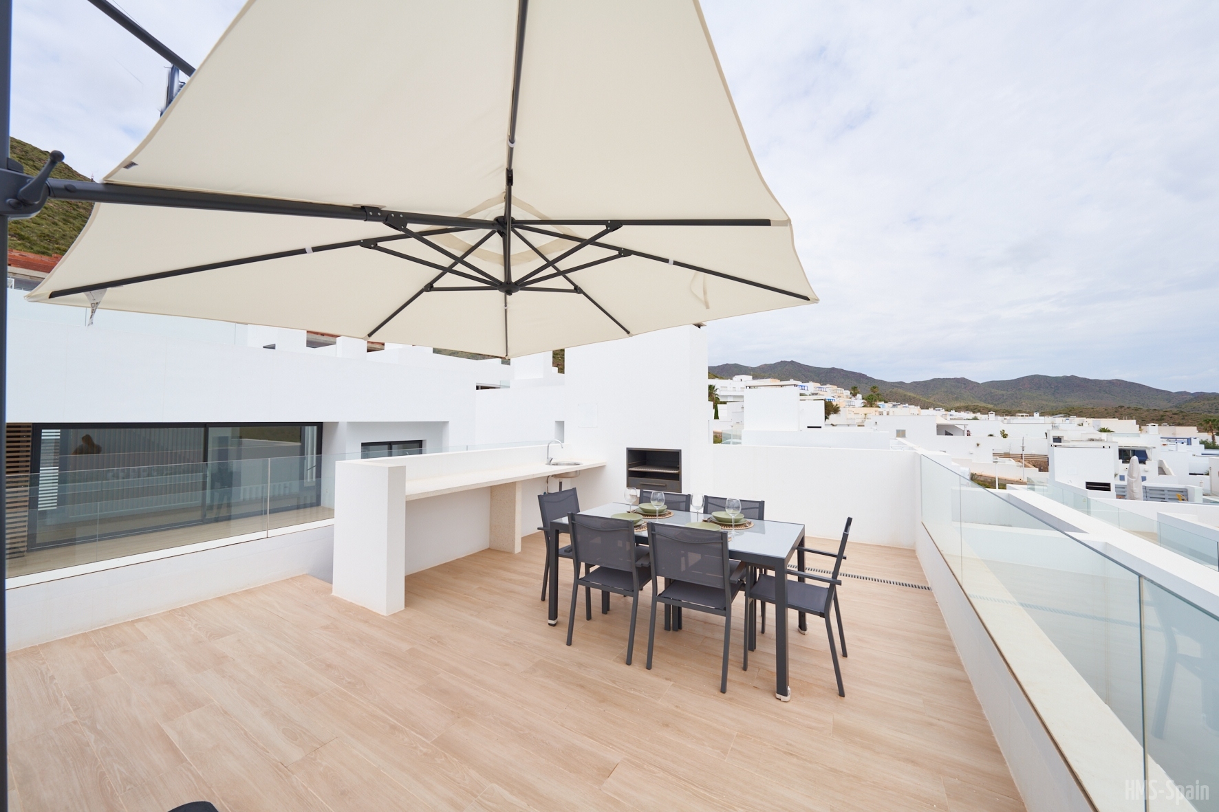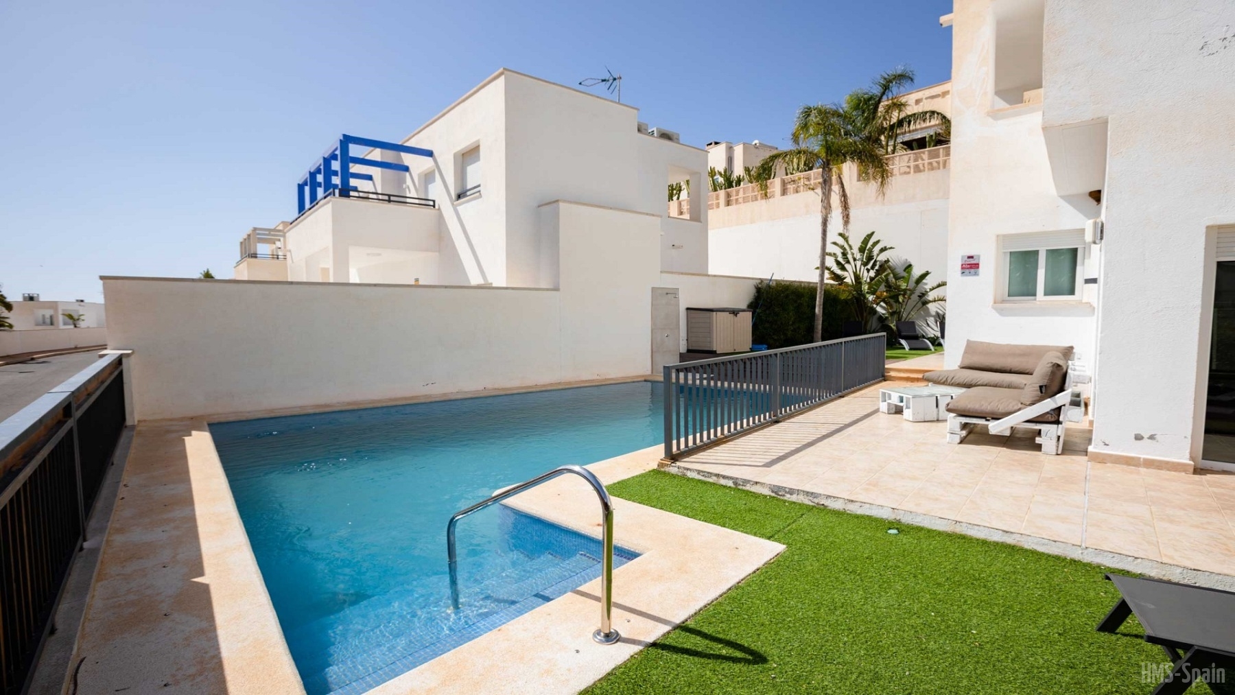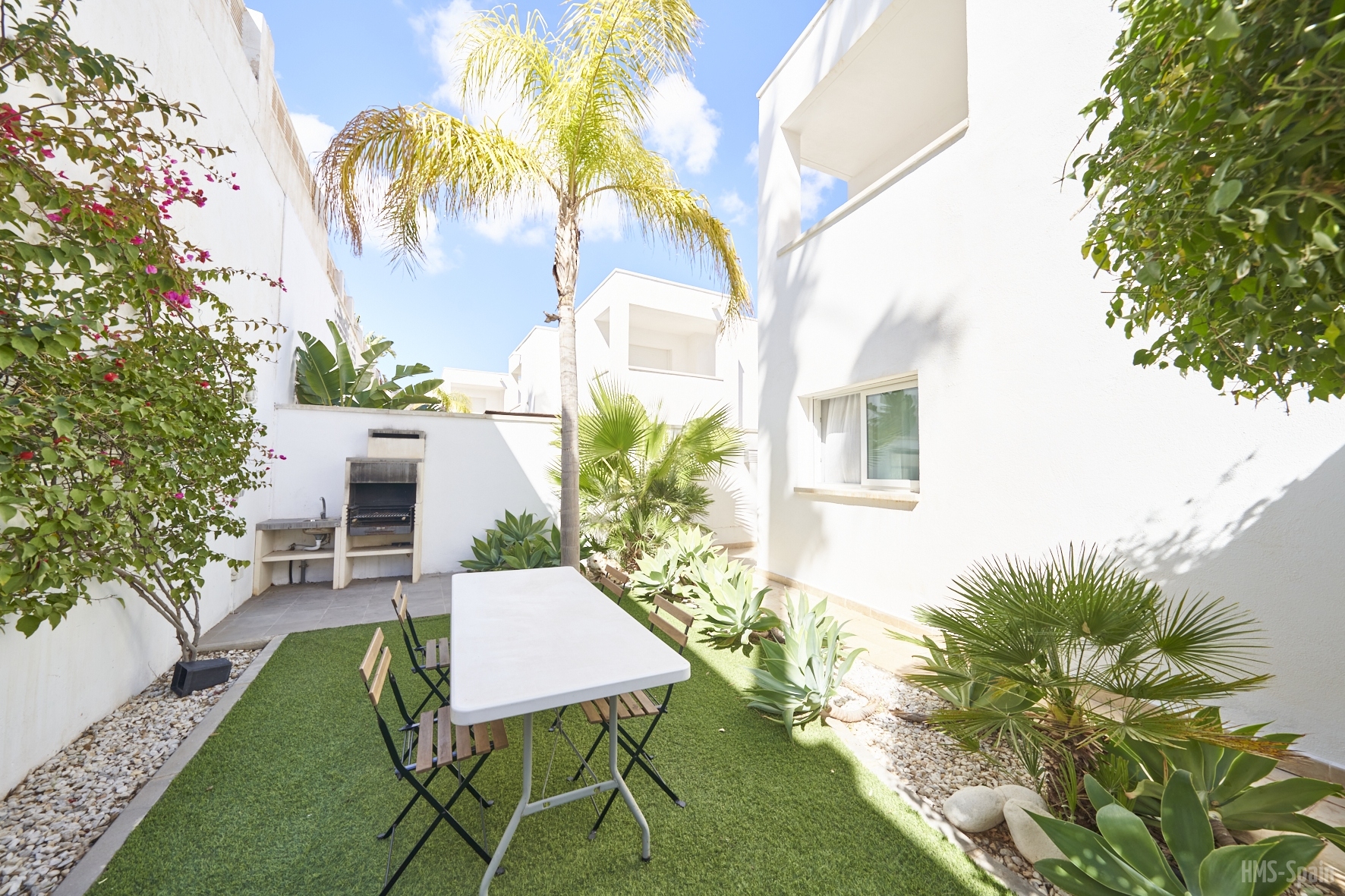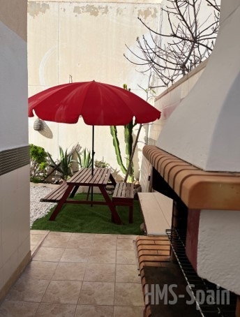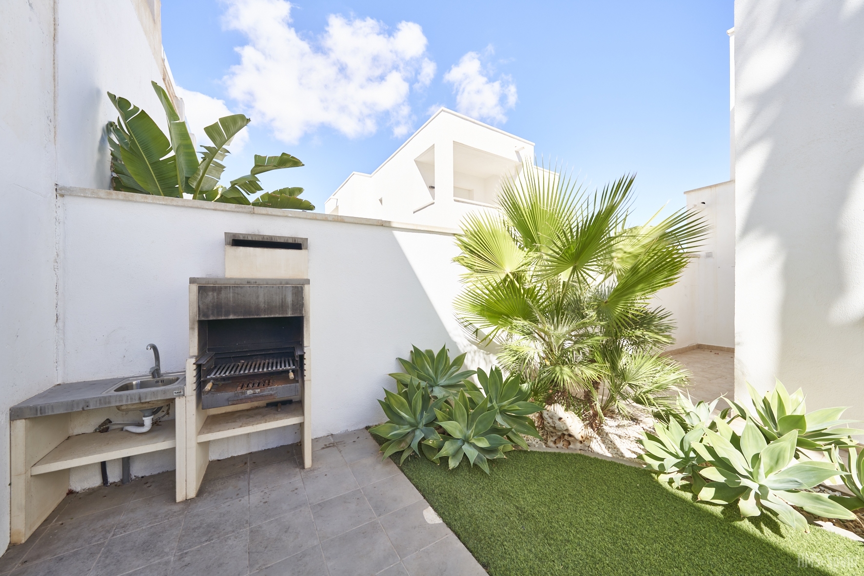 Distribución de la casa: en la planta primera esta la cocina salón comedor con terraza y aseo. En la planta baja están los tres dormitorios (suite con cama de matrimonio y baño completo privado, segunda habitación con cama de matrimonio o dos camas individuales, y tercera habitación con una litera, cuenta con un baño completo, las habitaciones dan a una terraza amplia con un mini jardÃn. En la planta cubierta hay un solárium con barbacoa.