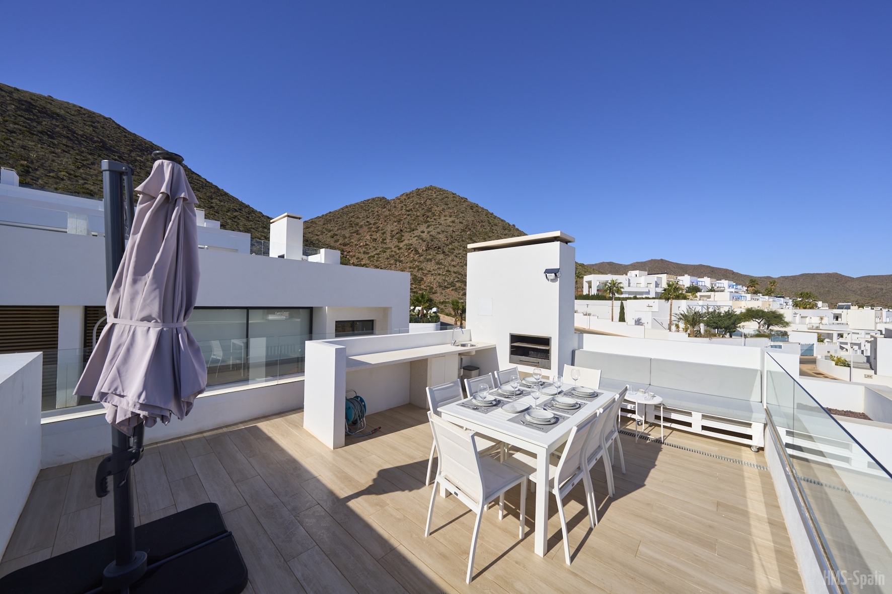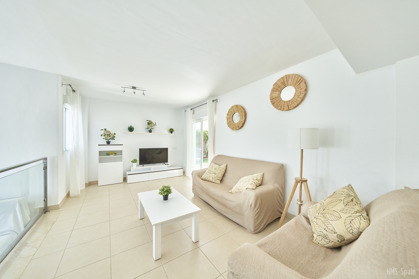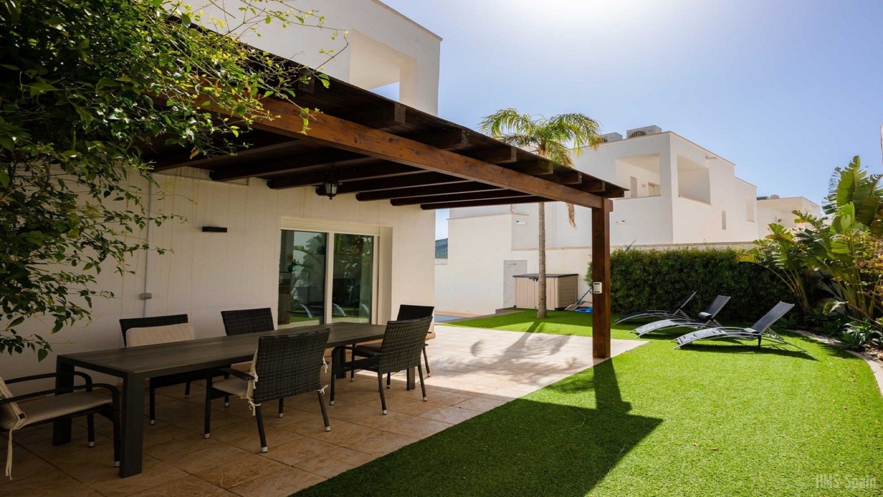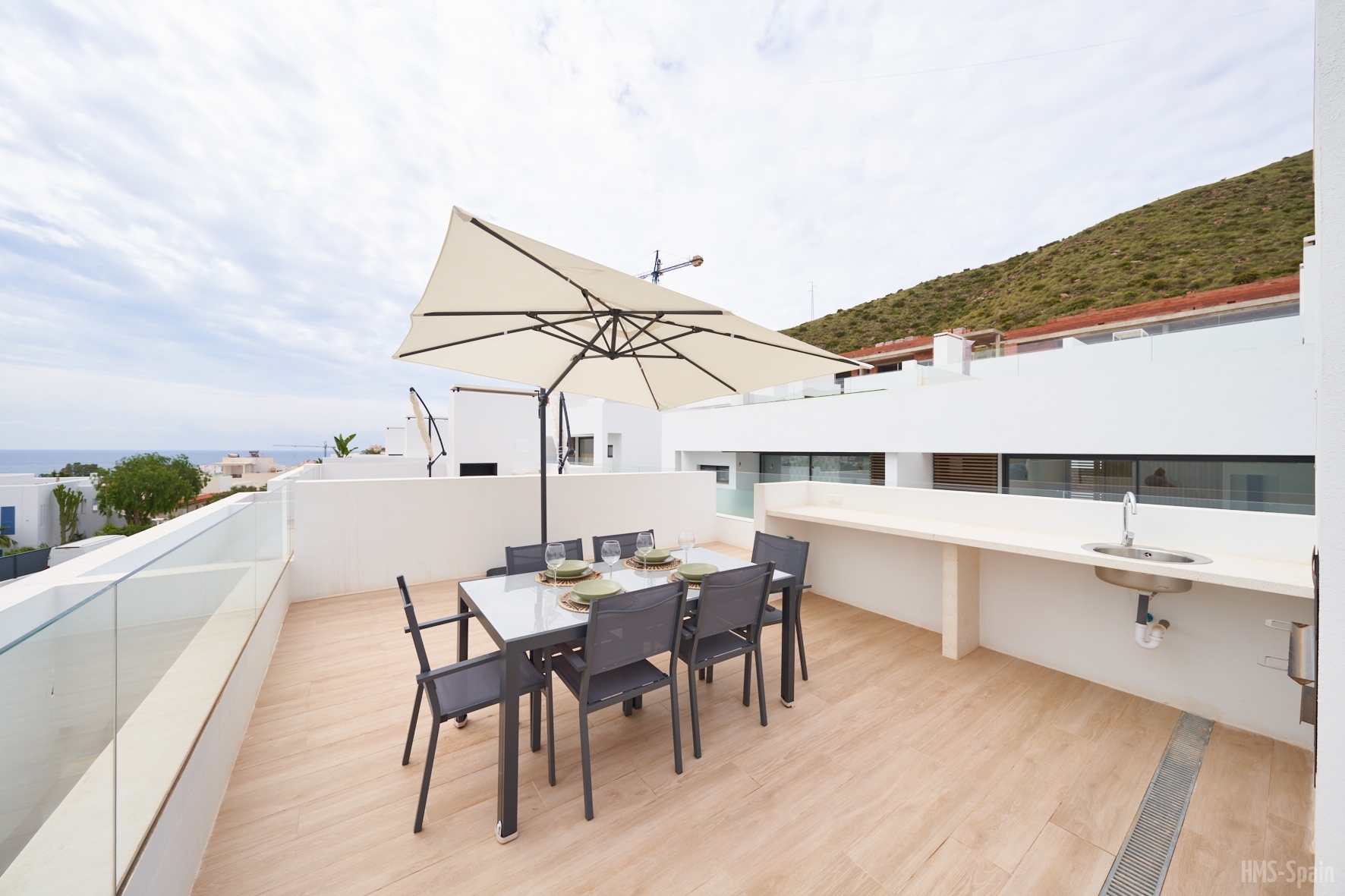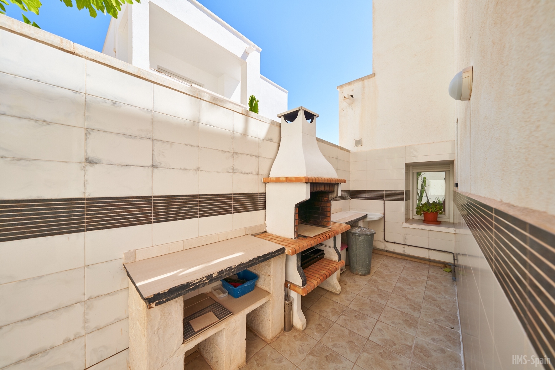 Distribución de la casa: en la planta primera esta la cocina salón comedor con terraza y aseo. En la planta baja están los tres dormitorios (suite con cama de matrimonio y baño completo privado, segunda habitación con cama de matrimonio o dos camas individuales, y tercera habitación con una litera, cuenta con un baño completo, las habitaciones dan a una terraza amplia con un mini jardÃn. En la planta cubierta hay un solárium con barbacoa.
