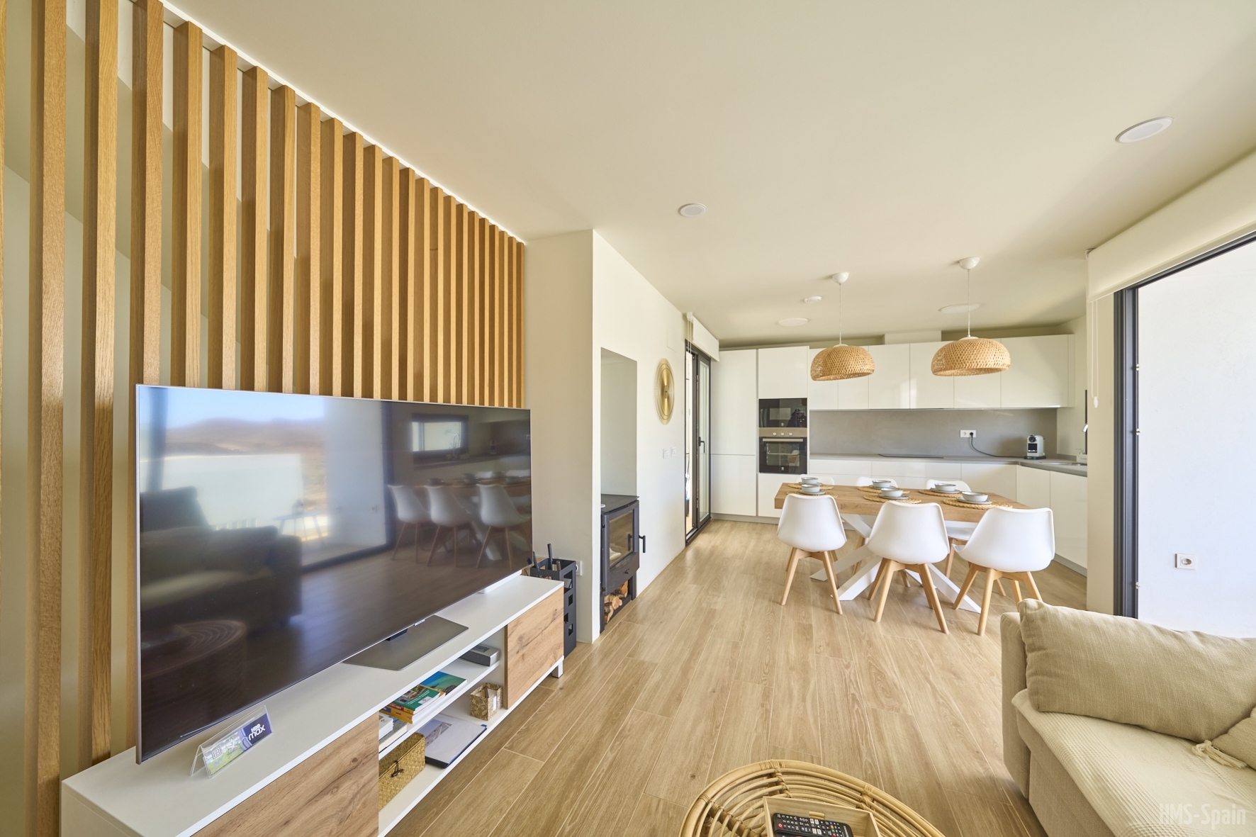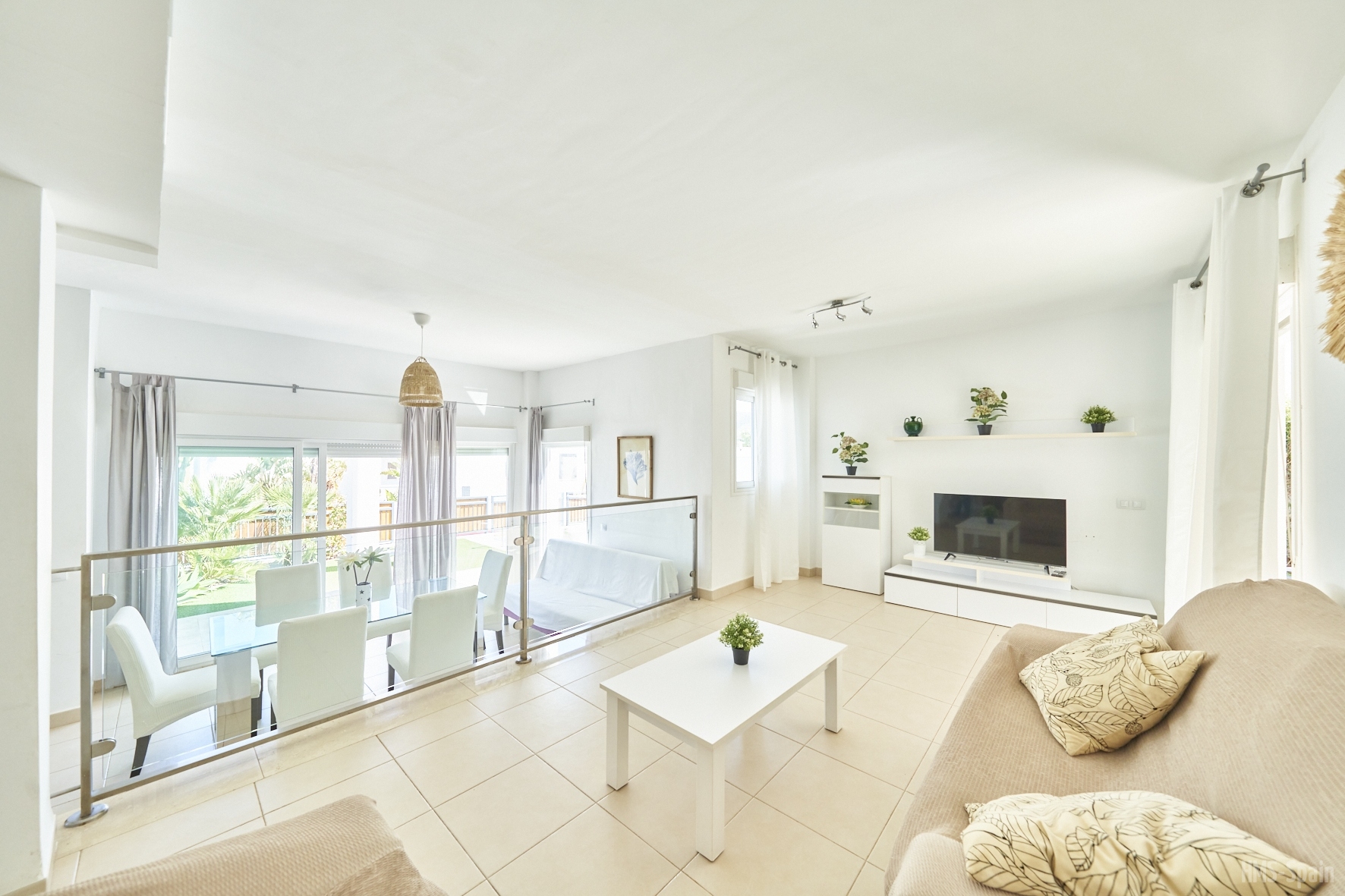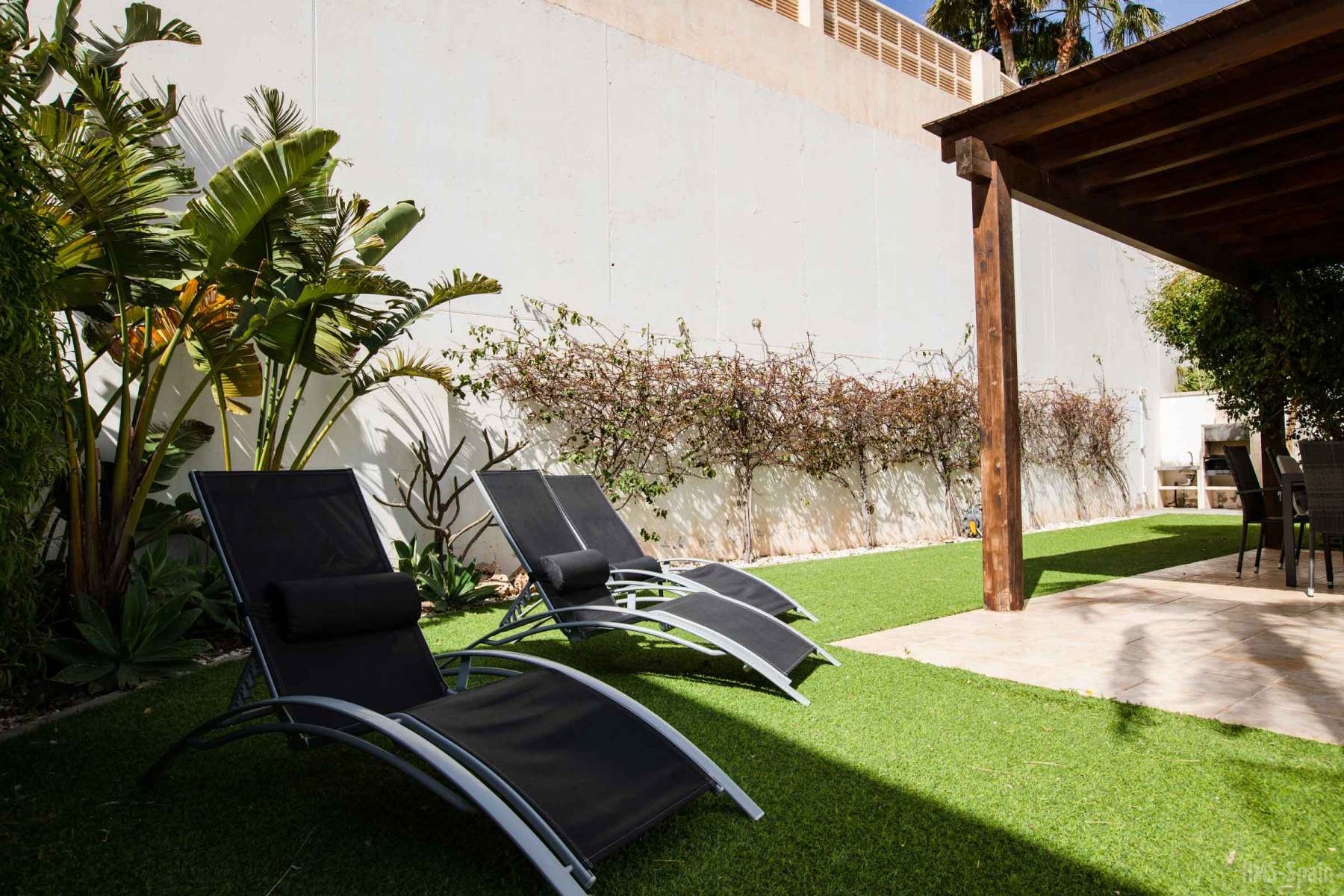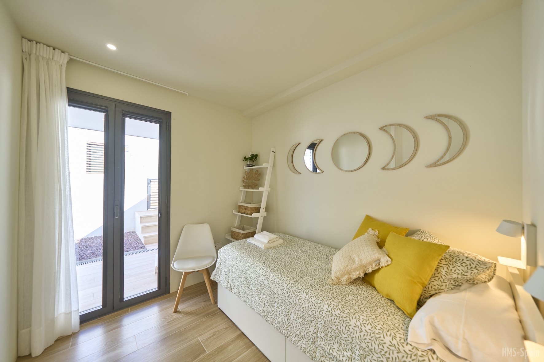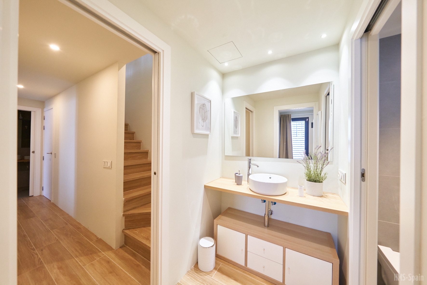Distribución de la casa: en la planta primera esta la cocina salón comedor con terraza y aseo. En la planta baja están los tres dormitorios (suite con cama de matrimonio y baño completo privado, segunda habitación con cama de matrimonio o dos camas individuales, y tercera habitación con una litera, cuenta con un baño completo, las habitaciones dan a una terraza amplia con un mini jardÃn. En la planta cubierta hay un solárium con barbacoa.