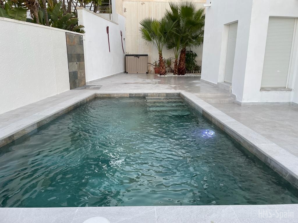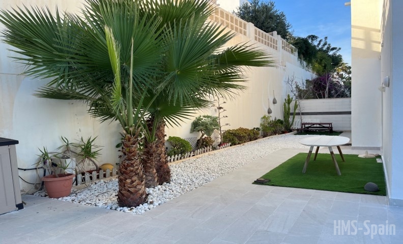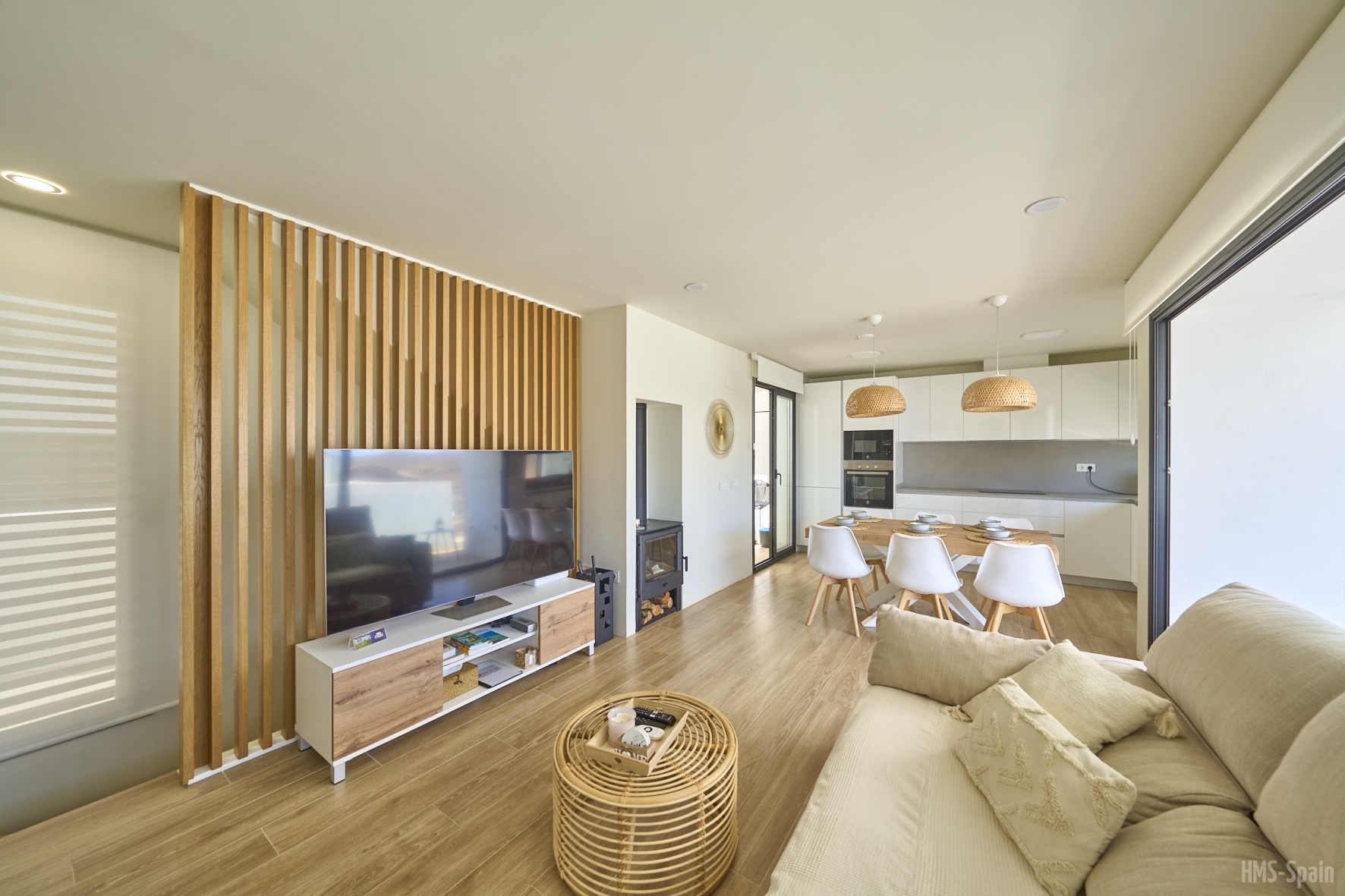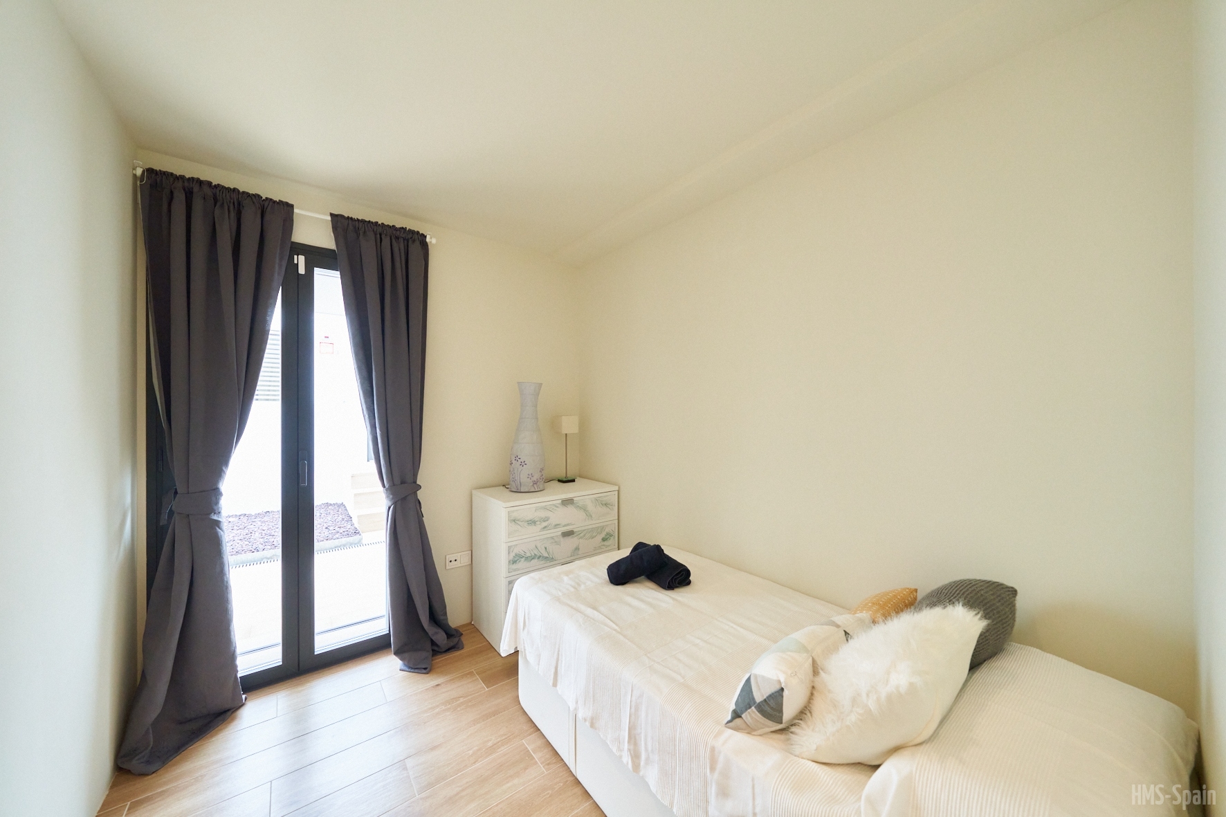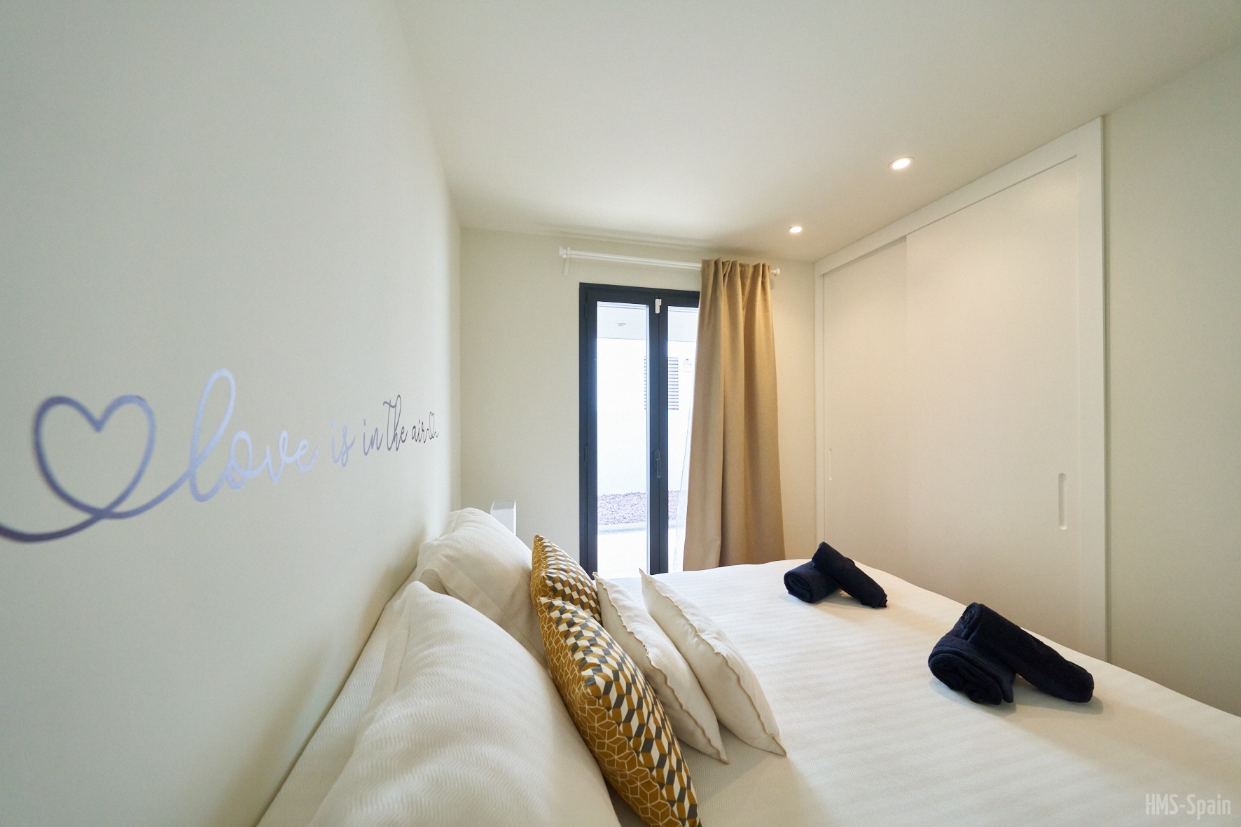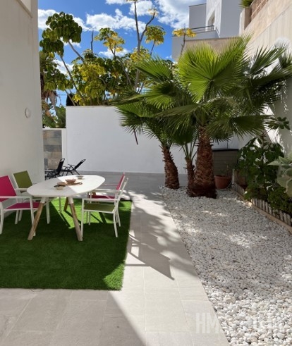 Distribución de la casa: en la planta primera esta la cocina salón comedor con terraza y aseo. En la planta baja están los tres dormitorios (suite con cama de matrimonio y baño completo privado, segunda habitación con cama de matrimonio o dos camas individuales, y tercera habitación con una litera, cuenta con un baño completo, las habitaciones dan a una terraza amplia con un mini jardÃn. En la planta cubierta hay un solárium con barbacoa.