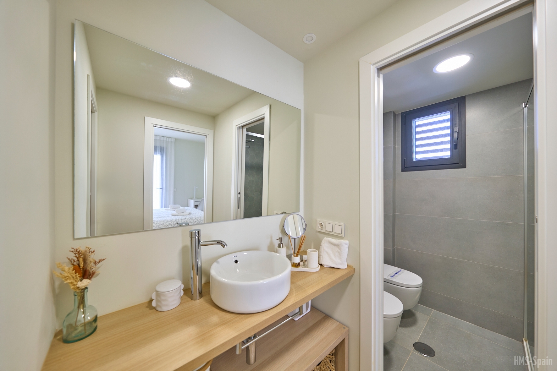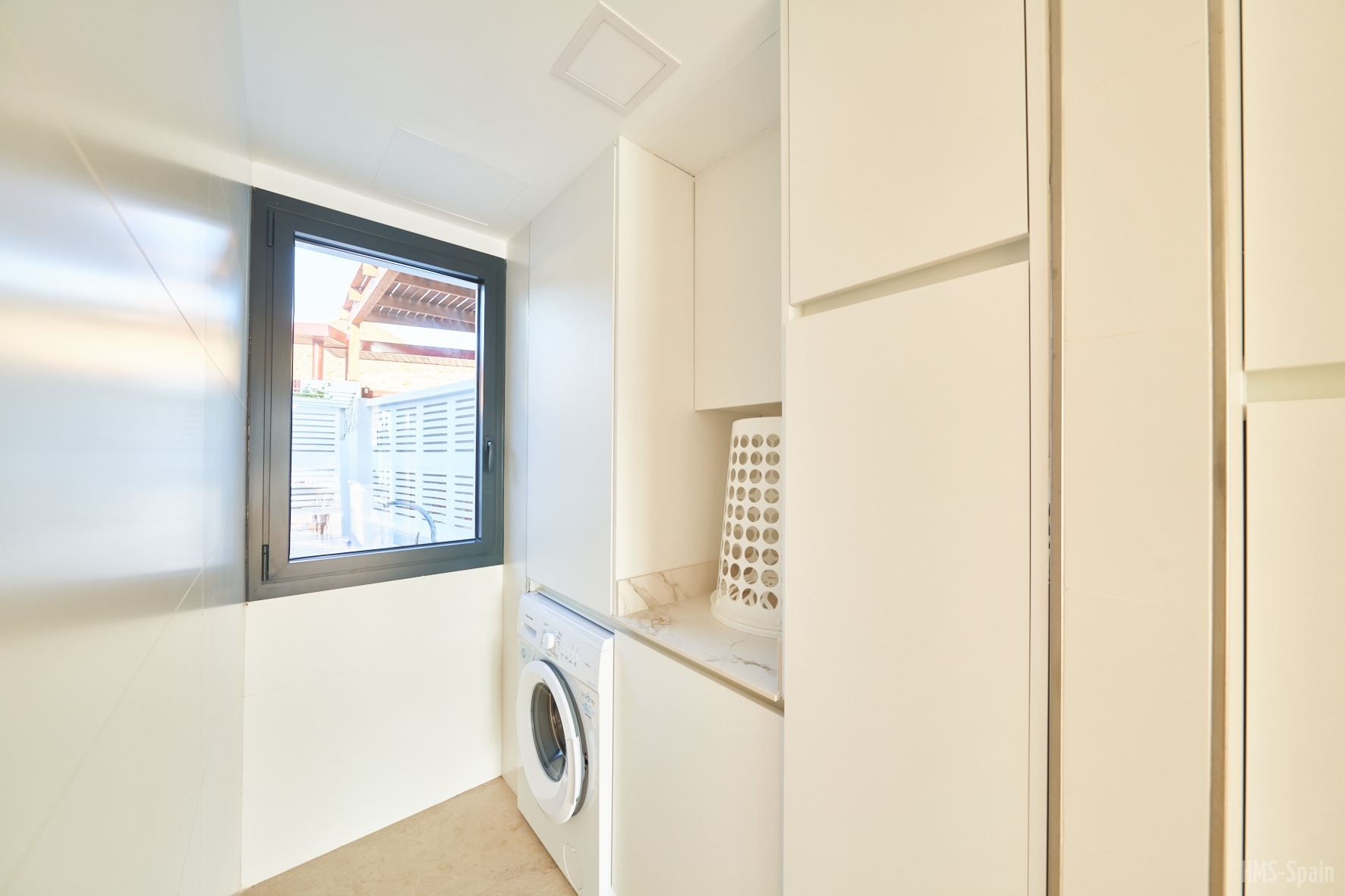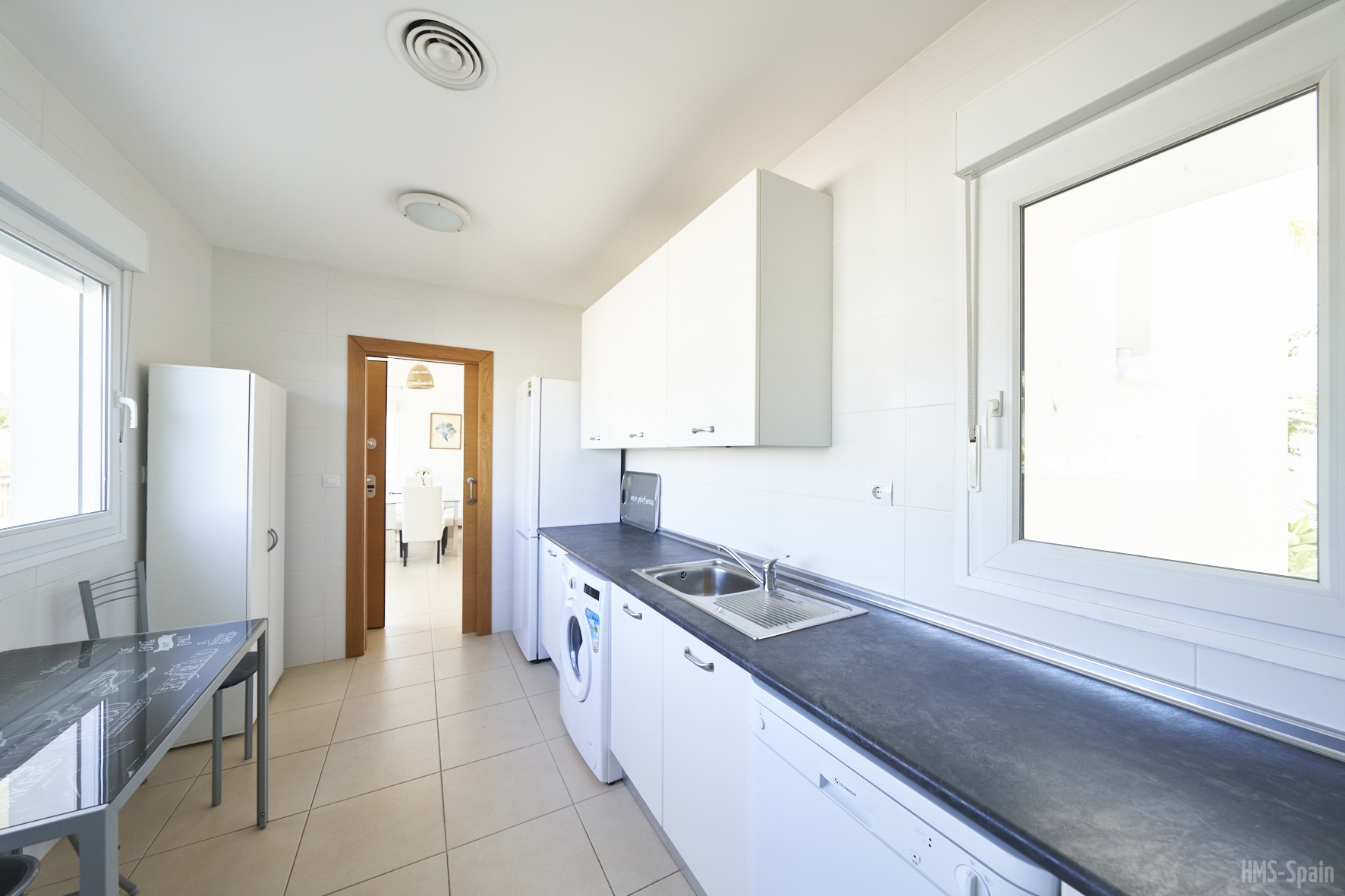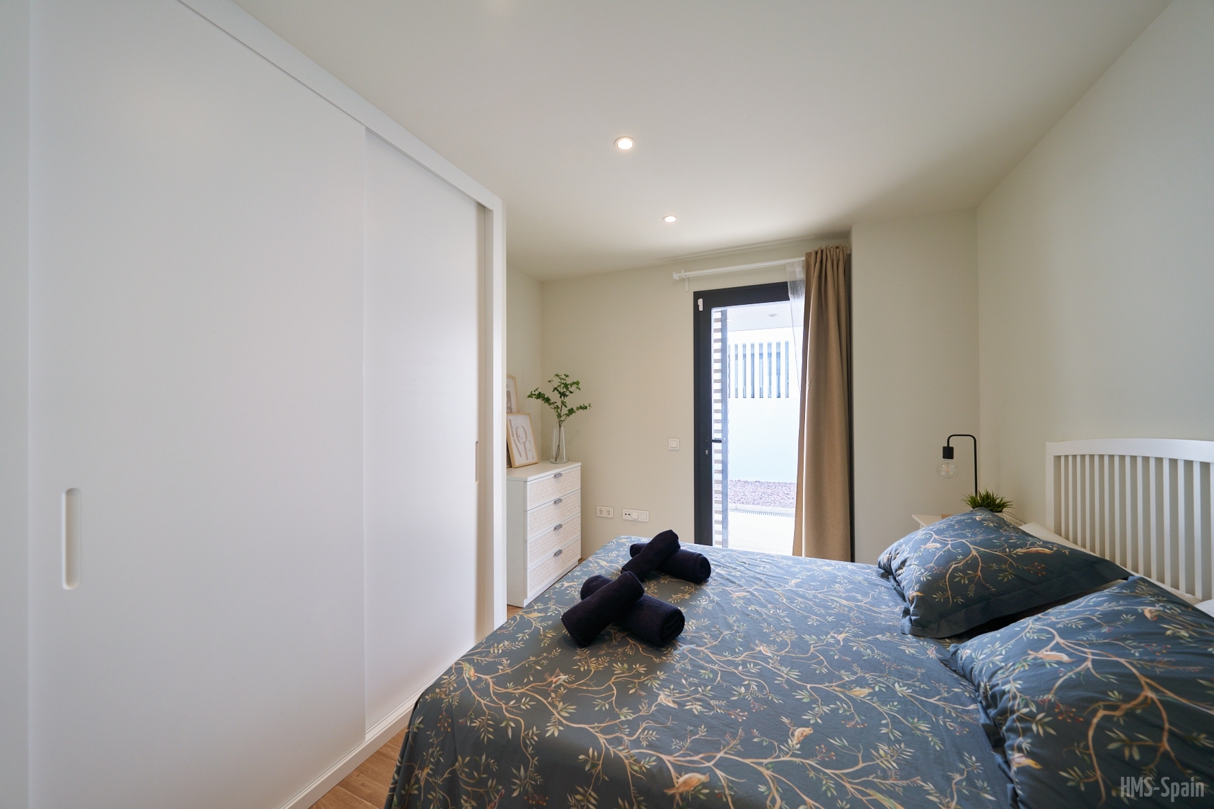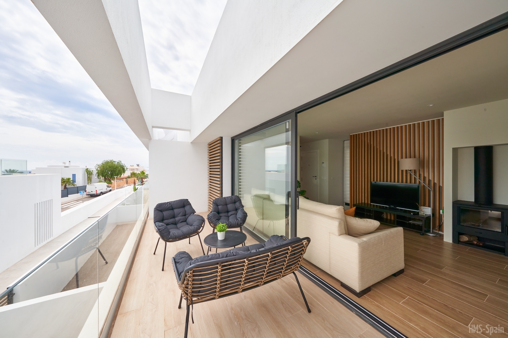 Distribución de la casa: en la planta primera esta la cocina salón comedor con terraza y aseo. En la planta baja están los tres dormitorios (suite con cama de matrimonio y baño completo privado, segunda habitación con cama de matrimonio o dos camas individuales, y tercera habitación con una litera, cuenta con un baño completo, las habitaciones dan a una terraza amplia con un mini jardÃn. En la planta cubierta hay un solárium con barbacoa.