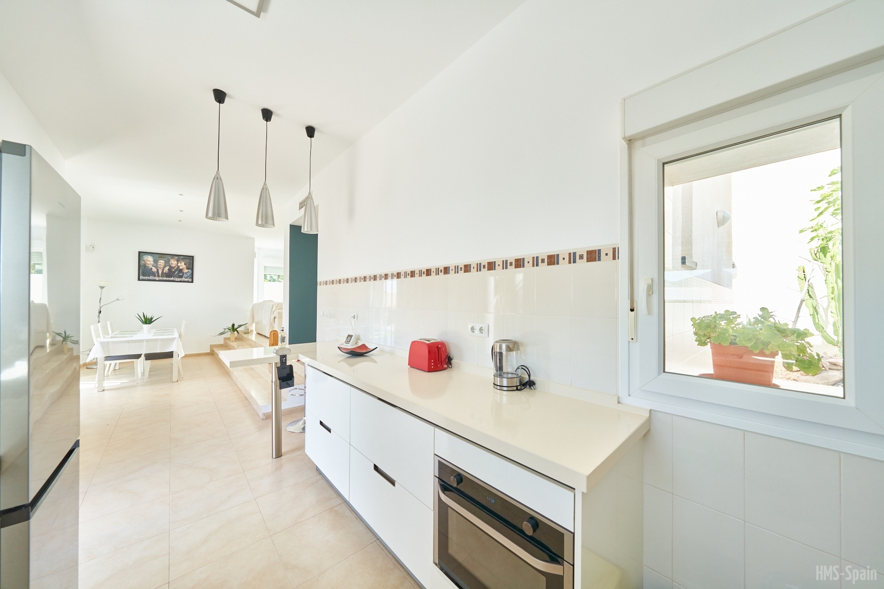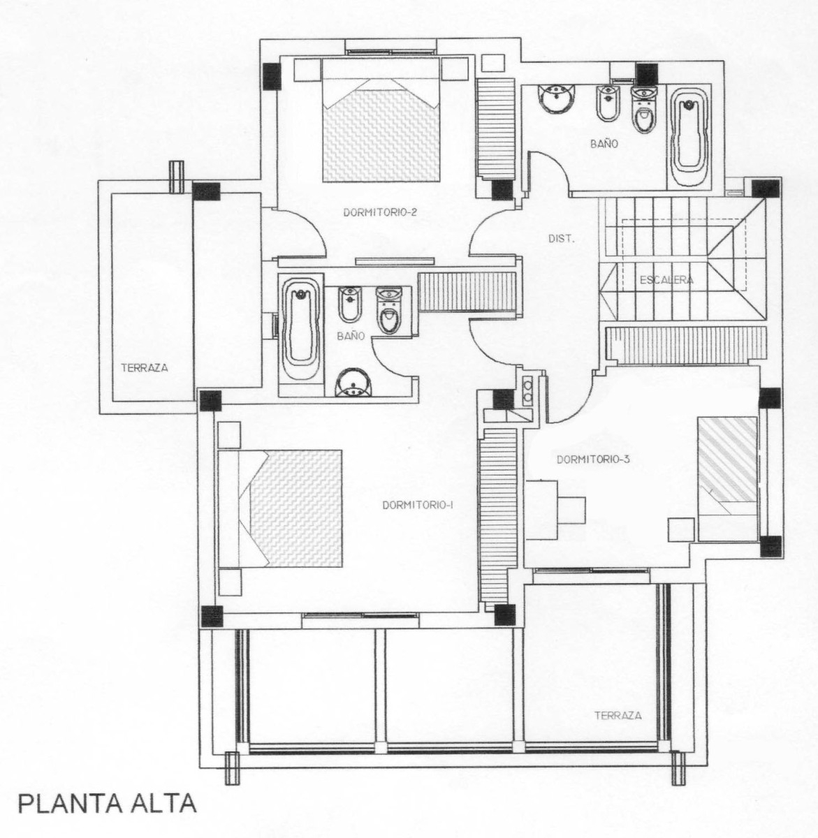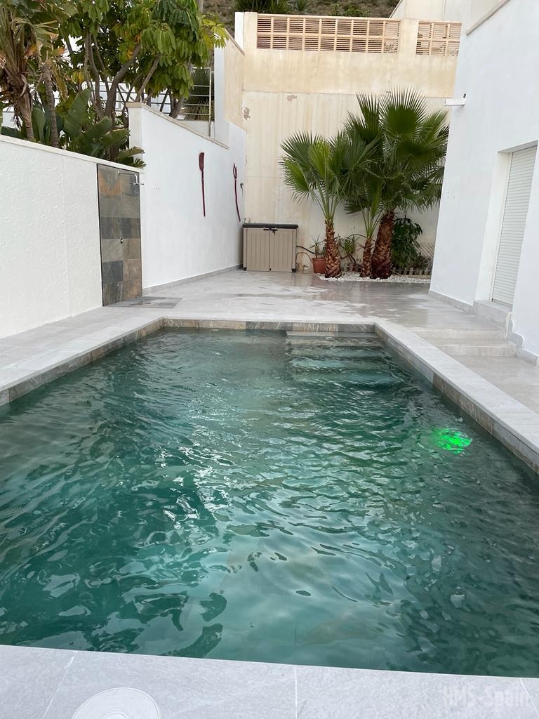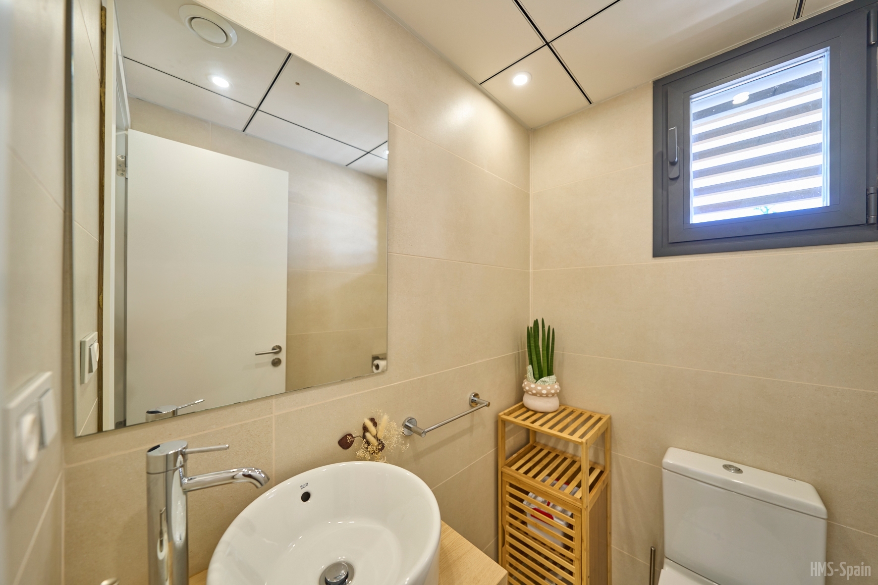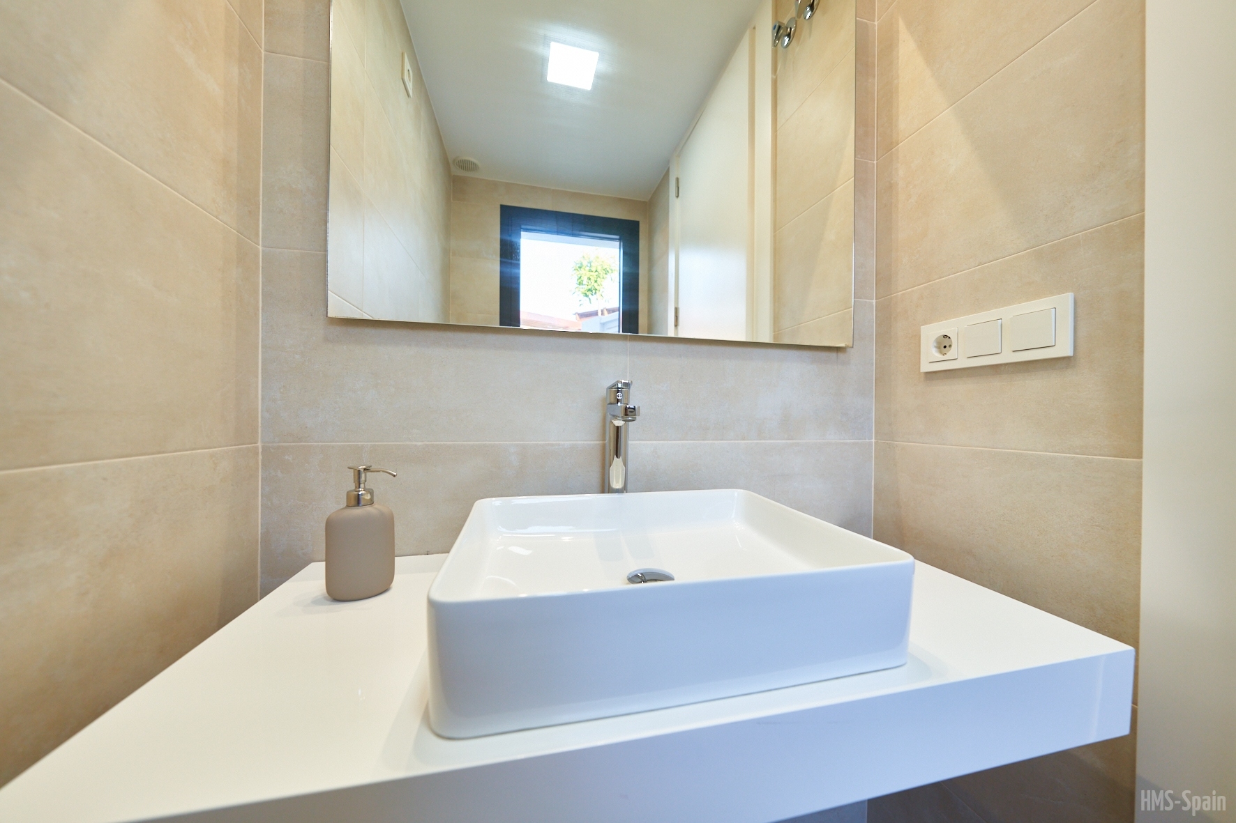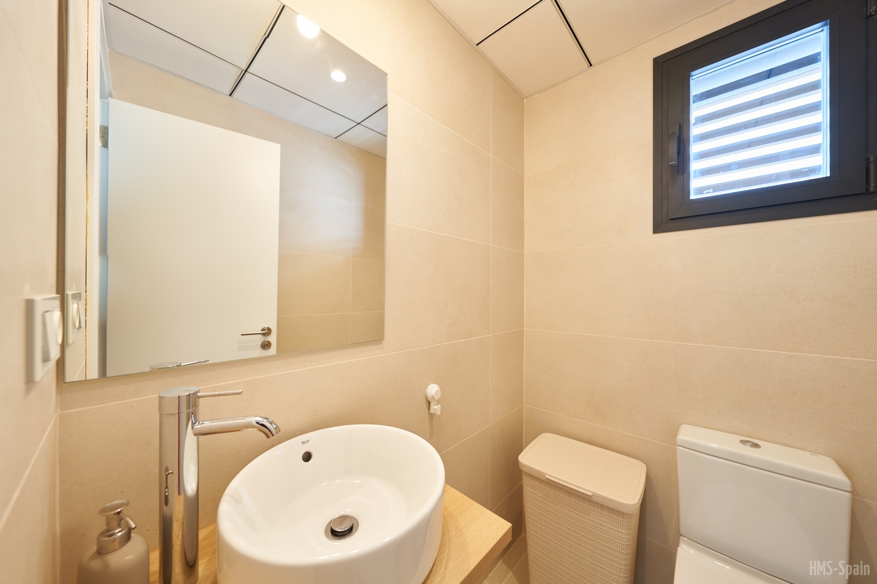 Distribución de la casa: en la planta primera esta la cocina salón comedor con terraza y aseo. En la planta baja están los tres dormitorios (suite con cama de matrimonio y baño completo privado, segunda habitación con cama de matrimonio o dos camas individuales, y tercera habitación con una litera, cuenta con un baño completo, las habitaciones dan a una terraza amplia con un mini jardÃn. En la planta cubierta hay un solárium con barbacoa.