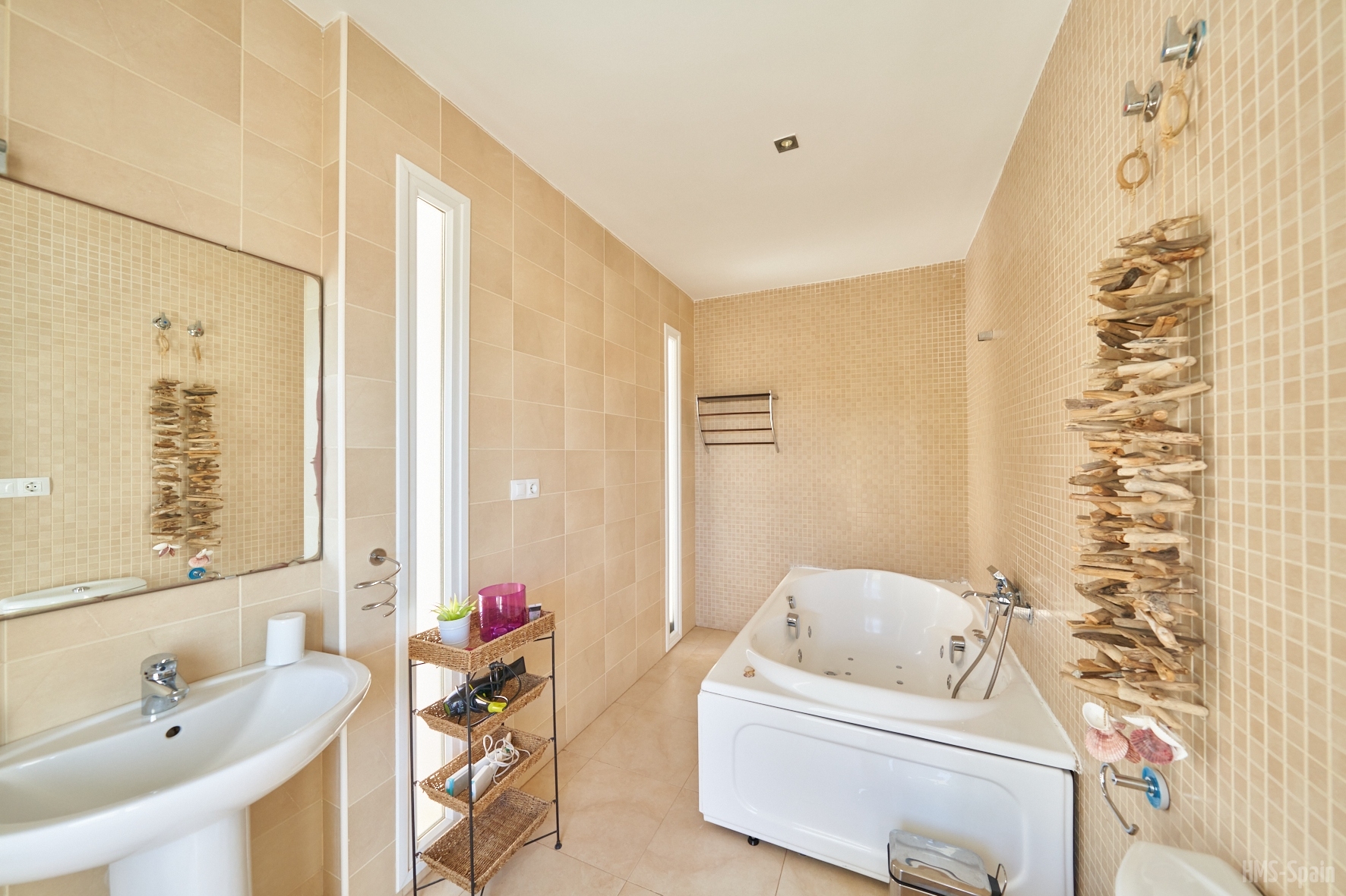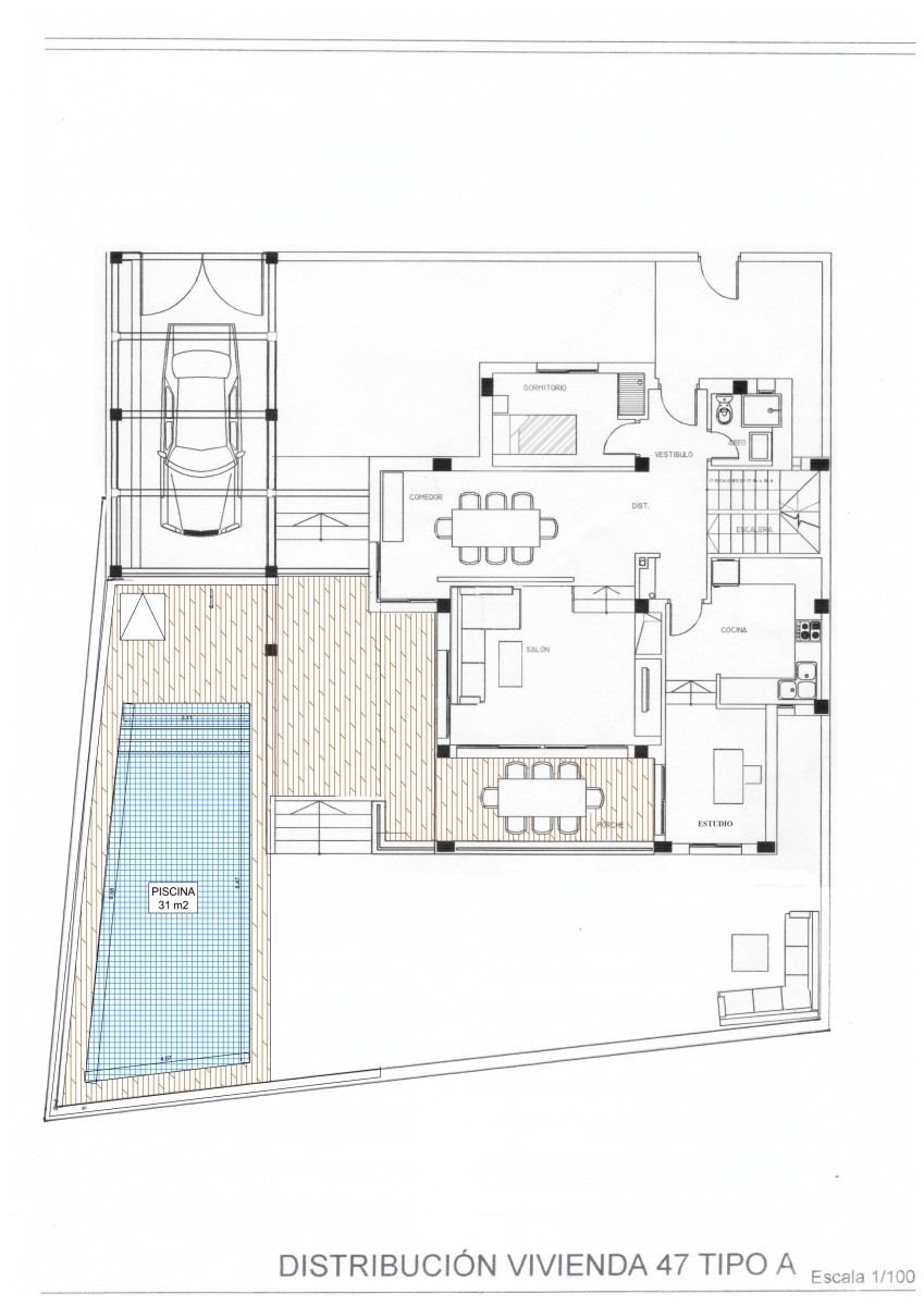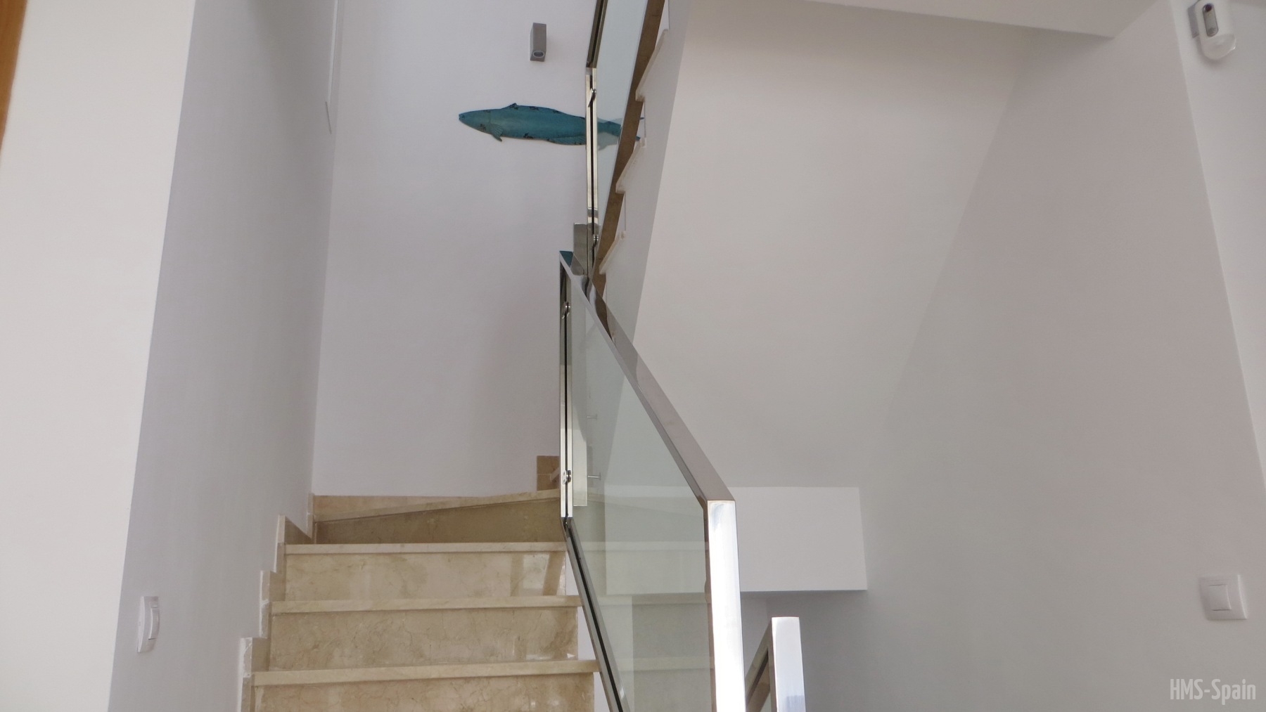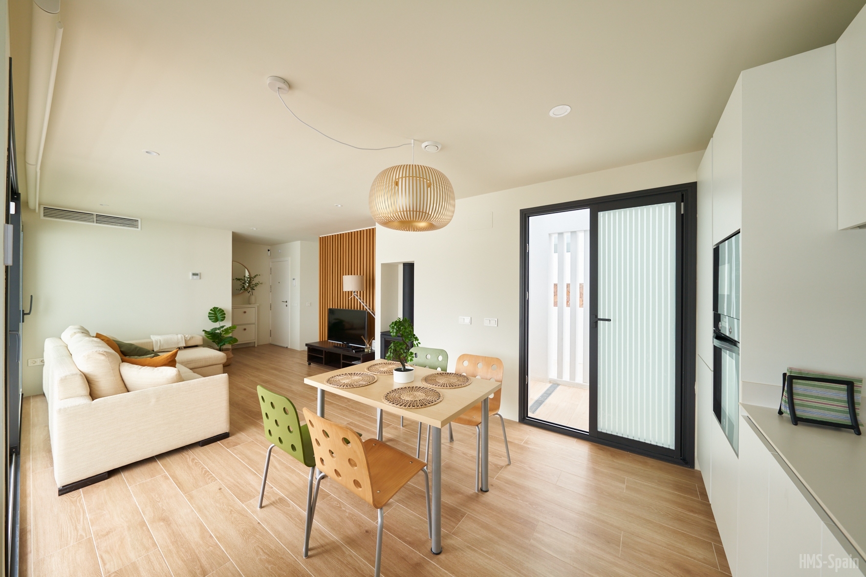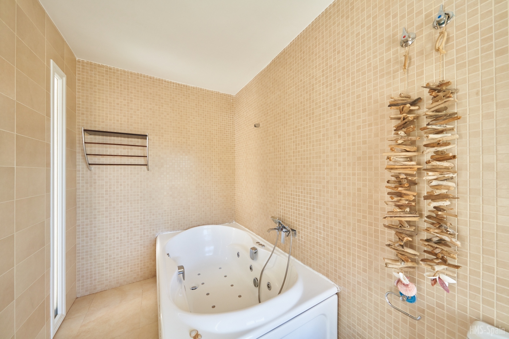 Distribución de la casa: en la planta primera esta la cocina salón comedor con terraza y aseo. En la planta baja están los tres dormitorios (suite con cama de matrimonio y baño completo privado, segunda habitación con cama de matrimonio o dos camas individuales, y tercera habitación con una litera, cuenta con un baño completo, las habitaciones dan a una terraza amplia con un mini jardÃn. En la planta cubierta hay un solárium con barbacoa.