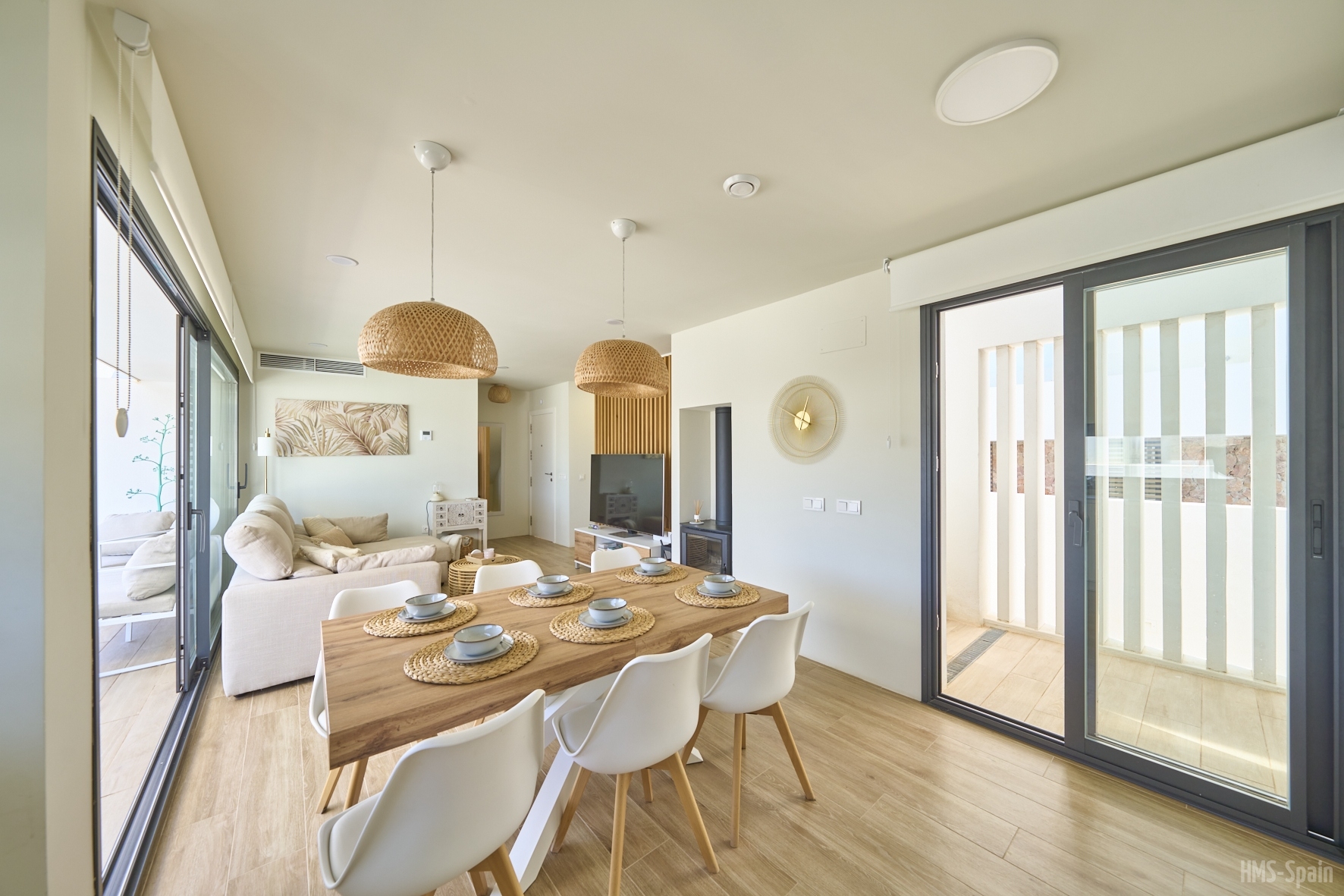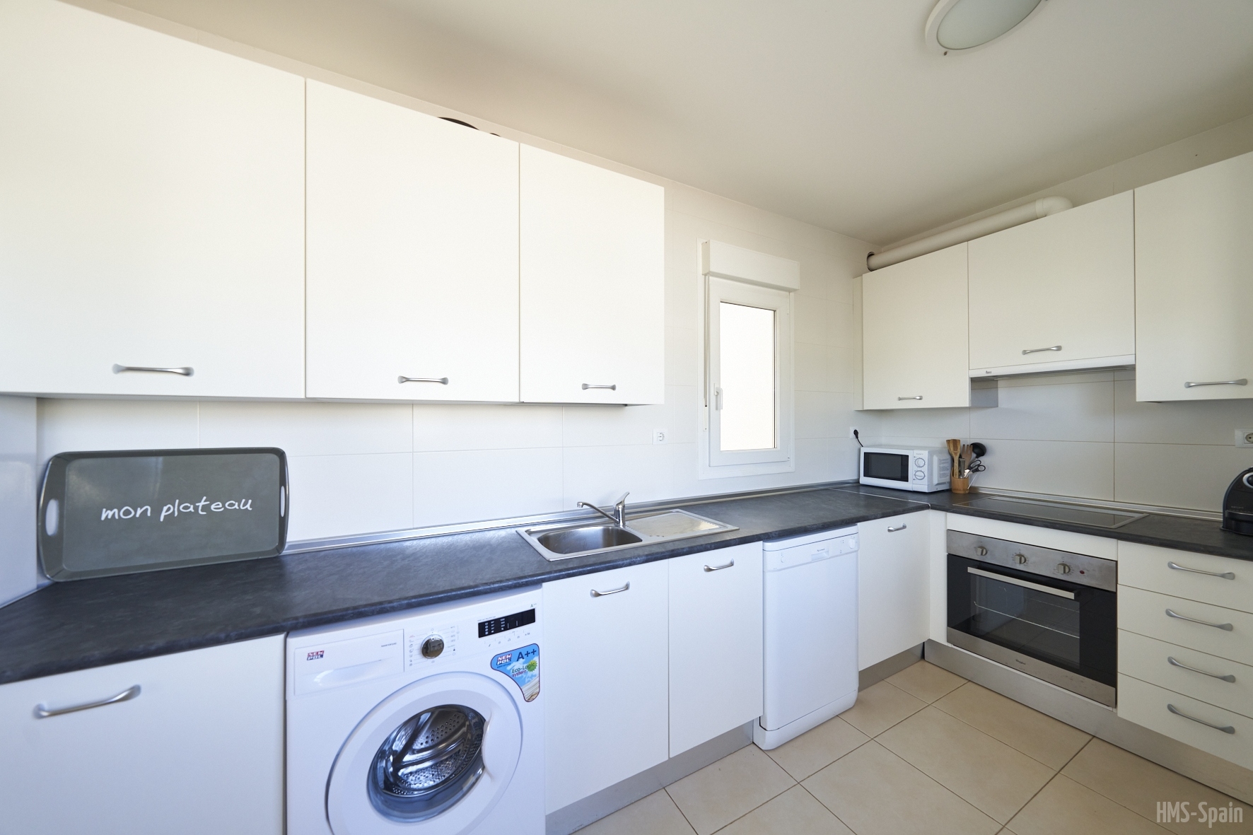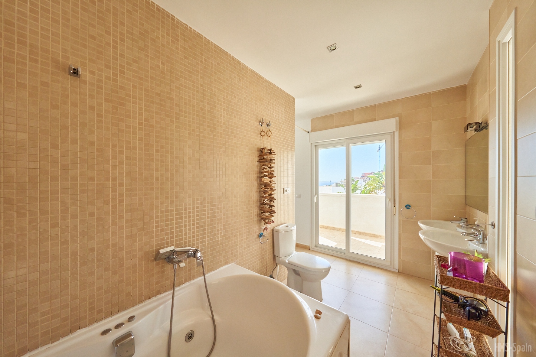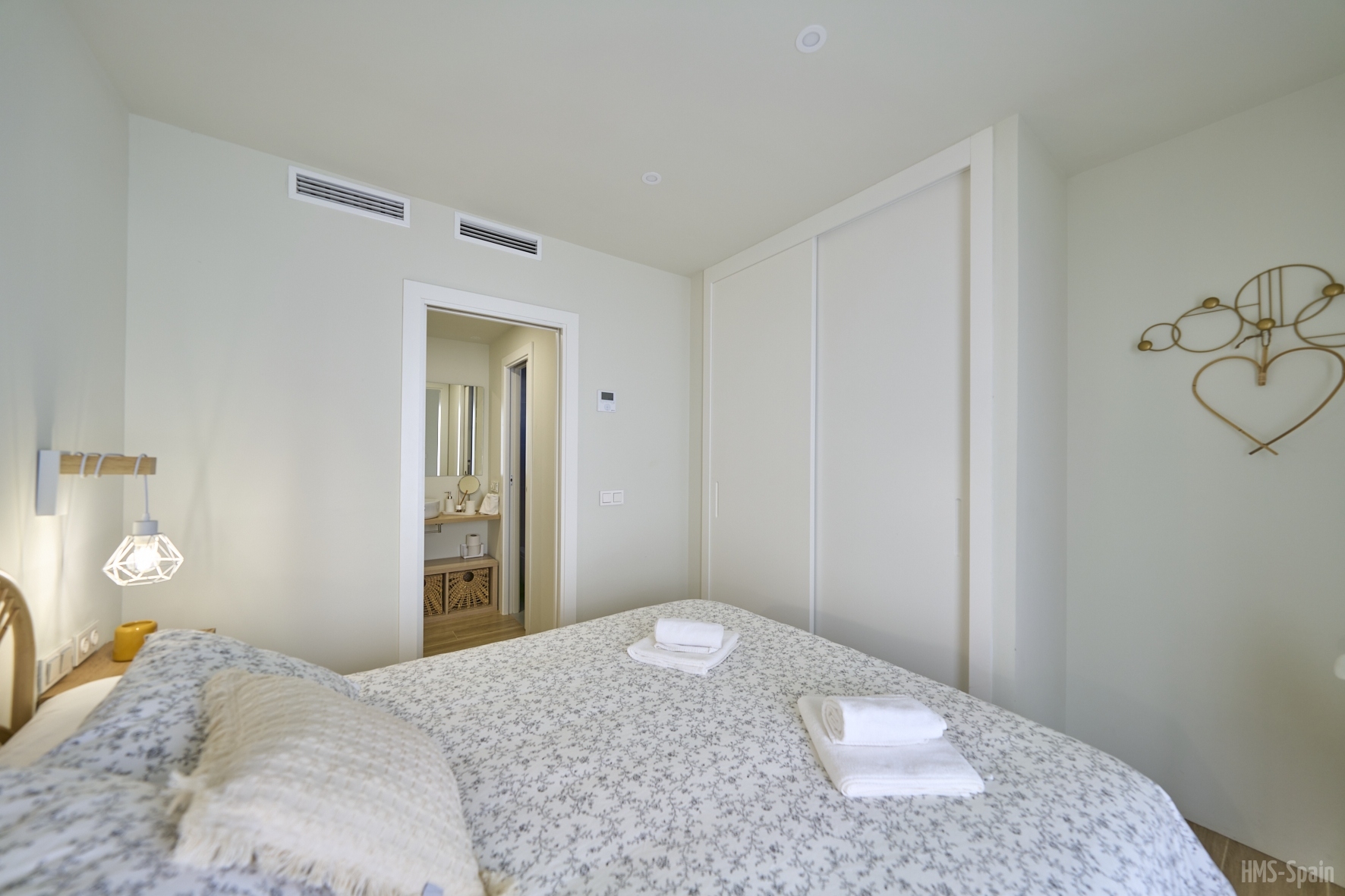 3 dormitorios con baños en suite, 1 aseo, terraza amueblada, garaje y piscina comunitaria. Máximo 6 personas.