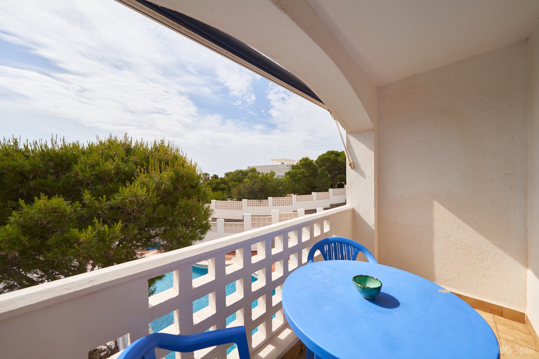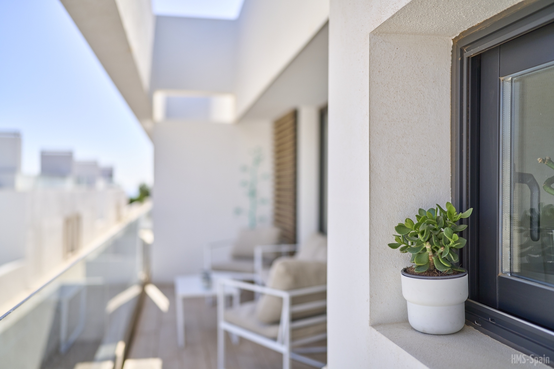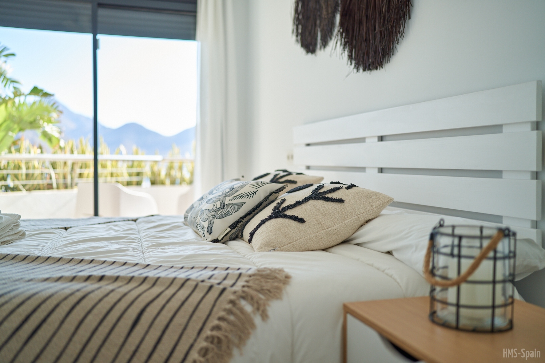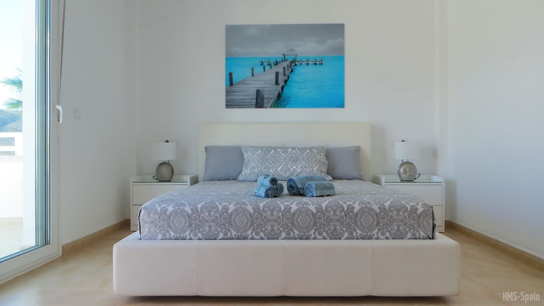 3 dormitorios con baños en suite, 1 aseo, terraza amueblada, garaje y piscina comunitaria. Máximo 6 personas.