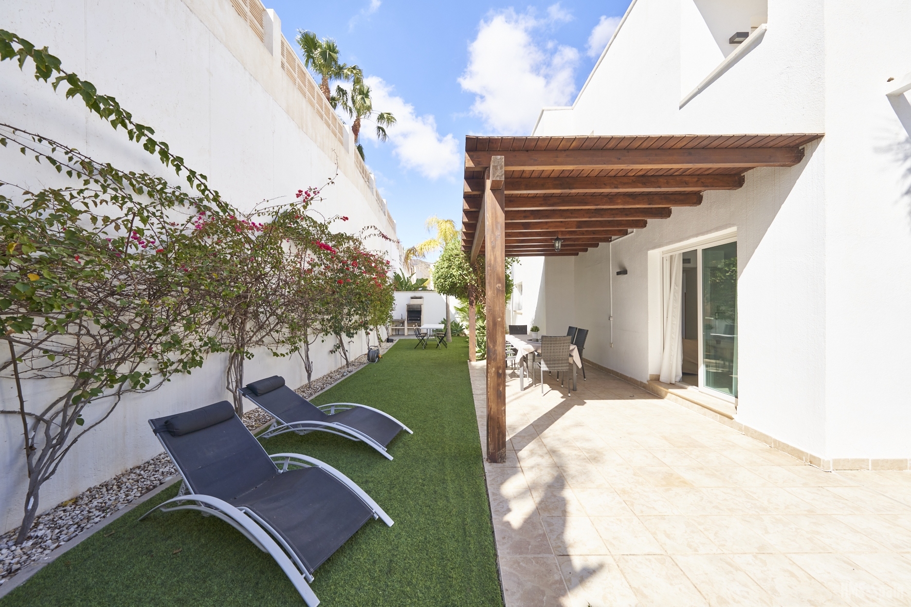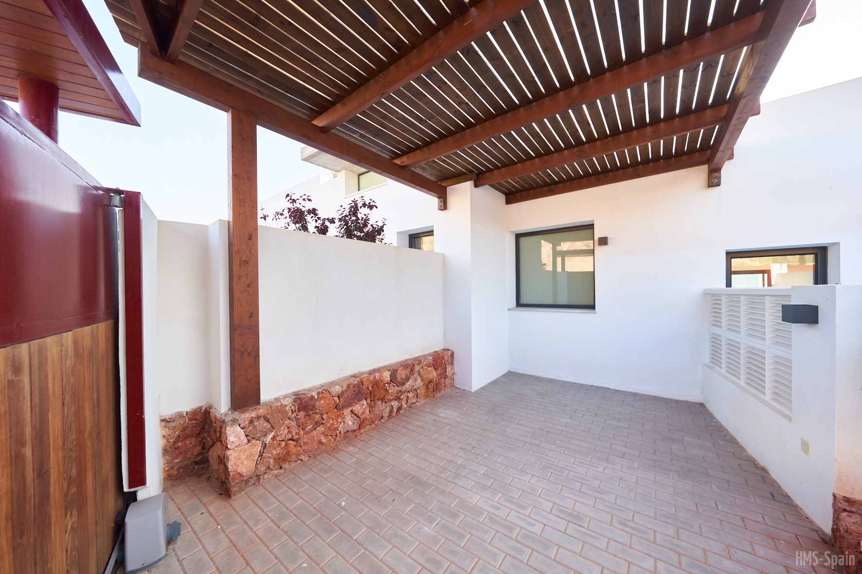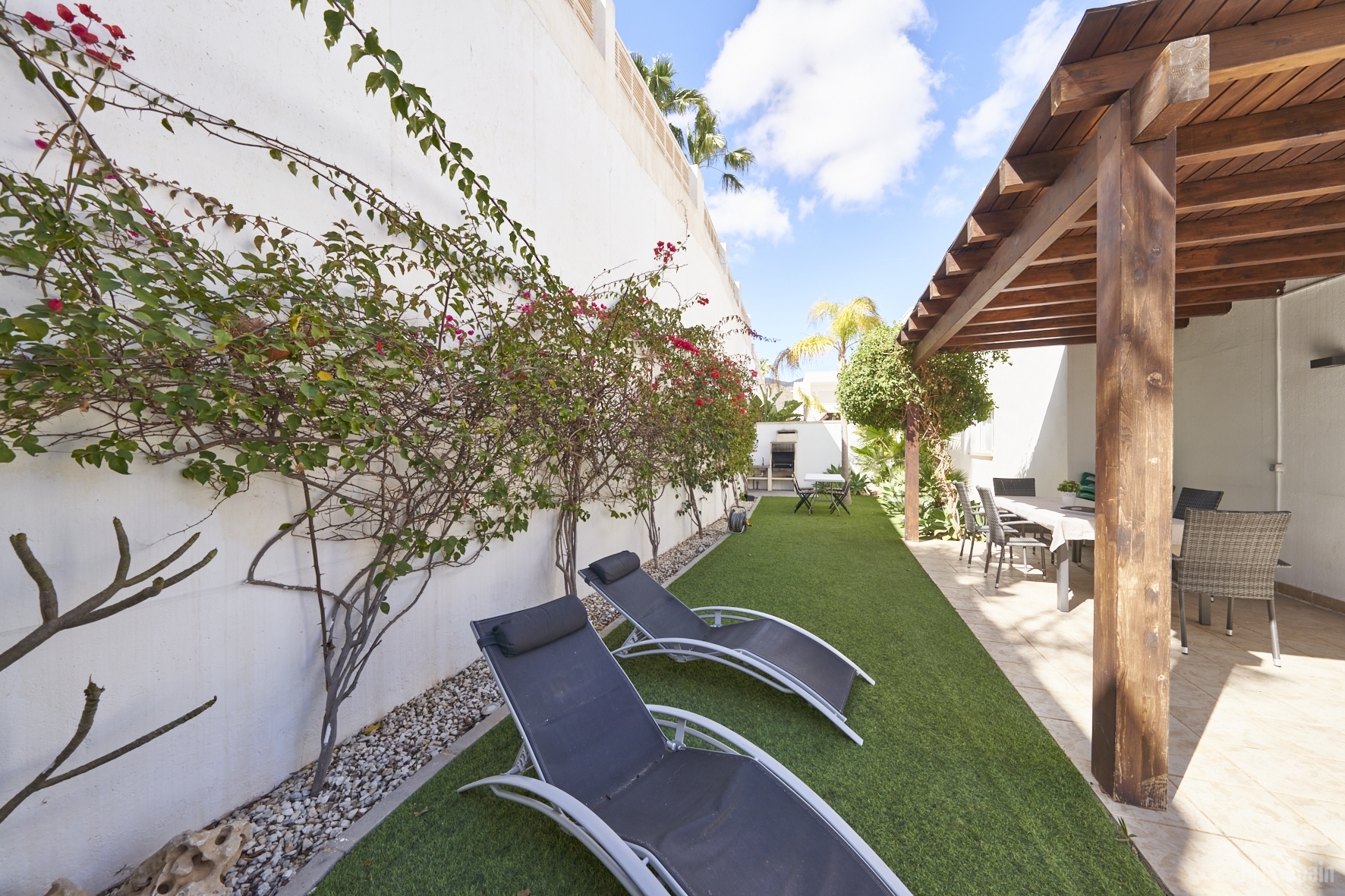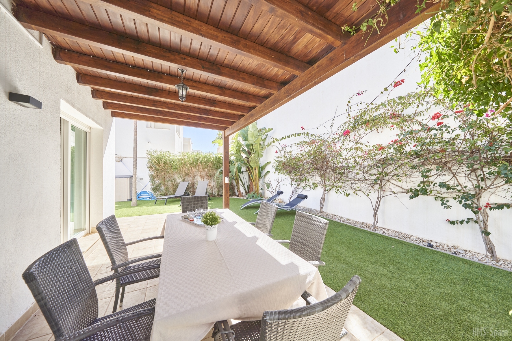 Magnifica casa muy bien equipada de obra nueva ubicada en una zona tranquila de San José ideal para pasar unas vacaciones en familia con todas las comodidades necesarias. Dispone de 3 dormitorios, 2 baños y un aseo, dos plazas de garaje, jardÃn, terrazas amuebladas y solárium con barbacoa, muebles de exterior y tumbonas. Urbanización con piscina y zonas comunitarias.