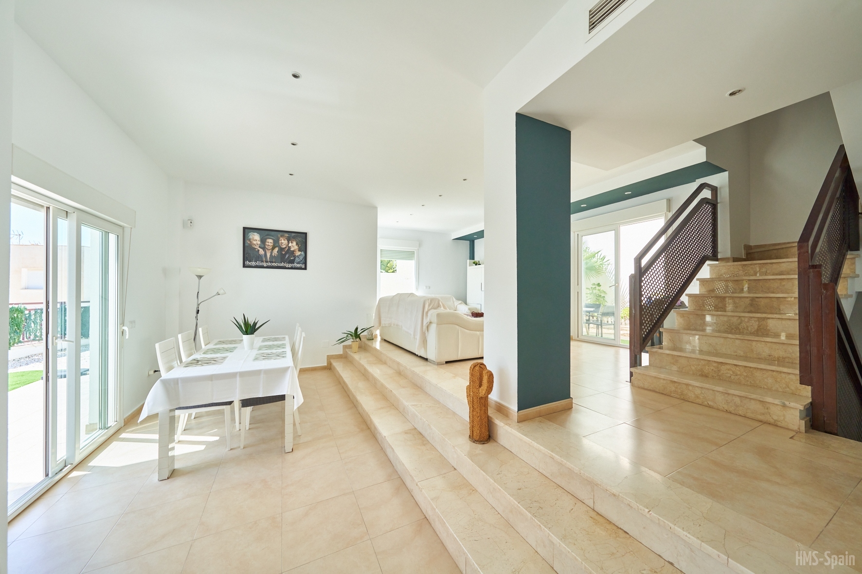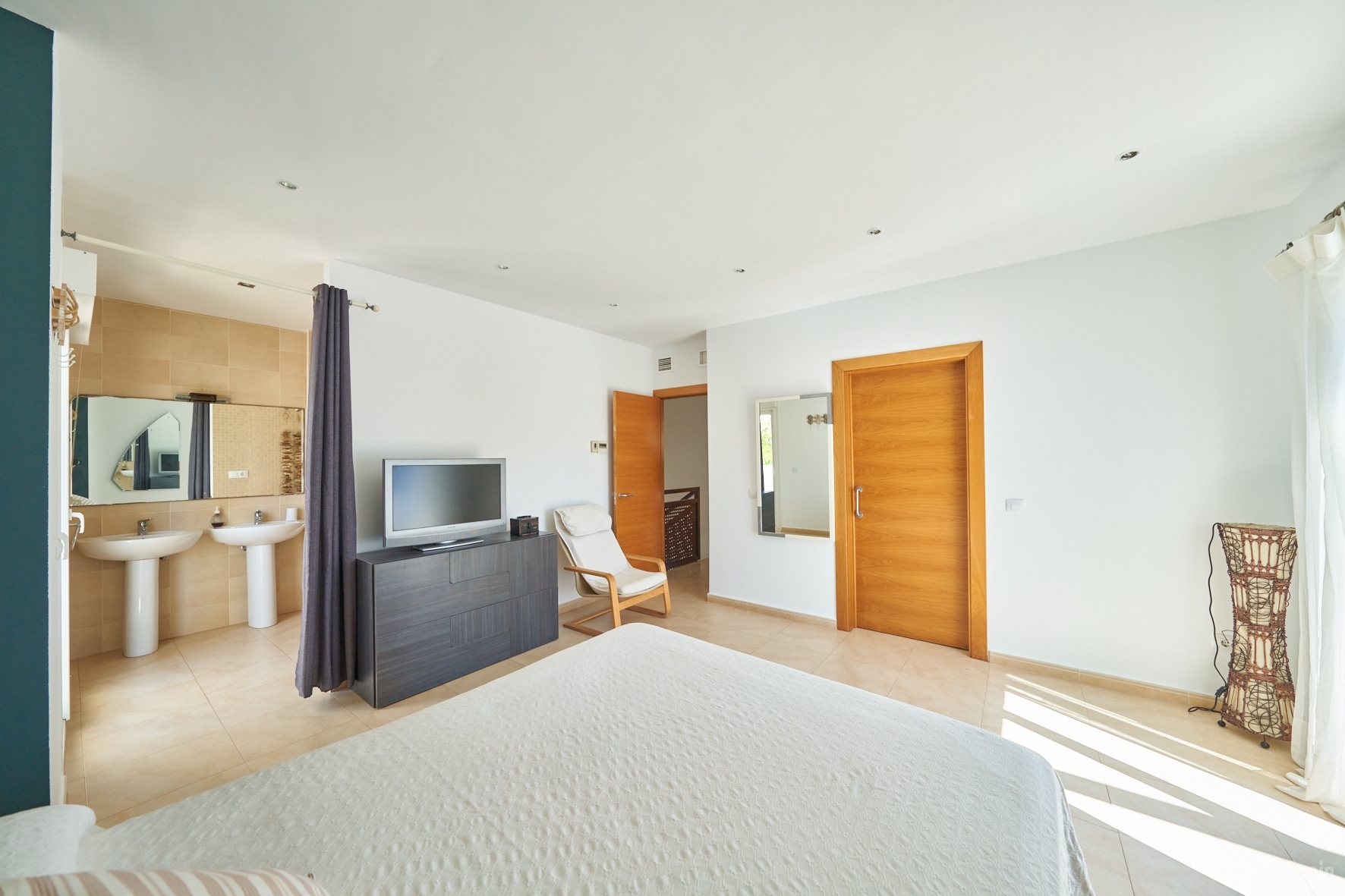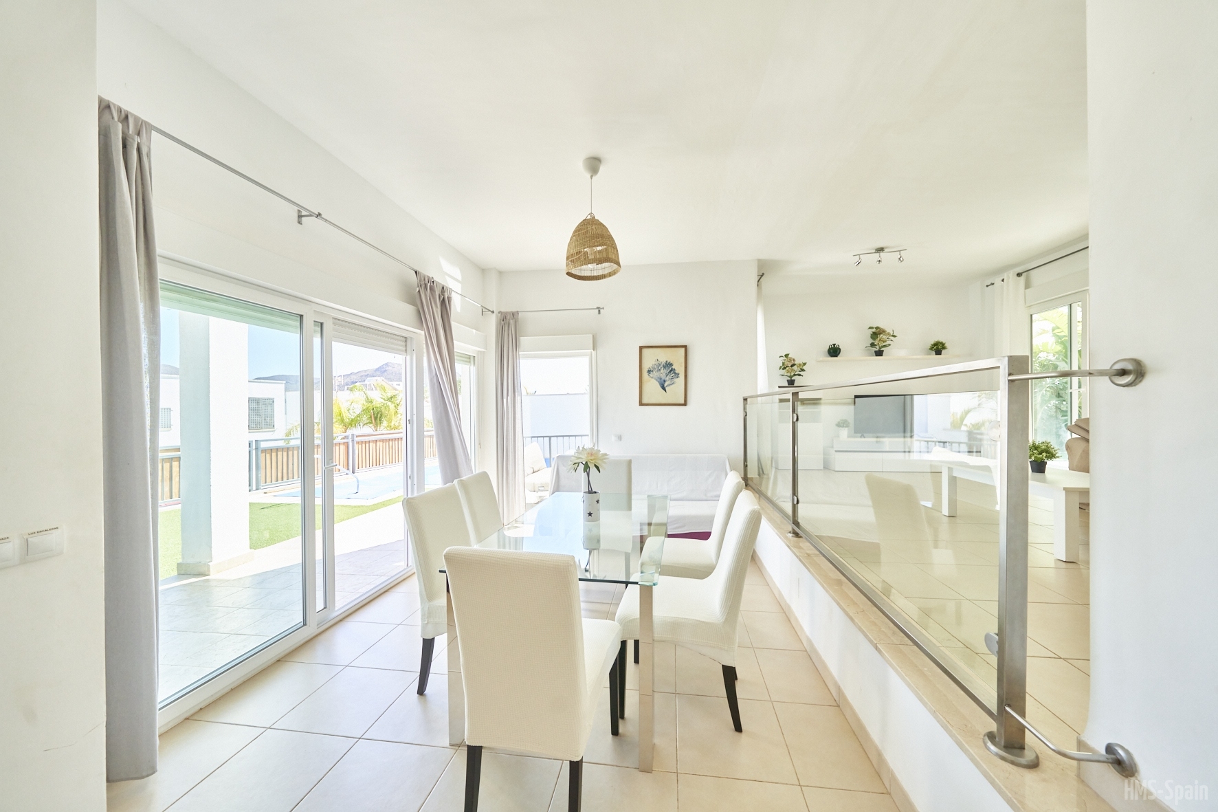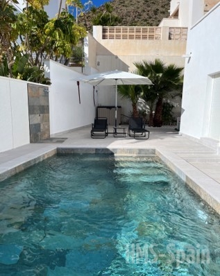 Espectacular villa en San José con piscina privada totalmente equipada y con capacidad para 8 personas ubicada en una zona muy tranquila a 10 minutos andando al centro de San José y su playa, y a tan solo 2,6 y 5 kilómetros de las playas vÃrgenes de Los Genoveses y Mónsul. Construida en una amplia parcela individual, con vistas al mar y a la montaña, en la que podrá disfrutar de una gran piscina de agua salada. Además el equipamiento exterior, incluye jardÃn, zona chillout, solárium, barbacoa y comedor de exterior. Dispone de salón en dos alturas, cuatro dormitorios, tres baños, cocina y un pequeño espacio dedicado a estudio.