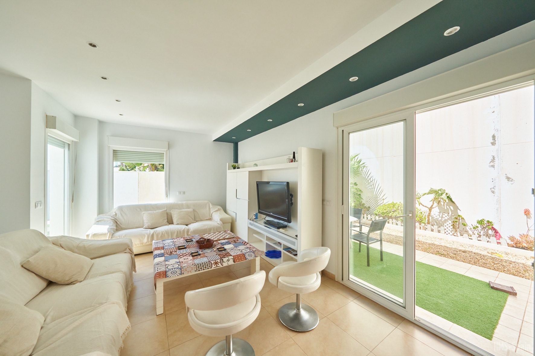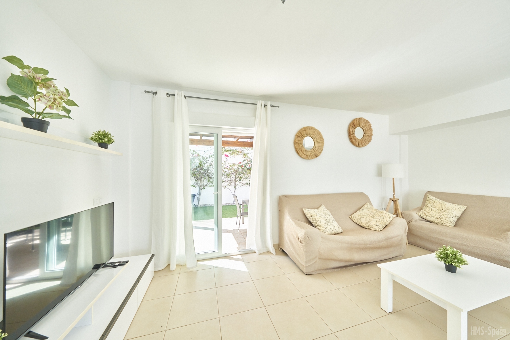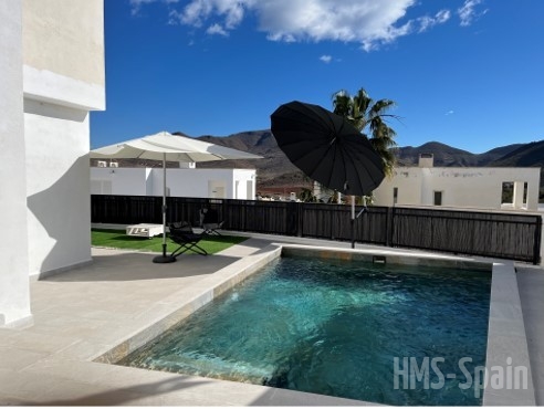 Preciosa casa muy equipada de obra nueva ubicada en una zona tranquila de San José ideal para pasar unas vacaciones en familia. 3 dormitorios, 2 baños y un aseo, plaza de garaje, jardÃn, terraza y solárium con barbacoa. Urbanización con piscina y zonas comunitarias.