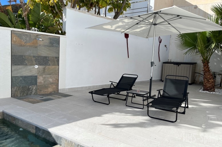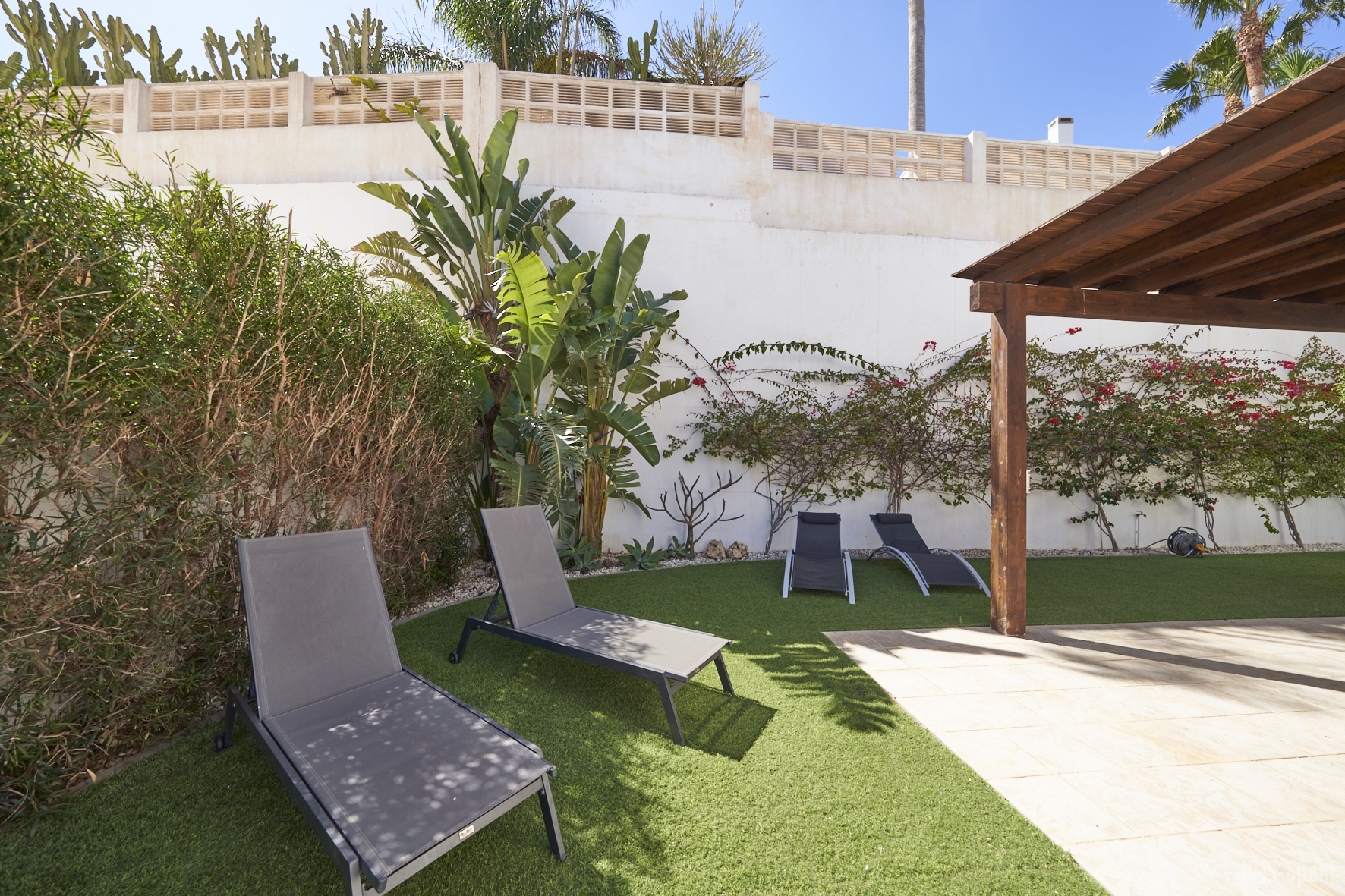 Bonito chalet con piscina privada ubicado en una zona tranquila de San José, a 10 minutos de la playa y del centro. Cuenta con un dormitorio en la planta principal y otros dos en la planta superior. Cuenta con 3 baños (uno en Suite con bañera de hidromasaje). Dispone de cocina totalmente equipada, Aire Acondicionado en todas las estancias y jardÃn con muebles de exterior, tumbonas y barbacoa. Ideal para pasar unas estupendas vacaciones en familia.