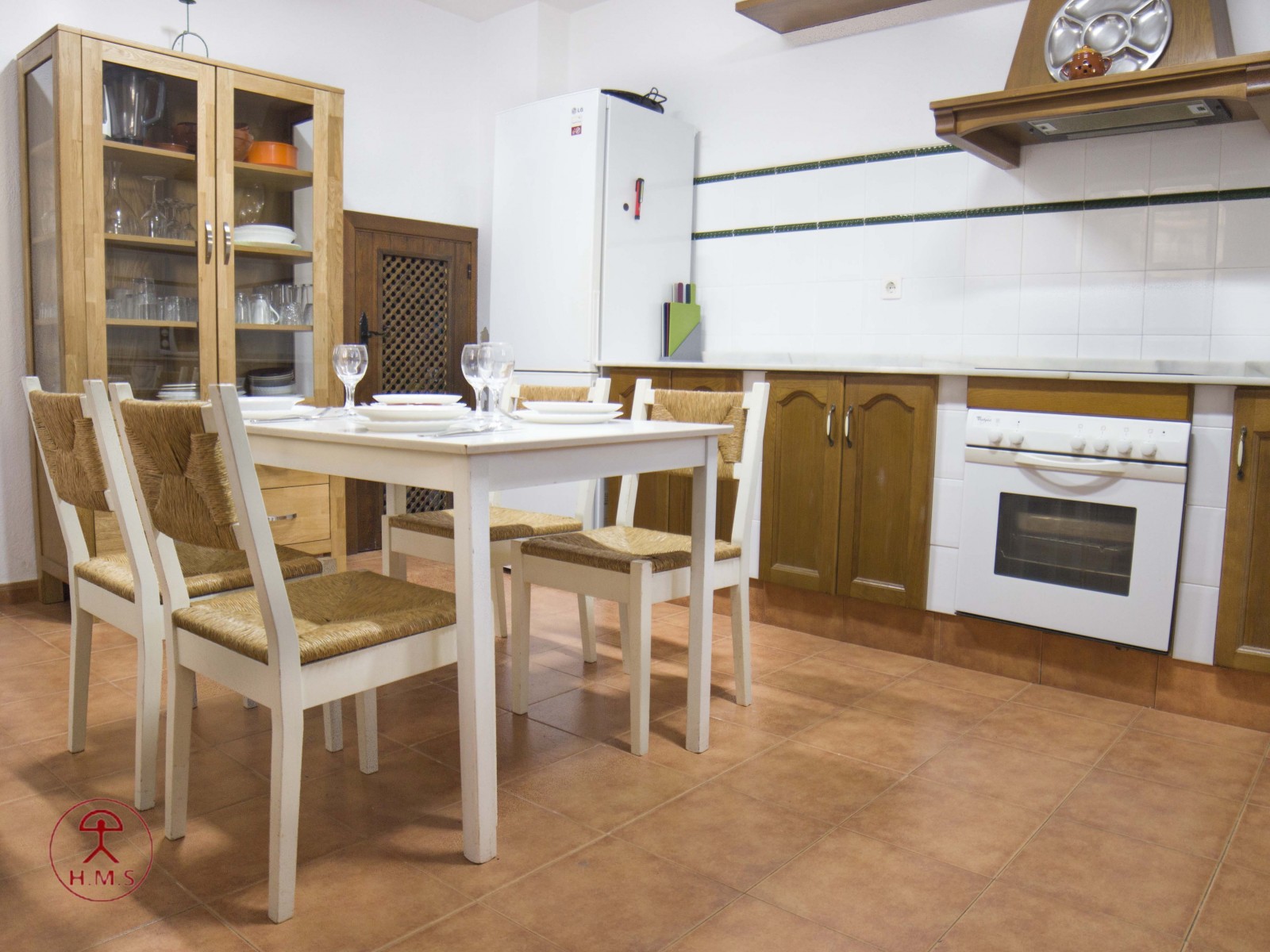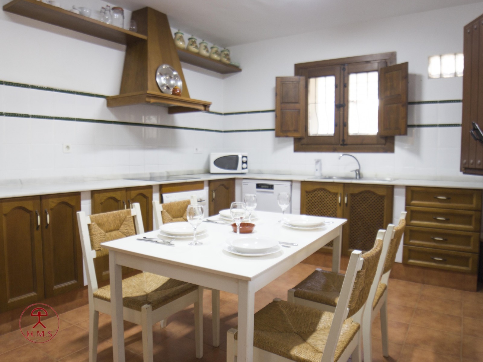 Cocina completa con frigorífico, microondas, vitrocerámica, horno y lavavajillas.