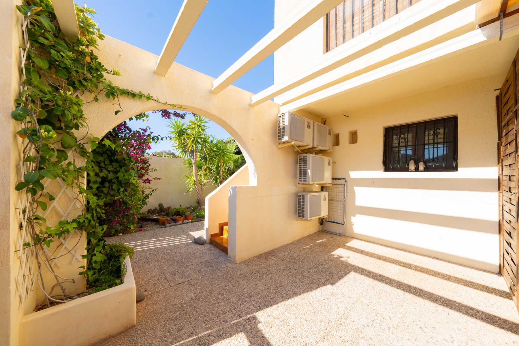 Dispone de dos dormitorios, uno en planta baja y el otro en la segunda planta con camas de 150cm y 160cm , 2 baños, salón-comedor y cocina totalmente equipada. Aire acondicionado en todas las estancias. Terraza amueblada para disfrutar de comidas al aire libre. Dispone de piscina comunitaria.Wiffi gratis. A menos de 5 minutos de la playa y del Paseo Marítimo.