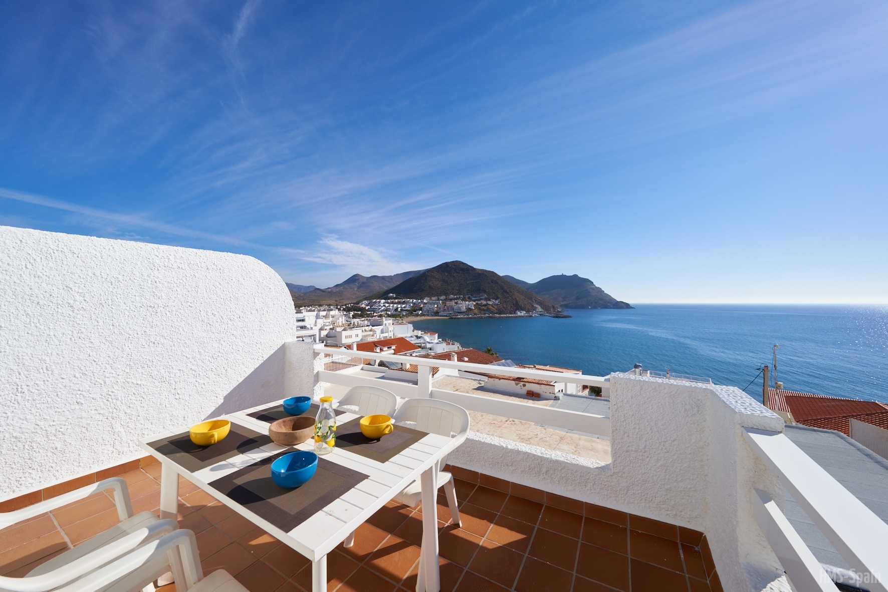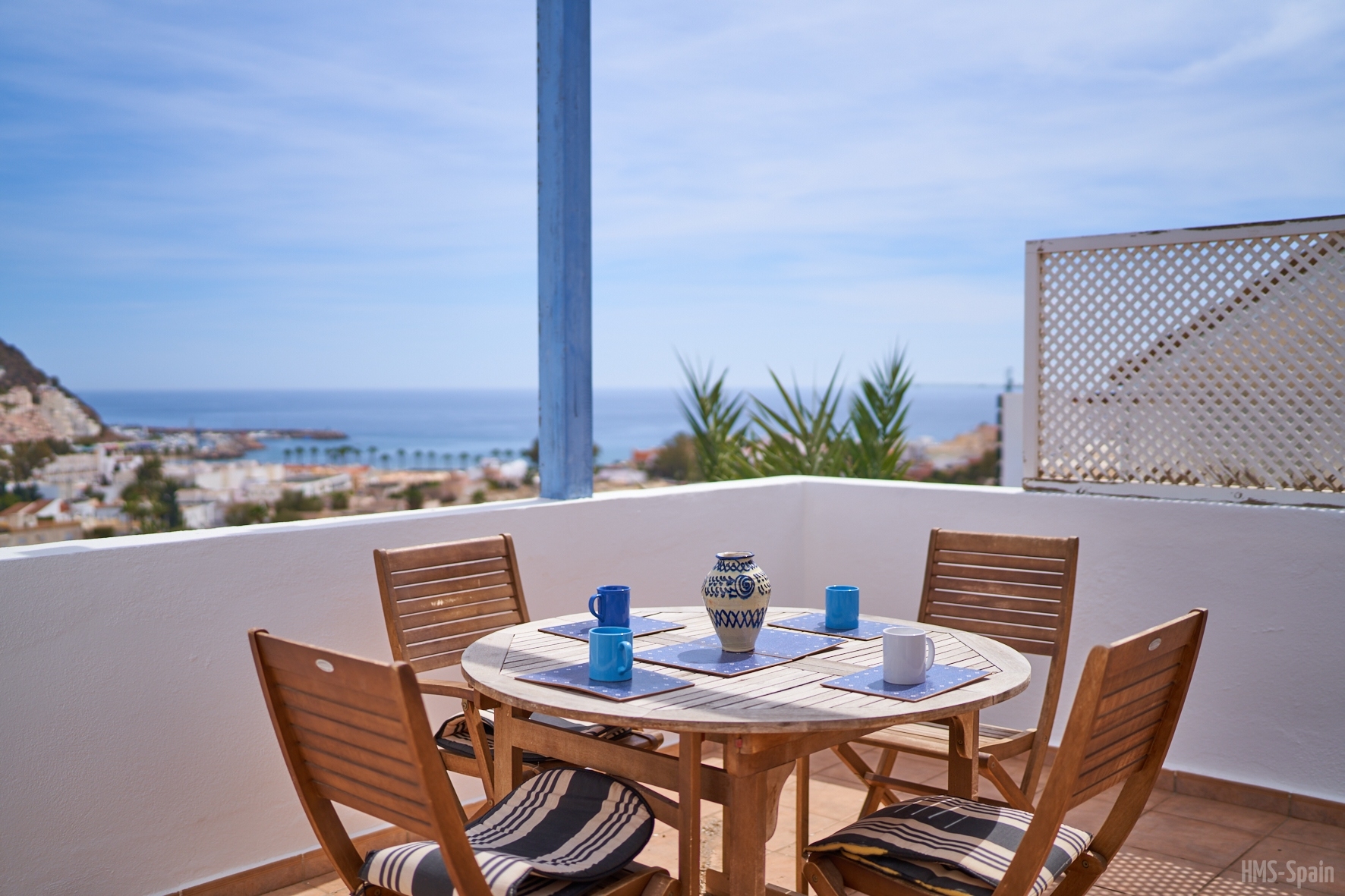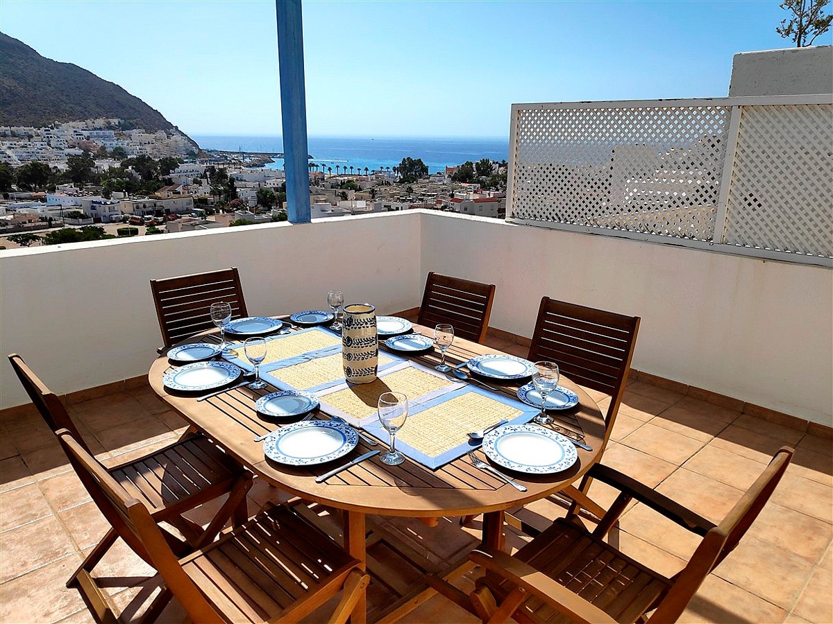 Alquiler de apartamento Duplex de dos dormitorios y un baño, muy cerca de la playa y del centro, con una estupenda terraza con unas impresionantes vistas a la bahía de San josé, la casa está completa de menaje y pequeños electrodomésticos, lavadora. Dispone de sábanas y toallas de casa.