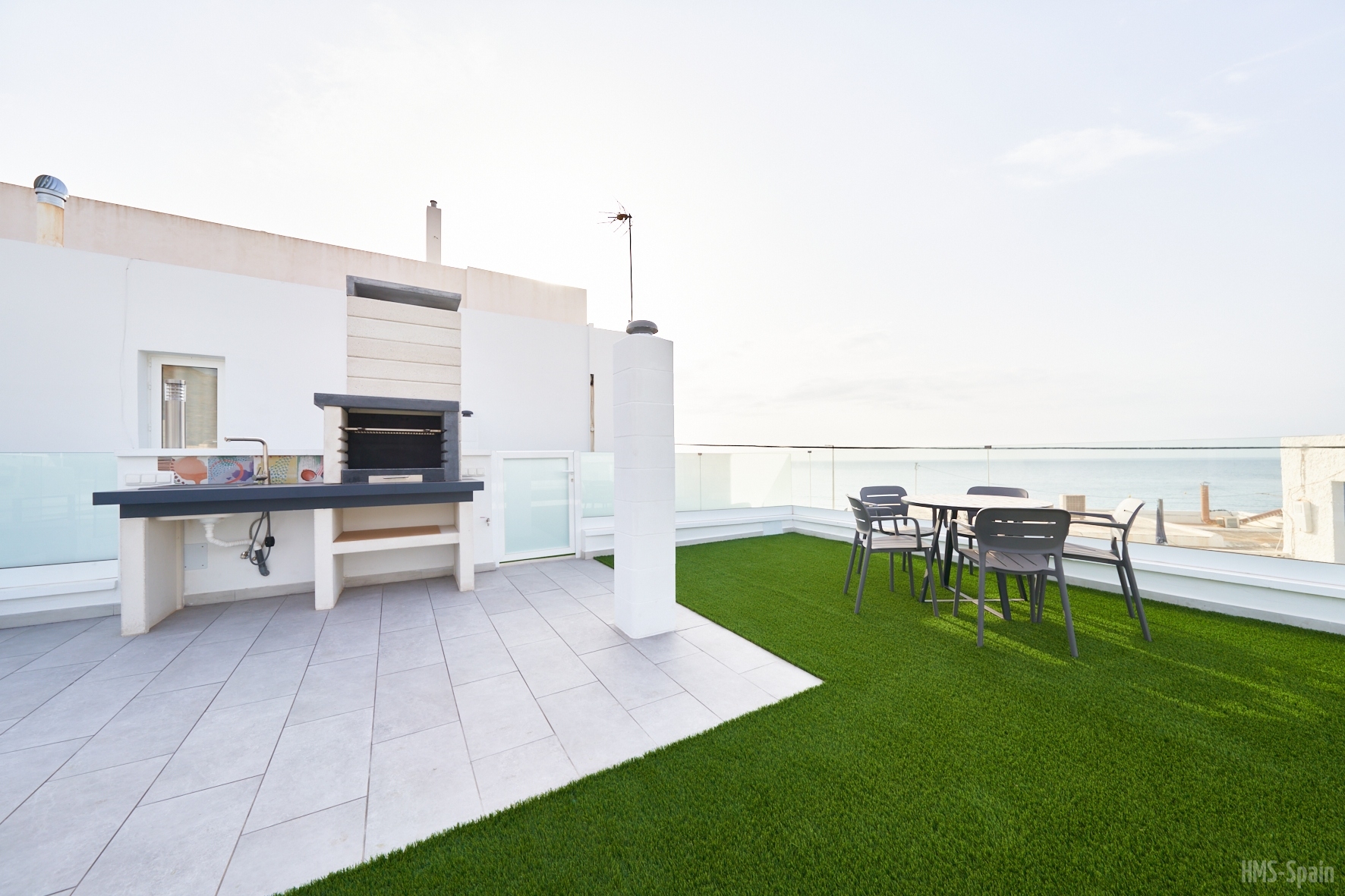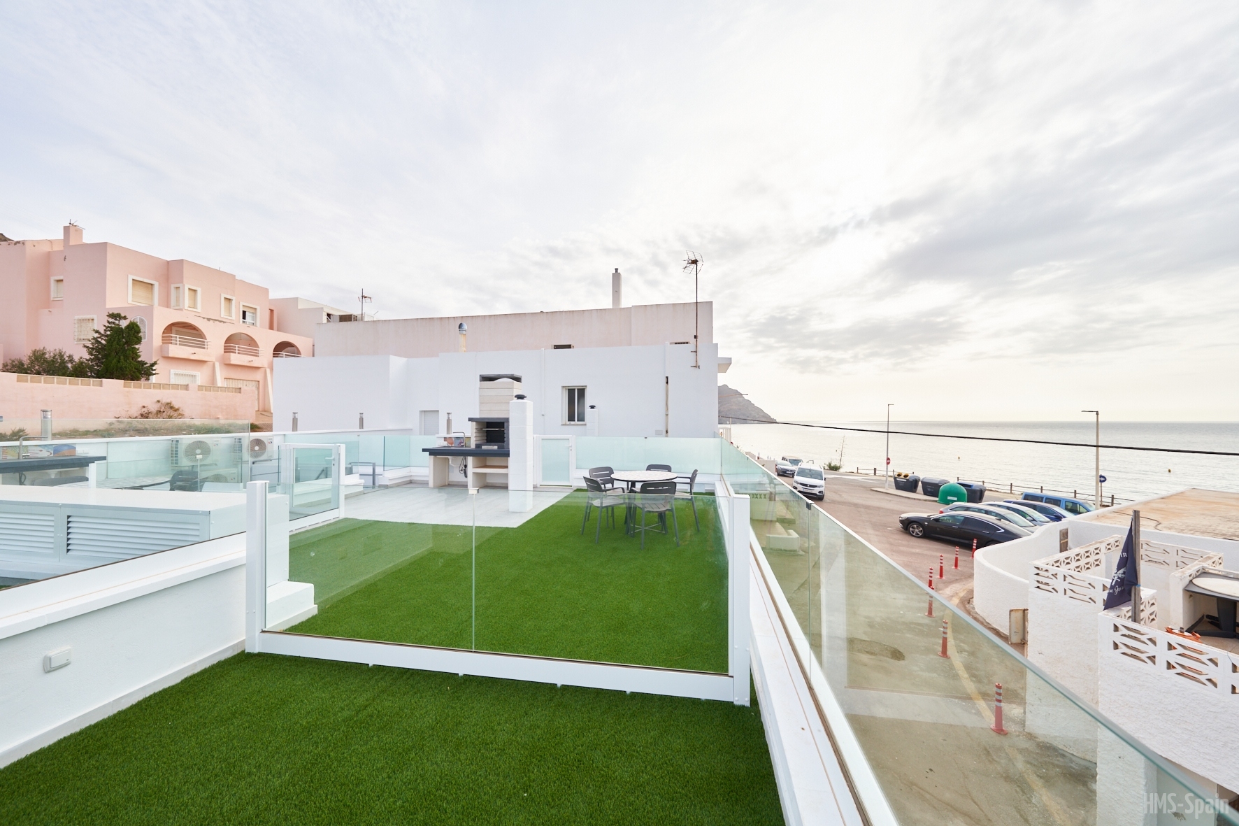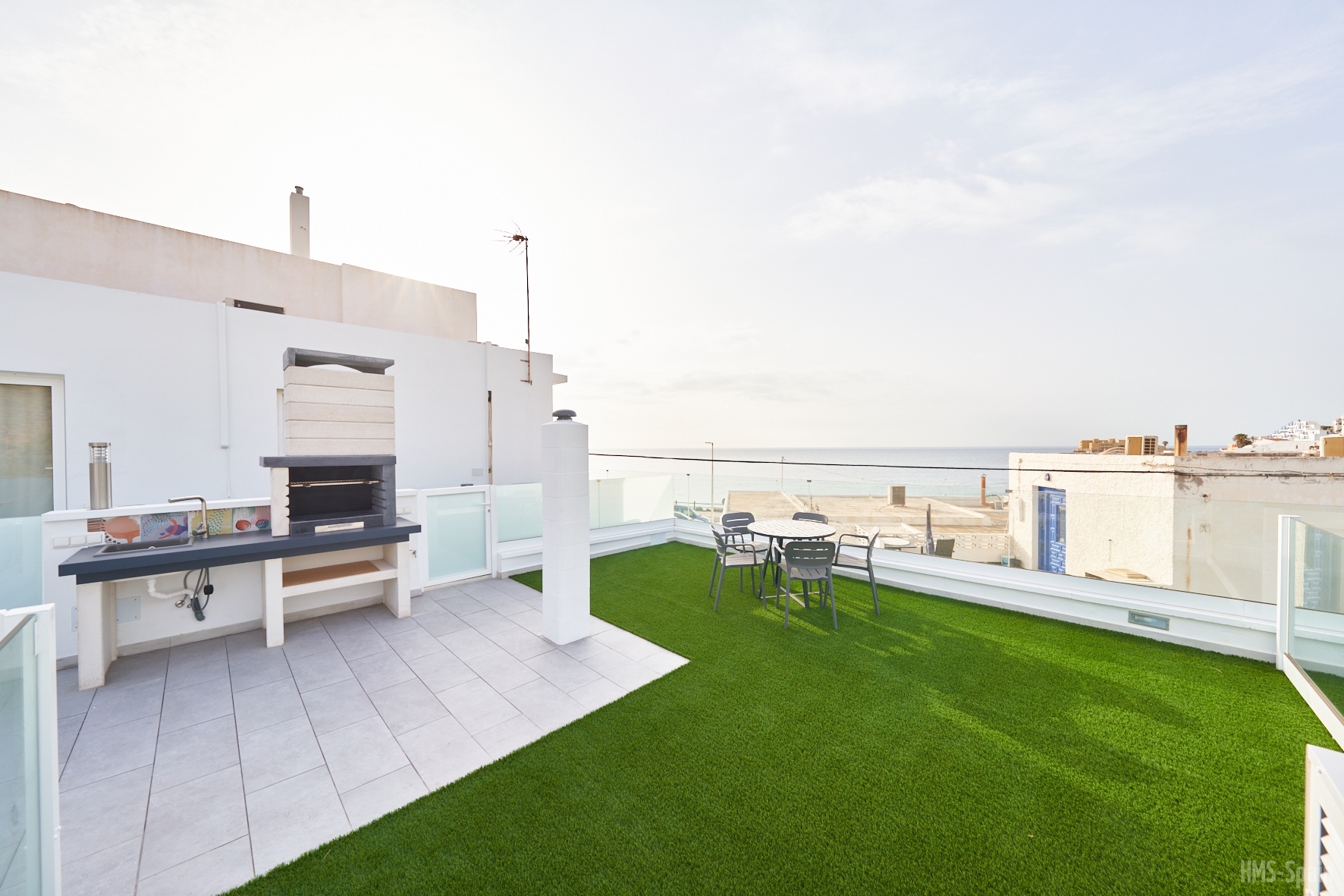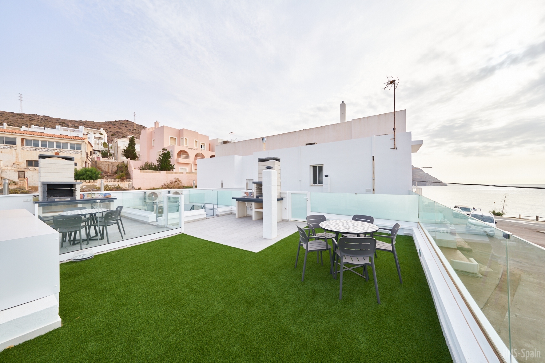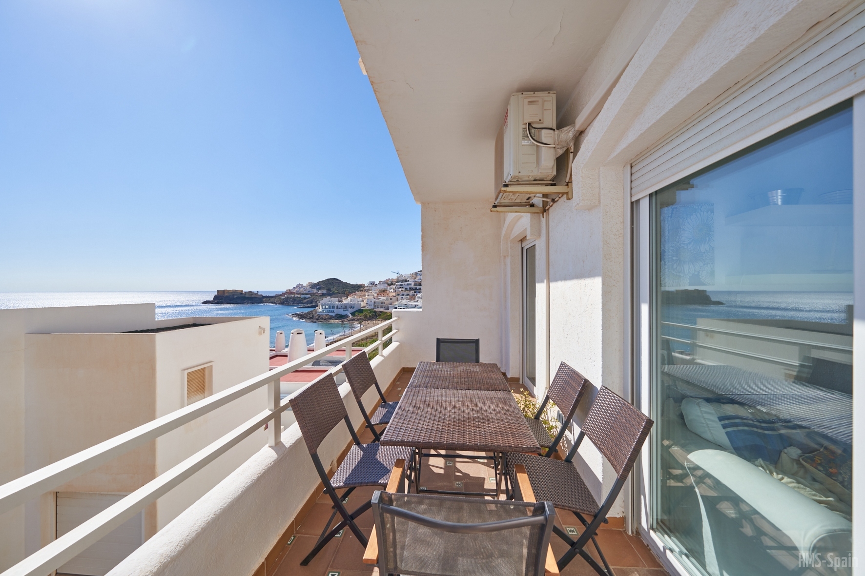 La planta de entrada tiene un aseo, el salón comedor con unos ventanales con magnificas vistas a la bahÃa de San José y una terraza completa con mesas, sillas y tumbonas. En esta misma planta de encuentra la cocina totalmente equipada: frigorÃfico, vitrocerámica, lavavajillas, microondas, batidora, cafetera y tostador.