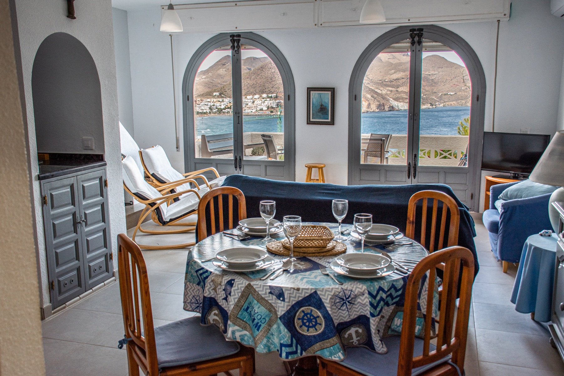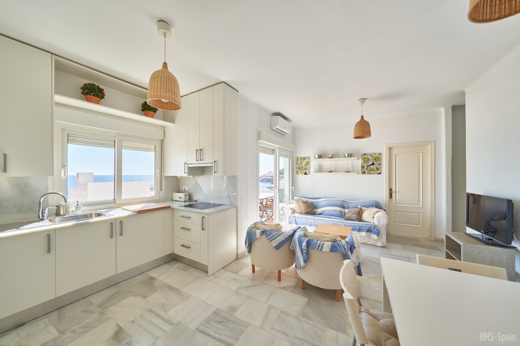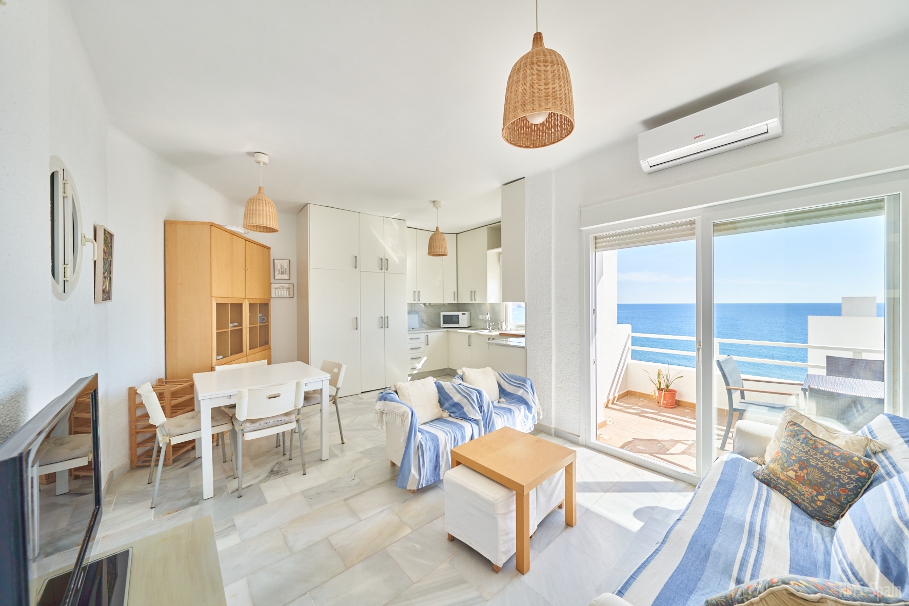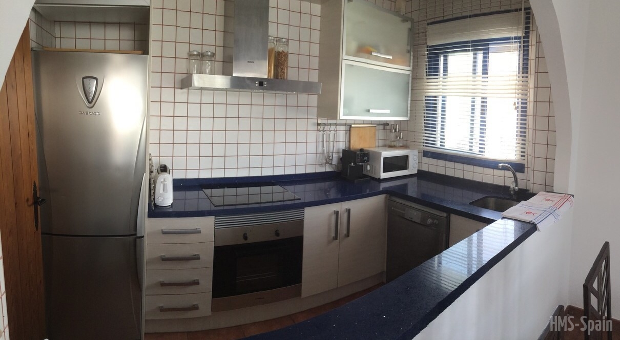 Salón con cocina abierta, la cocina está totalmente equipada con frigorÃfico, lavadora, lavavajillas,horno, microondas, cafetera, tostador y batidora. El salón da a una terraza con una magnificas vistas a la playa de la Calilla, la terraza dispone de mesas y sillas.