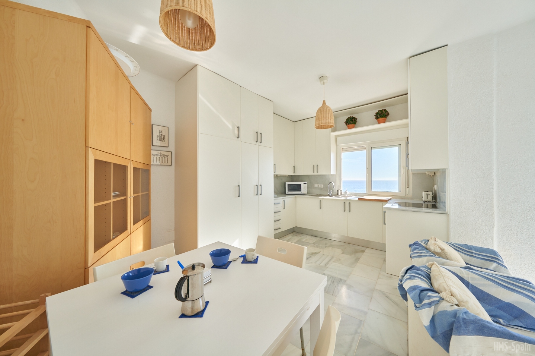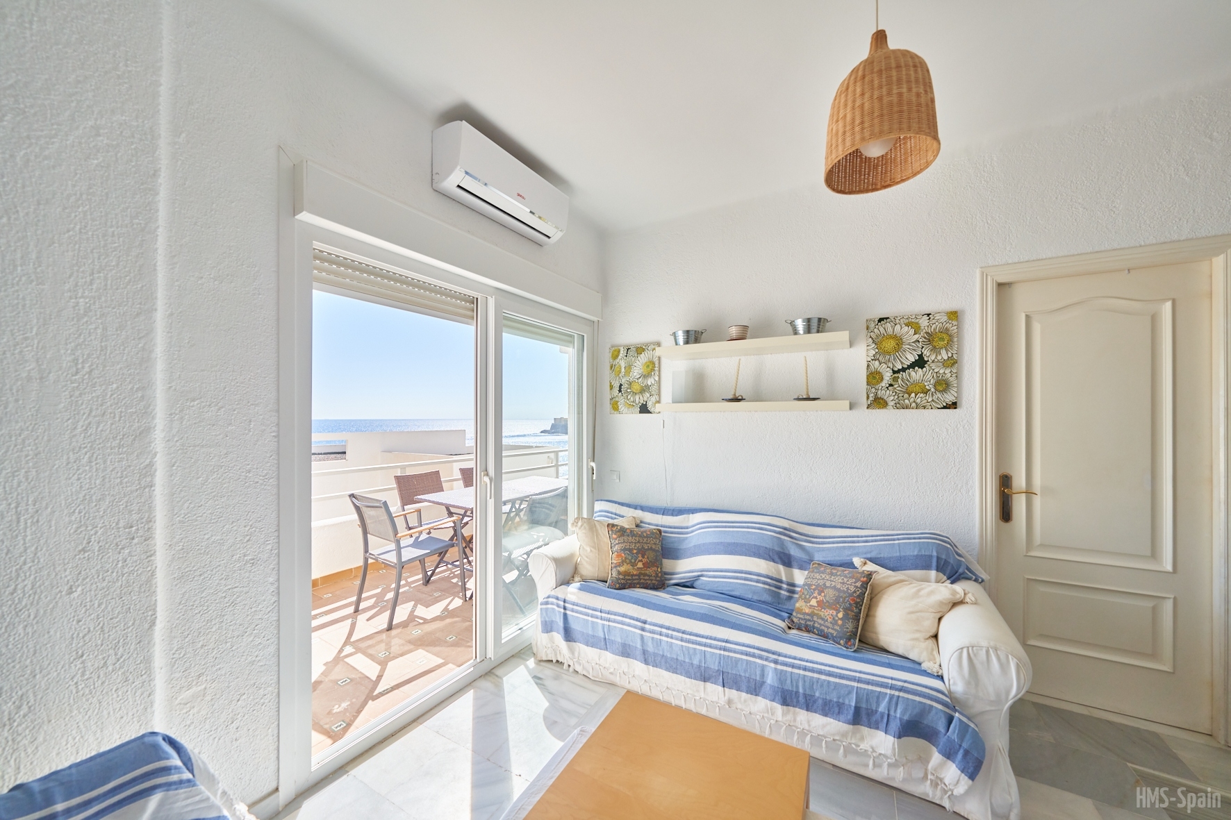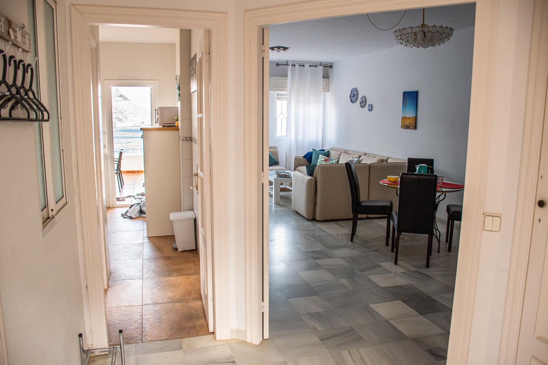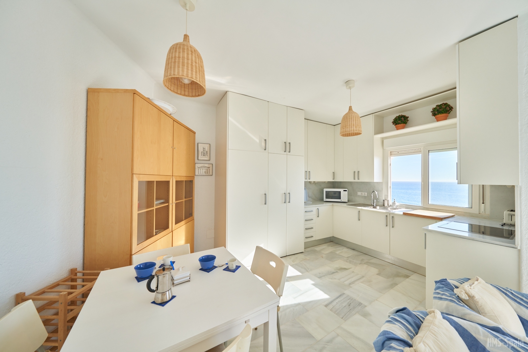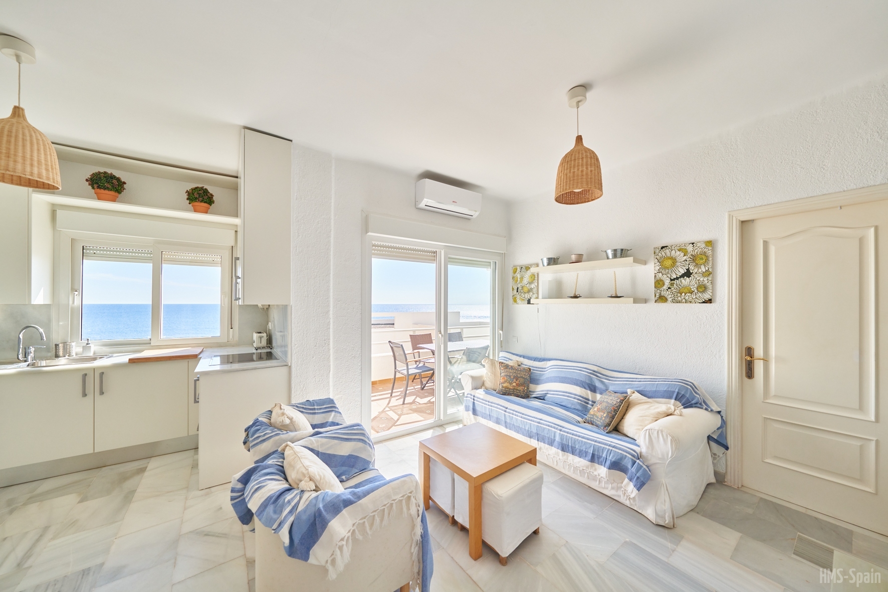 Salón con cocina abierta, la cocina está totalmente equipada con frigorÃfico, lavadora, lavavajillas,horno, microondas, cafetera, tostador y batidora. El salón da a una terraza con una magnificas vistas a la playa de la Calilla, la terraza dispone de mesas y sillas.