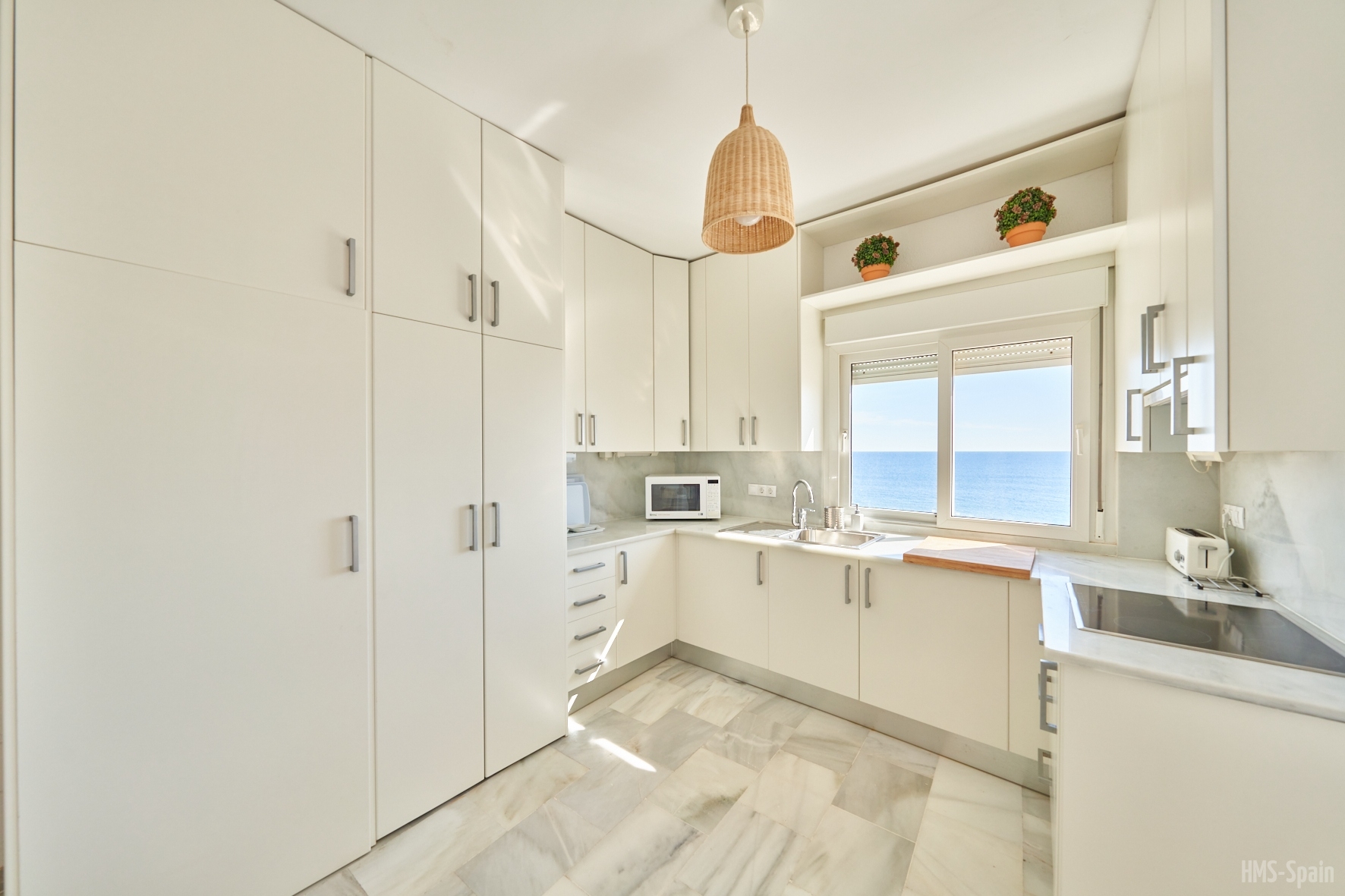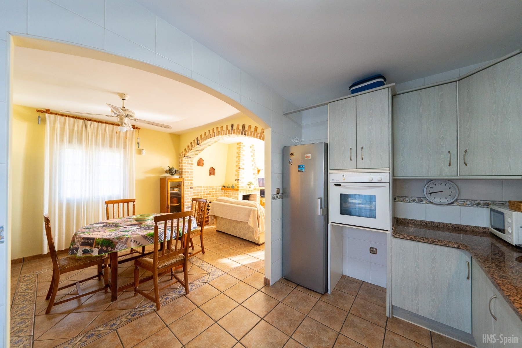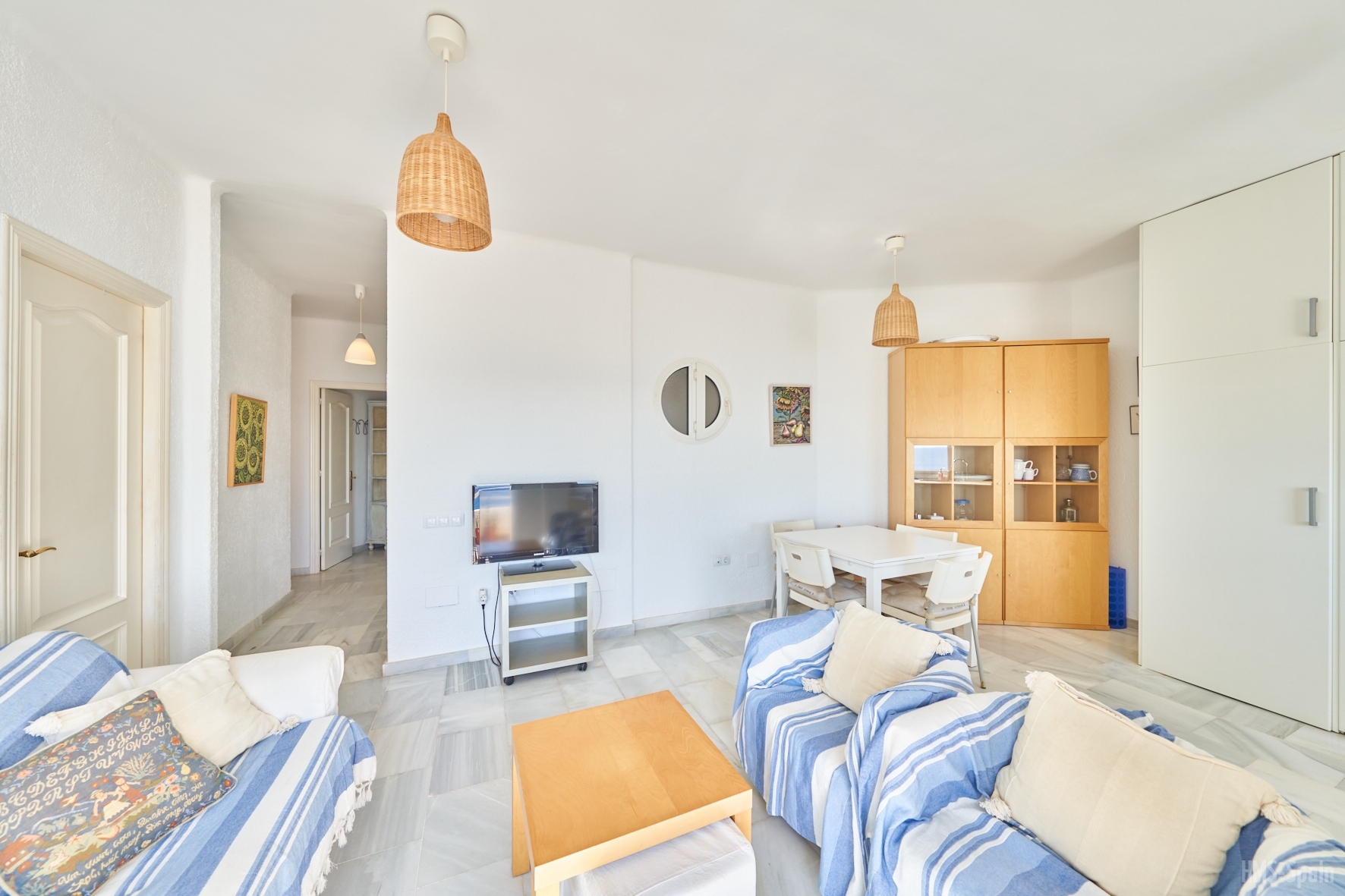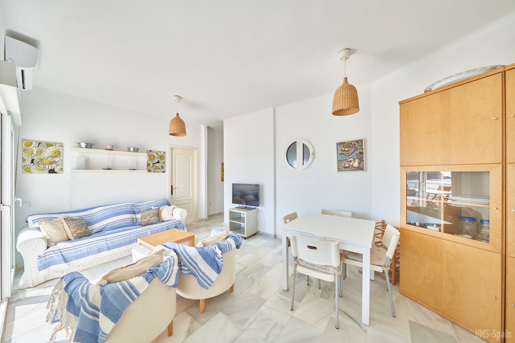 Salón con cocina abierta, la cocina está totalmente equipada con frigorÃfico, lavadora, lavavajillas,horno, microondas, cafetera, tostador y batidora. El salón da a una terraza con una magnificas vistas a la playa de la Calilla, la terraza dispone de mesas y sillas.
