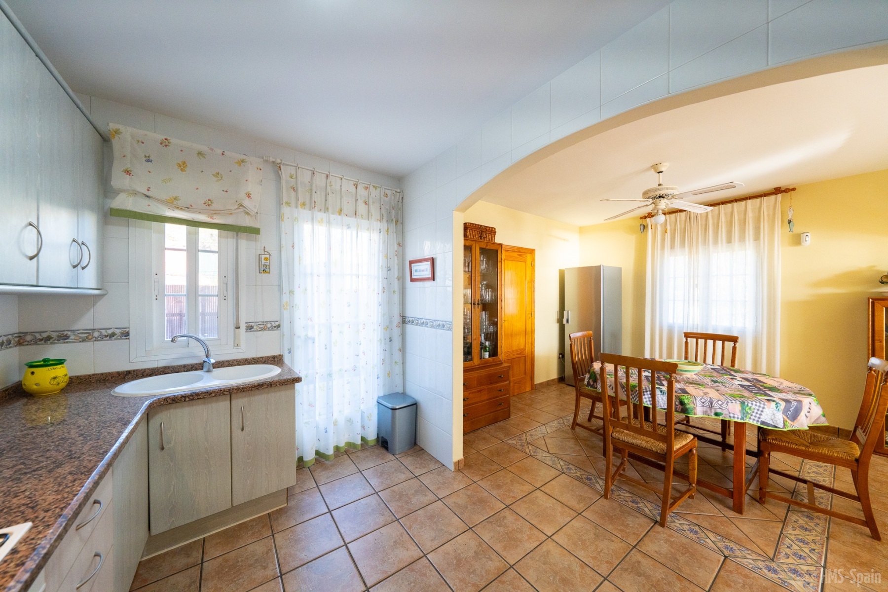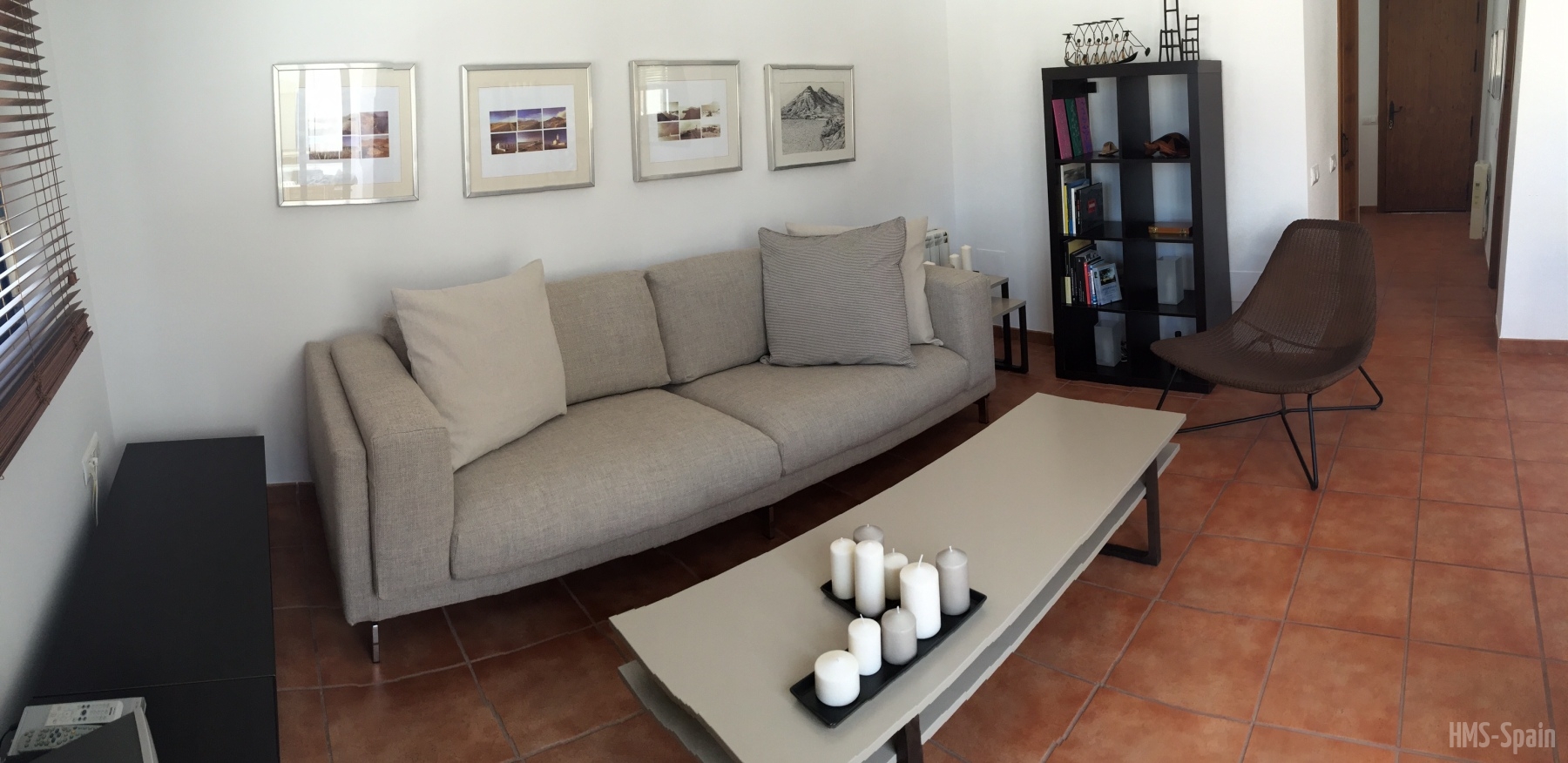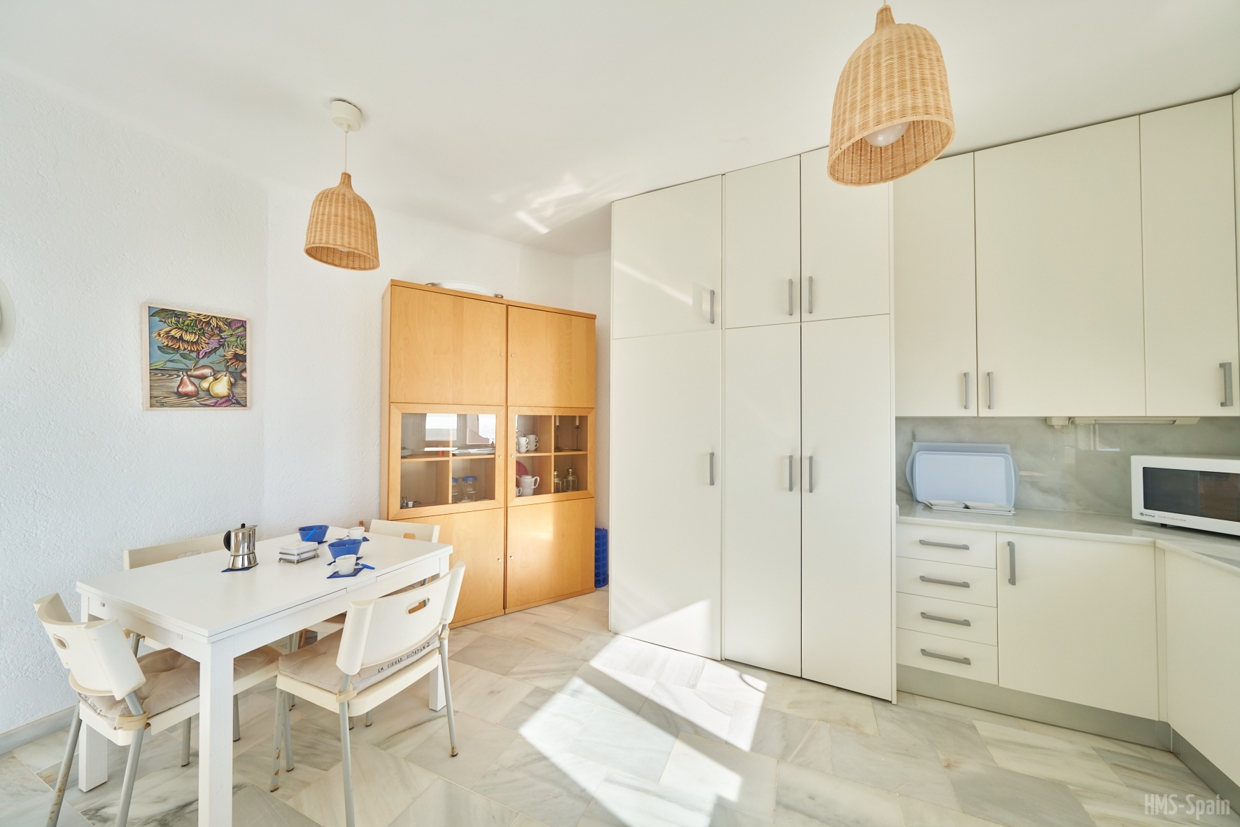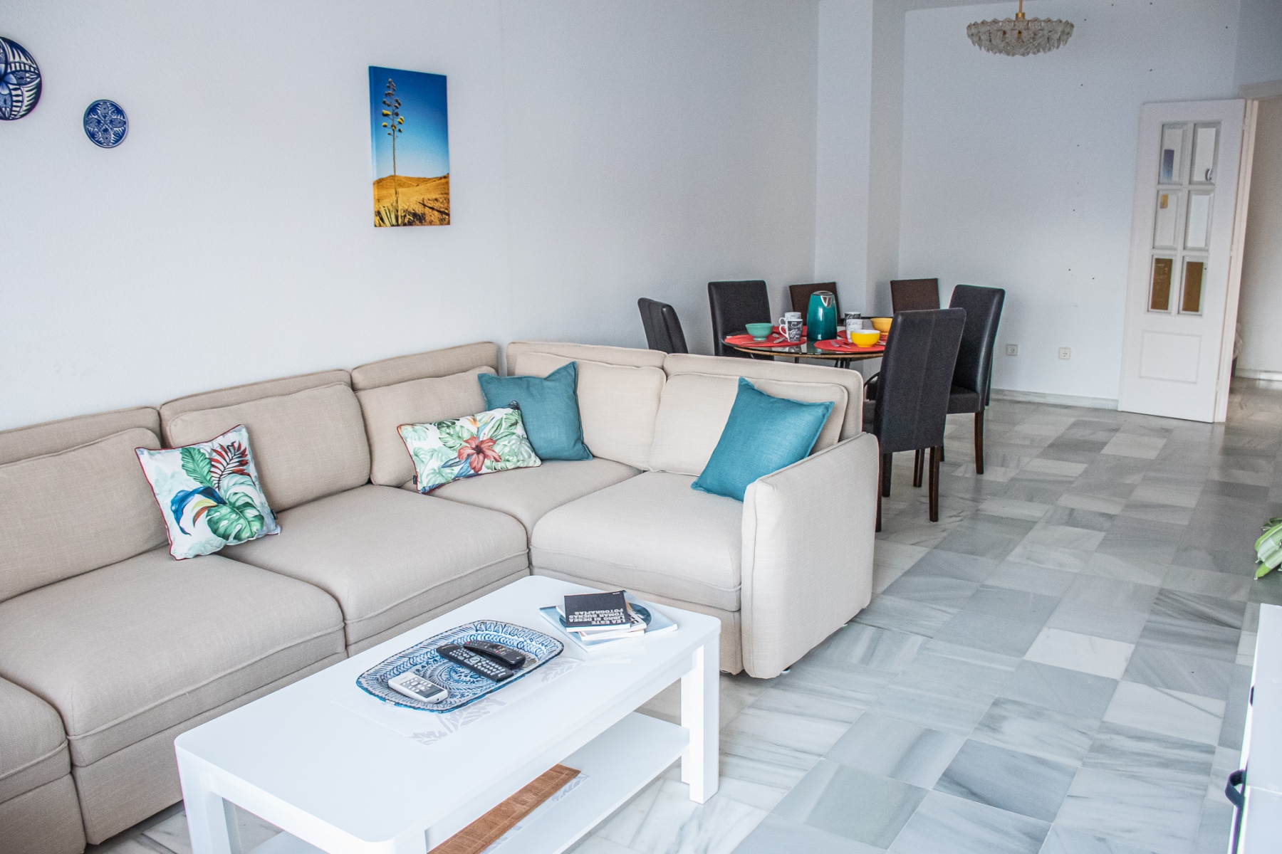 Salón con cocina abierta, la cocina está totalmente equipada con frigorÃfico, lavadora, lavavajillas,horno, microondas, cafetera, tostador y batidora. El salón da a una terraza con una magnificas vistas a la playa de la Calilla, la terraza dispone de mesas y sillas.