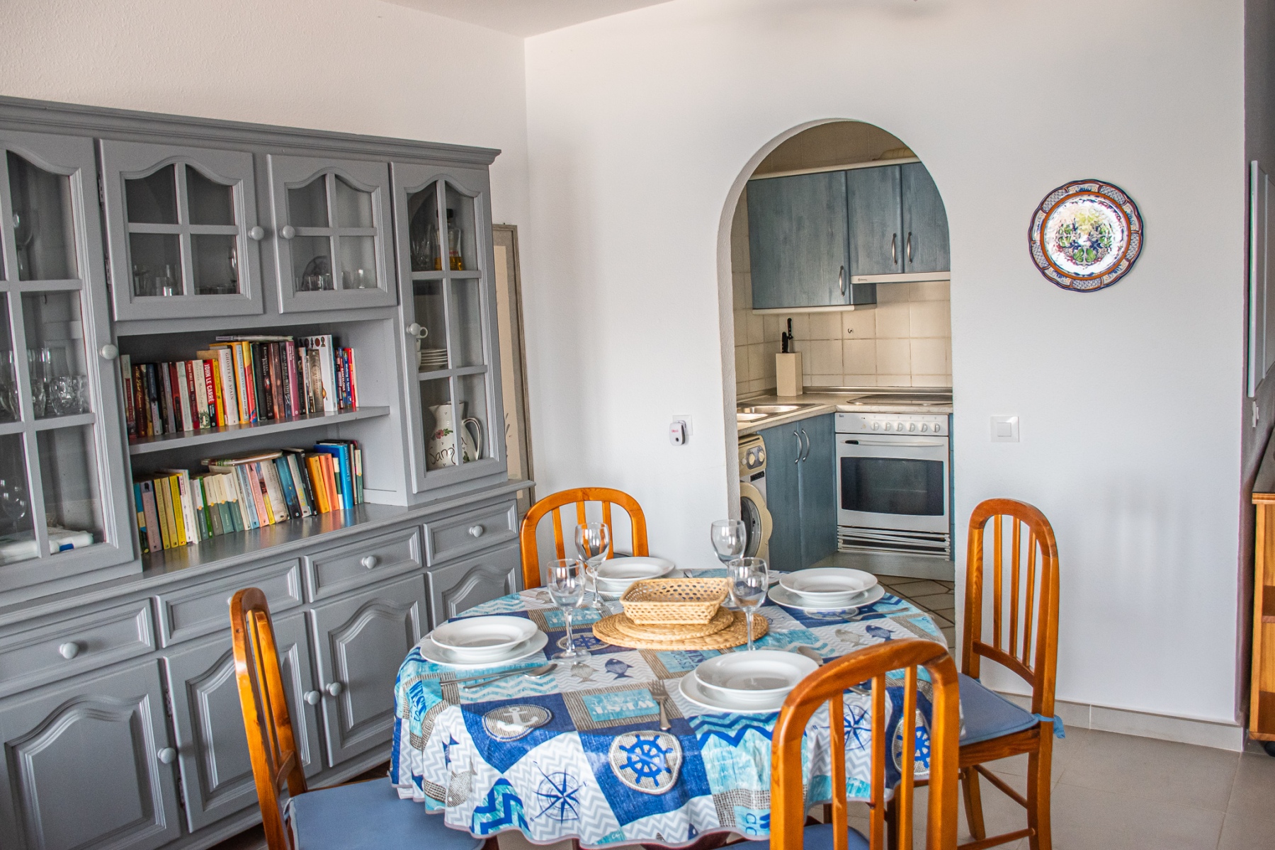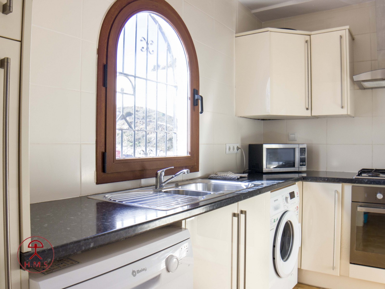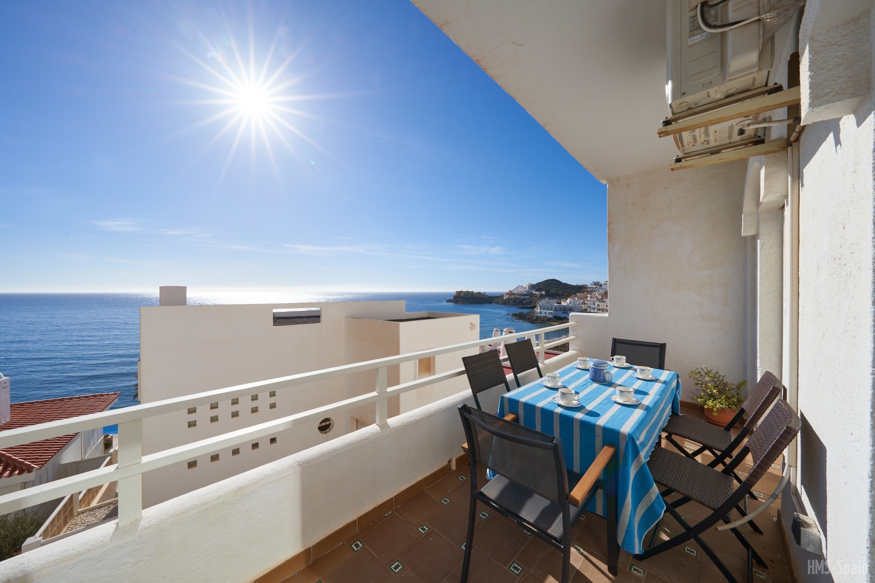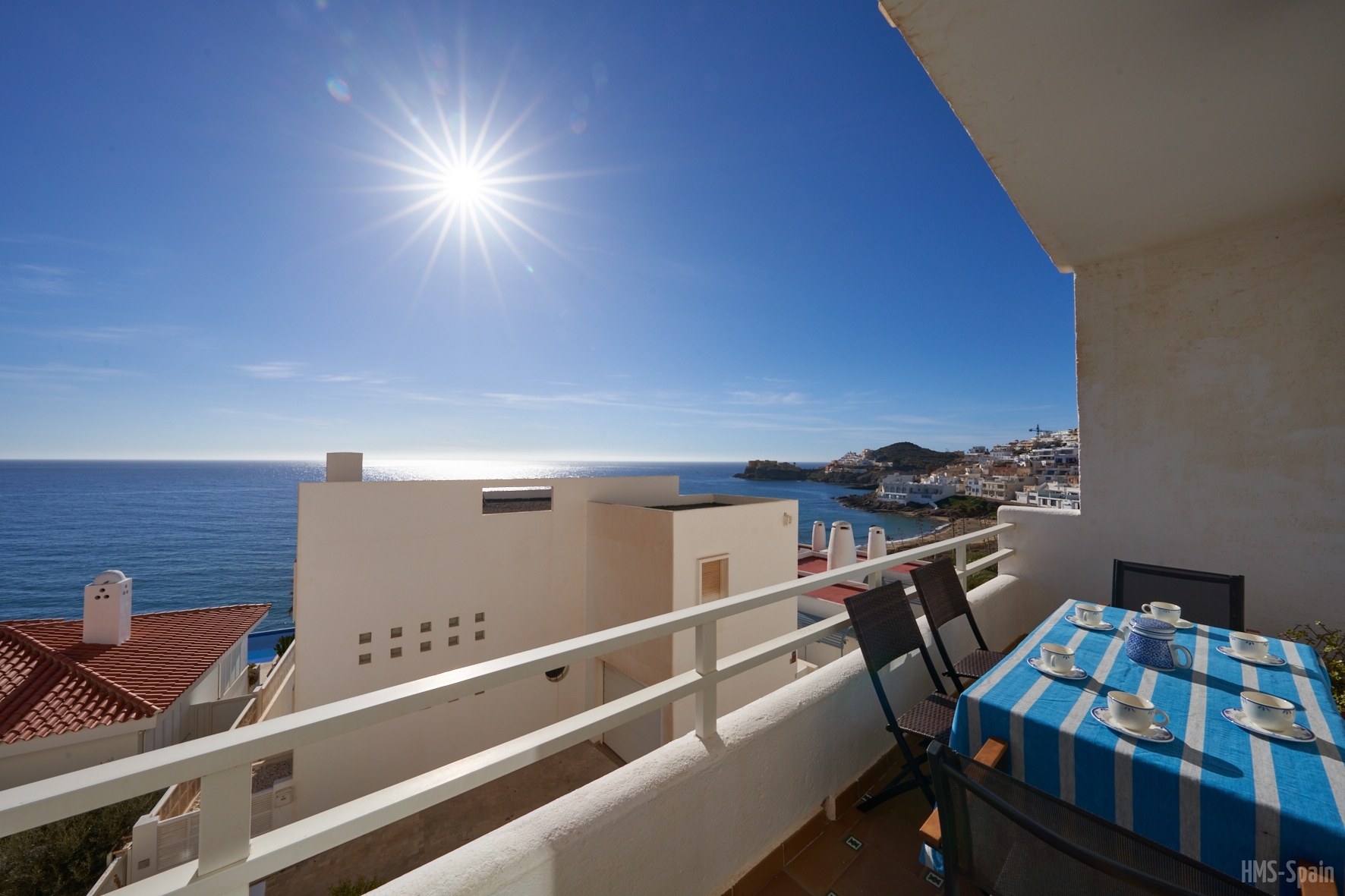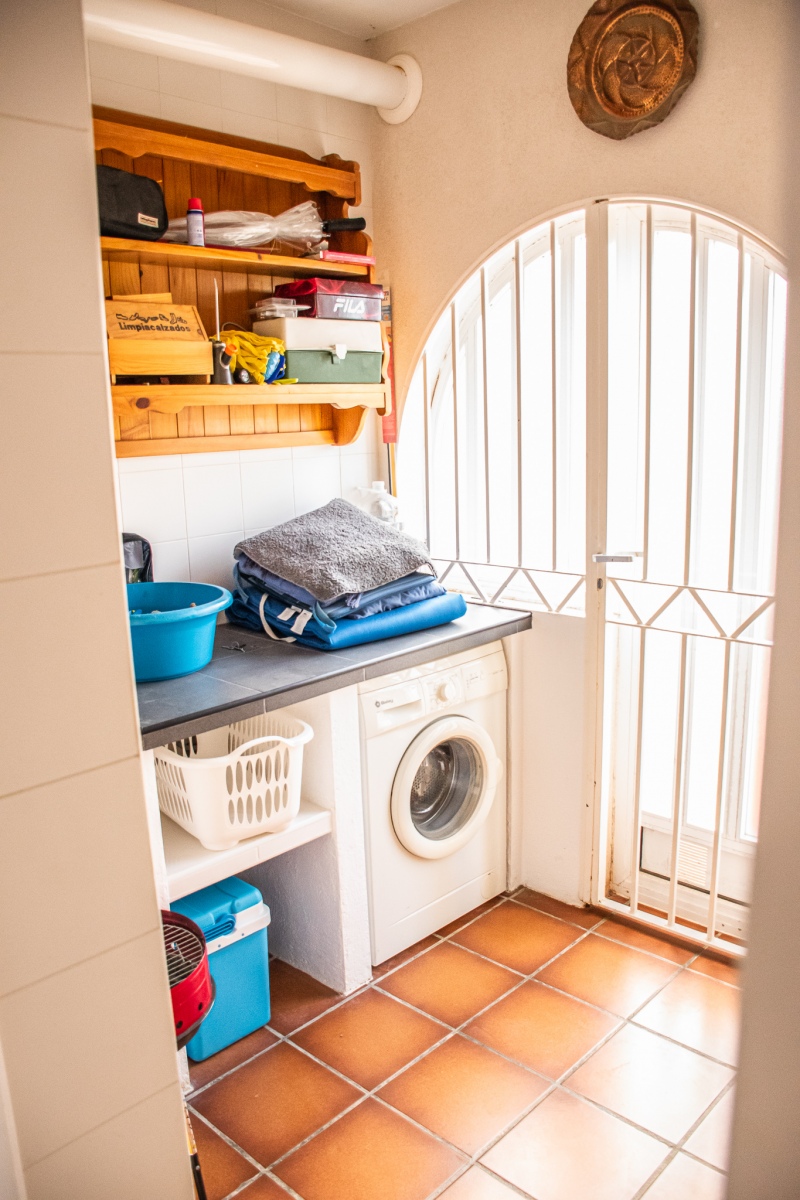 La casa dispone de sabanas y toallas de casa, no de playa, la terraza tiene mesas y sillas, la cocina esta completa de menaje y pequeño electrodomestico, frigo, lavadora,lavavajillas, horno, cafetera, microondas, batidora, plancha y tabla de planchar. Es una casa ideal ya que esta ubicada en una zona tranquila y muy cercana a la playa y al centro, por su orientacion no es calurosa ademas las vistas a la bahia son espectaculares. La piscina es comunitaria asi como la barbacoa. La casa tiene WiFi Gratis. Aire acondiconado en salón y dormitorios.