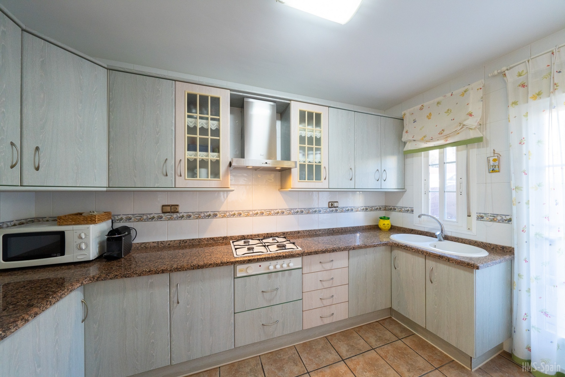 En la planta de entrada tiene el salón con terraza completa de mesa y sillas, la cocina con lavadora, frigorifico, vitroceramica, microondas, cafetera, tostador, un baño completo con ducha, bajamos a la 2ª planta en ella están los tres dormitorios, uno de ellos con cama doble y los otros dos con dos camas individuales cada uno, además de un baño completo con bañera, tiene Aire Acondicionado en los dormitorios y el salón, en la parte exterior de la casa tiene un bonito jardin estilo mediterráneo además de un zona para poder dejar el coche. El tejado es transitable. Dispone de ropa de cama y toallas.