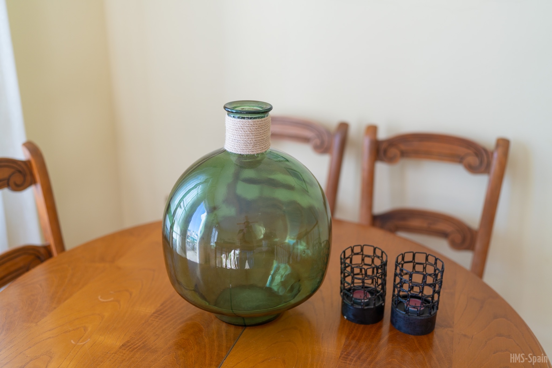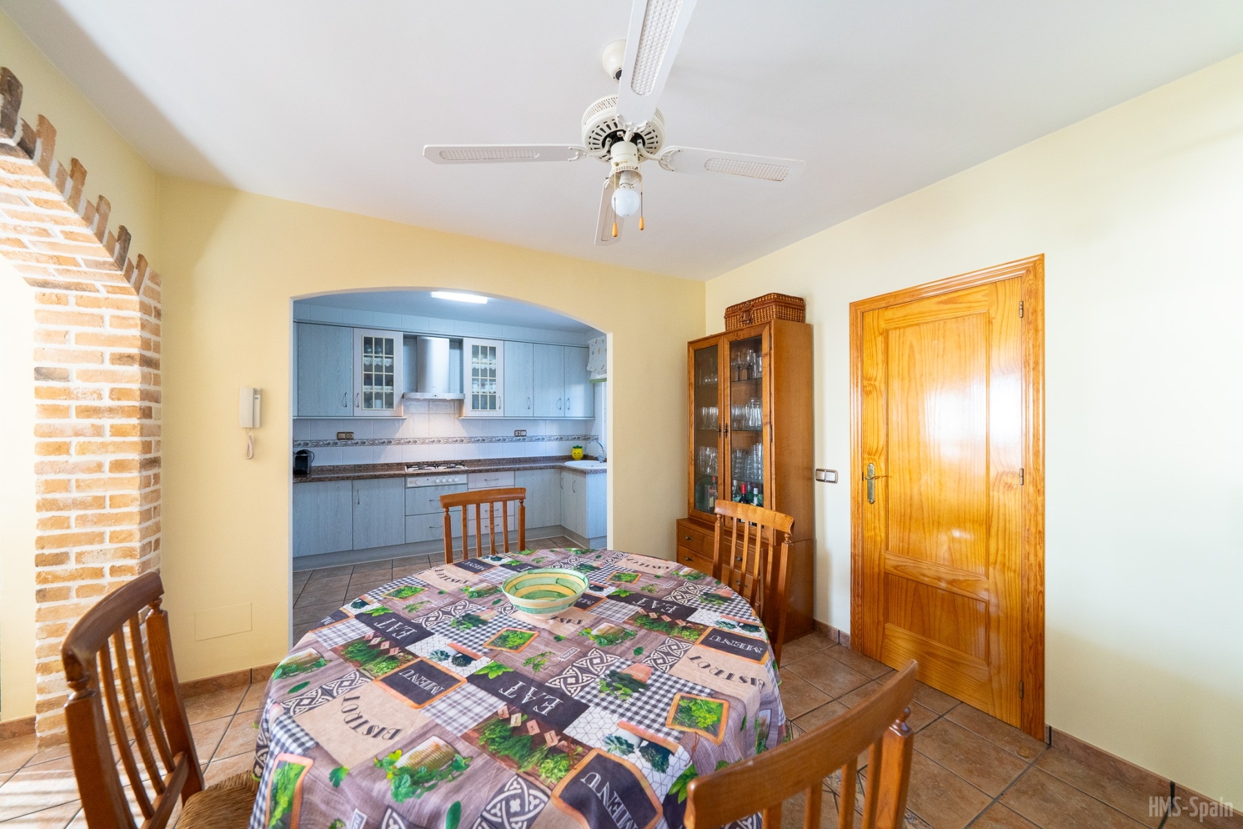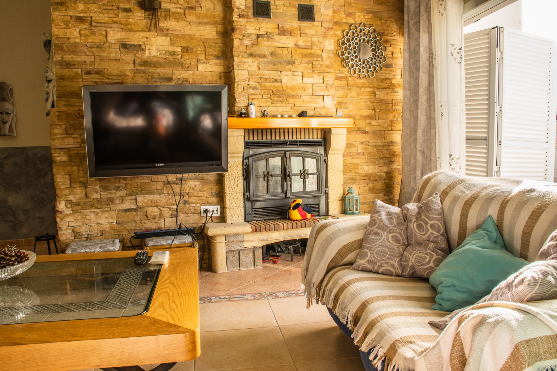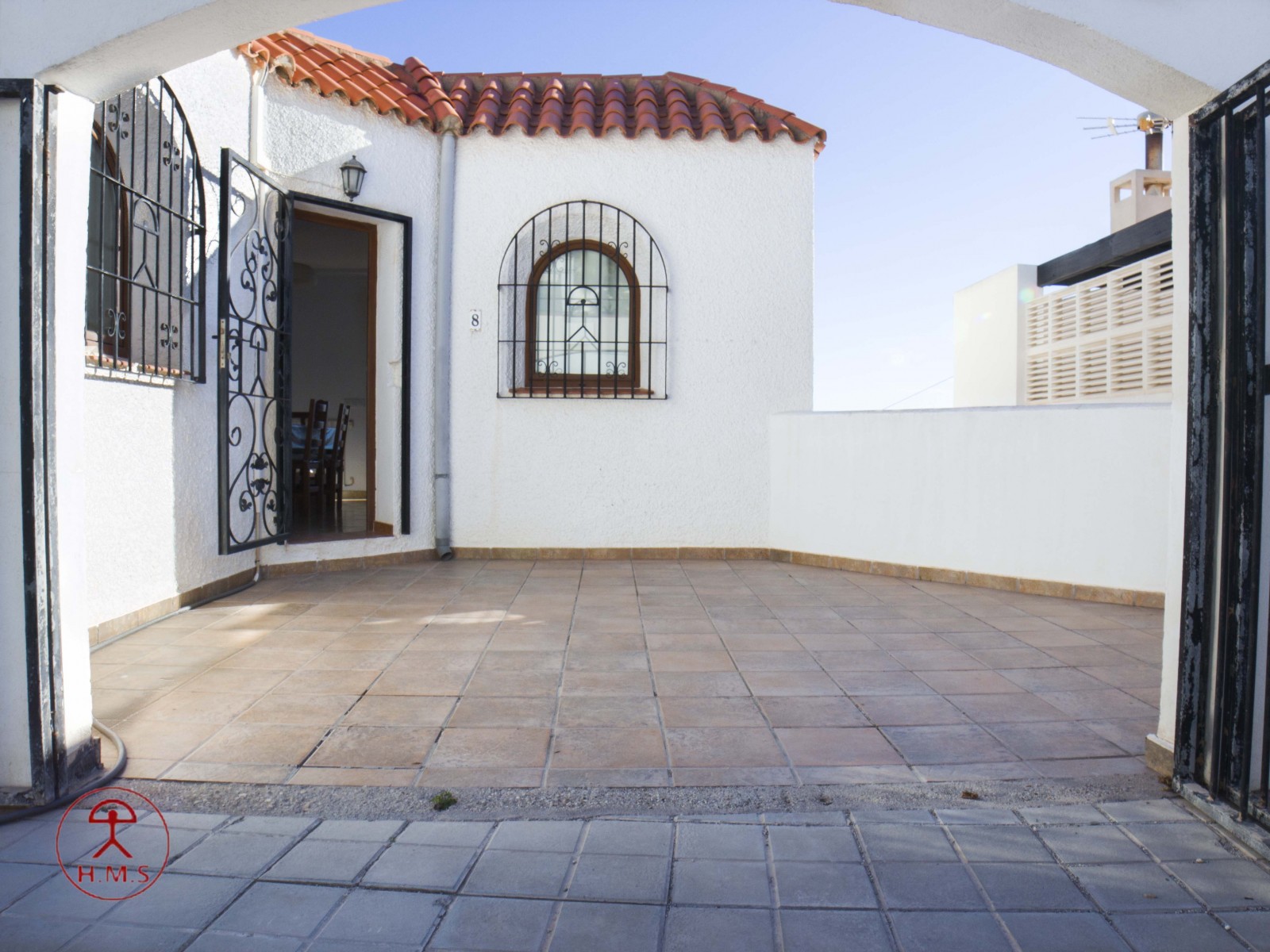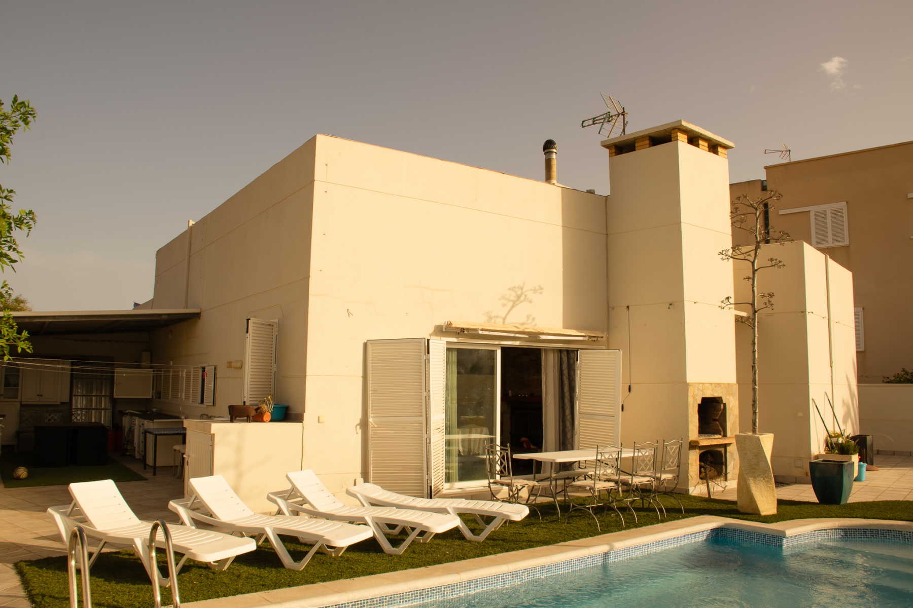 Casa de tres dormitorios y dos baños, con piscina privada y aire acondicionado, con un gran patio con mesa y sillas, esta en una planta, tiene un dormitorio con una cama de 150 cm y un baño completo con bañera, otro dormitorio con una cama doble y un tercer dormitorio con dos camas de 90cm, además de un baño con ducha, un gran salón de 25m con con un gran ventanal que da a la piscina. La cocina está completa de menaje y pequeño electrodoméstico, cafetera, tostador, microondas, plancha y tabla de planchar, está en una zona tranquila del pueblo, ideal para familias que quieran descansar. Piscina grande rodeada de vallas para diferenciar la parte de la piscina del patio de entrada de la casa. Dispone de sábanas y toallas de casa.