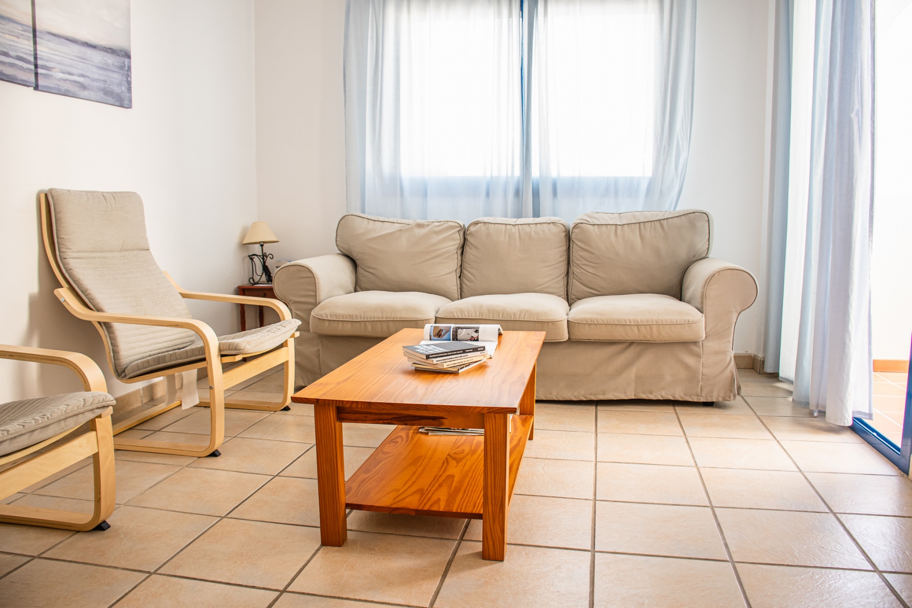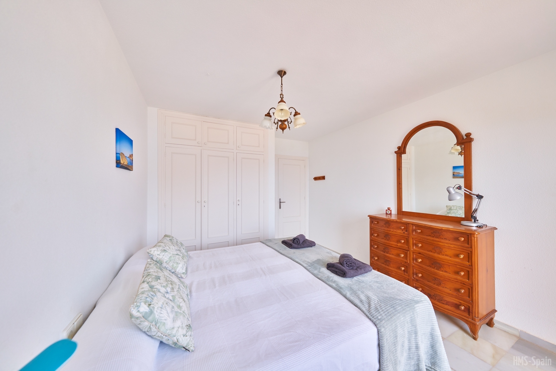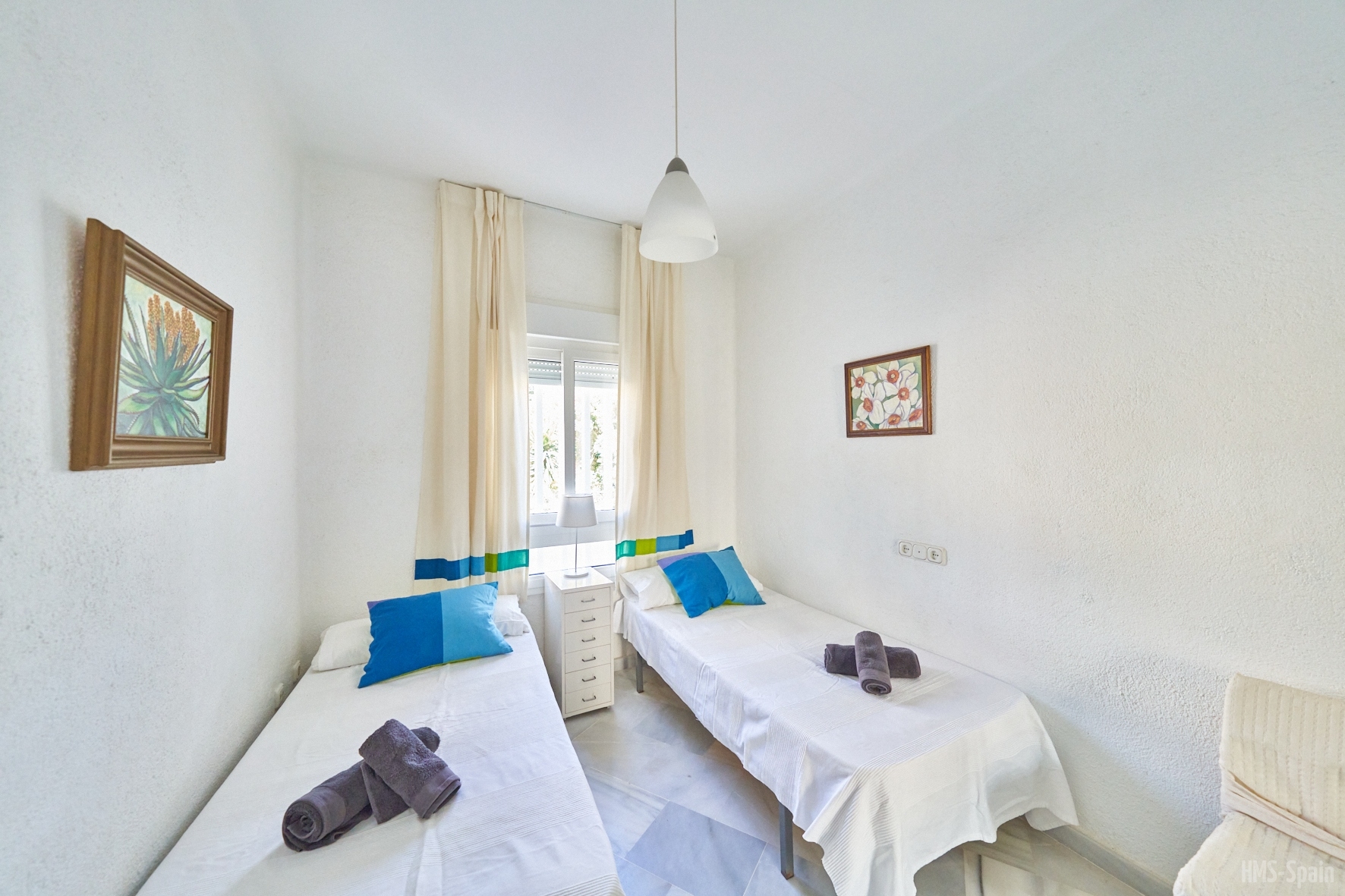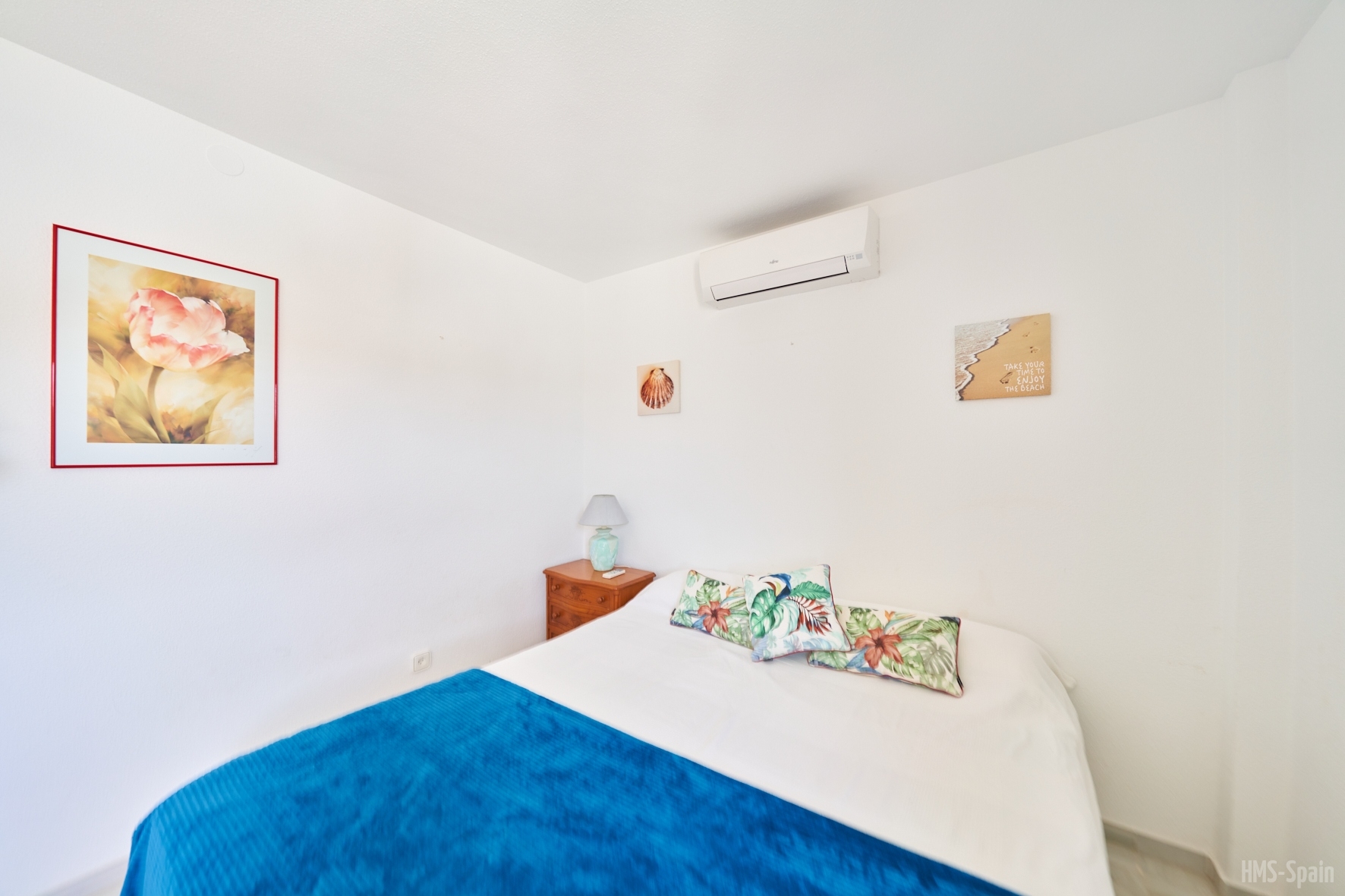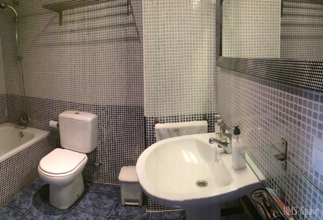 Apartamento en primera planta. Tiene tres dormitorios, uno con cama de 150 y baño en suite , un segundo dormitorio con dos camas de 90 cm y un tercer dormitorio con una cama de 90 cm, un segundo baño con ducha. AIRE ACONDICIONADO EN SALÓN.
