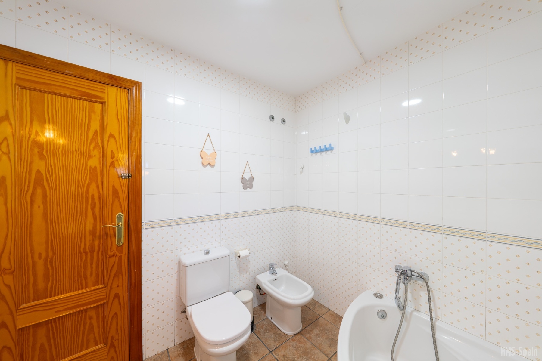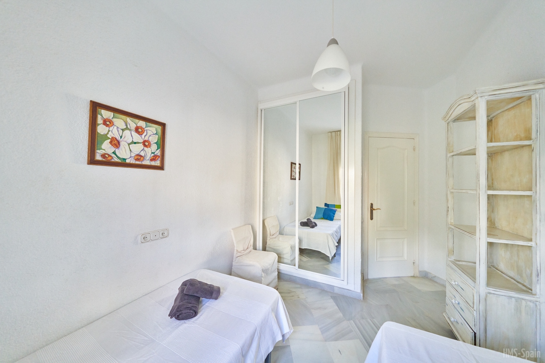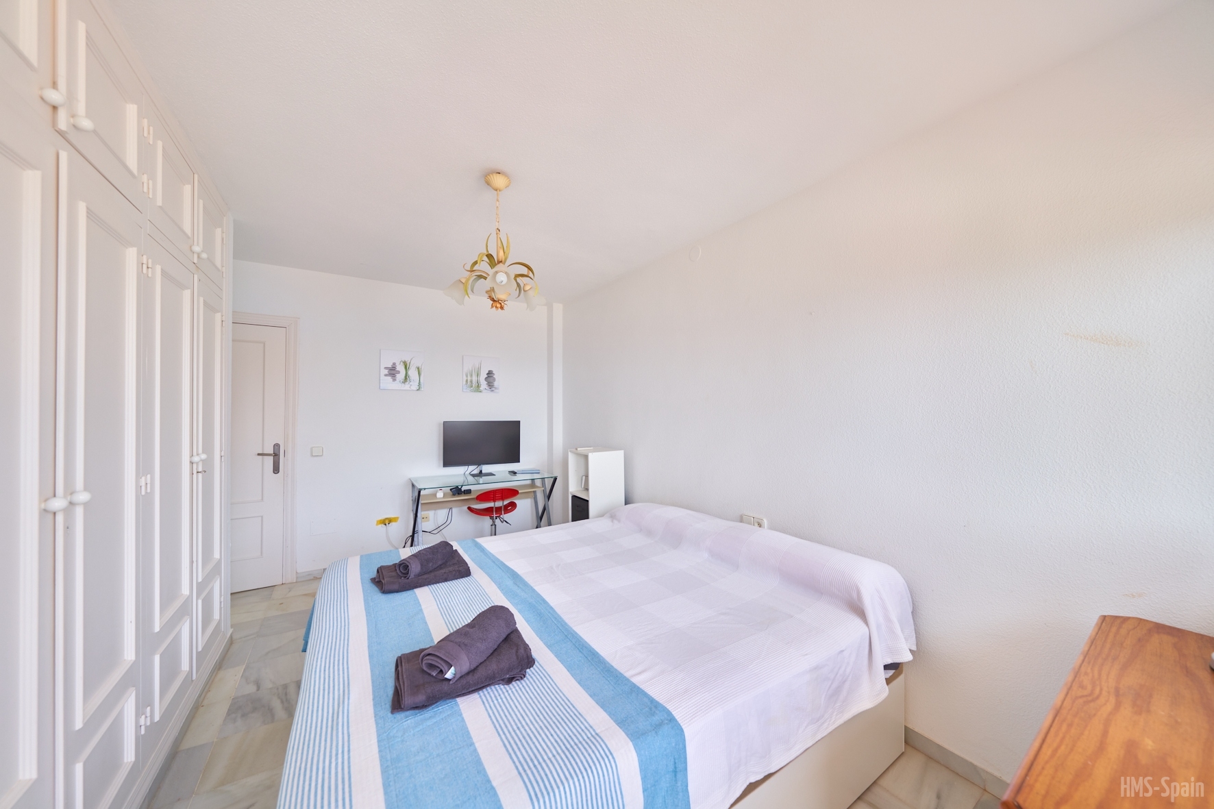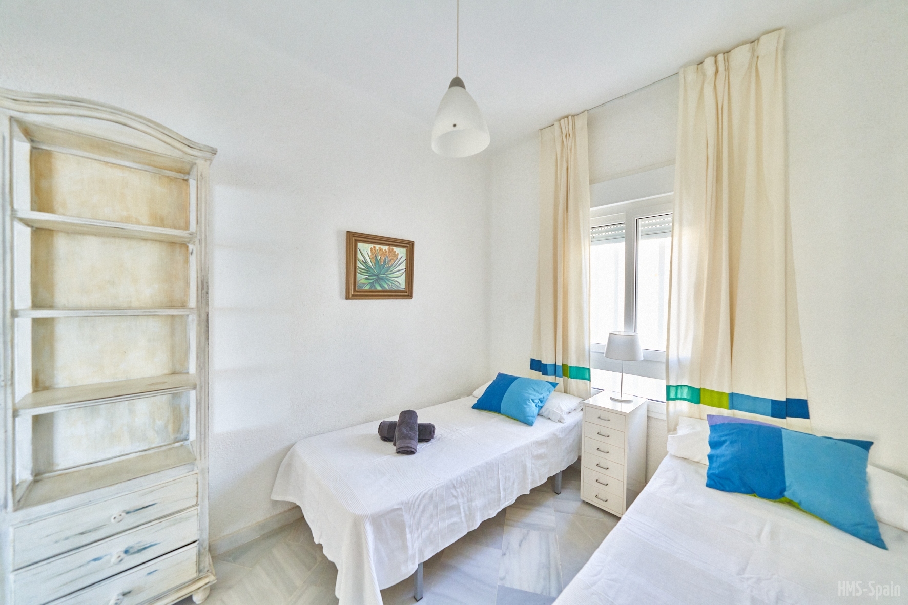 Apartamento en primera planta. Tiene tres dormitorios, uno con cama de 150 y baño en suite , un segundo dormitorio con dos camas de 90 cm y un tercer dormitorio con una cama de 90 cm, un segundo baño con ducha. AIRE ACONDICIONADO EN SALÓN.