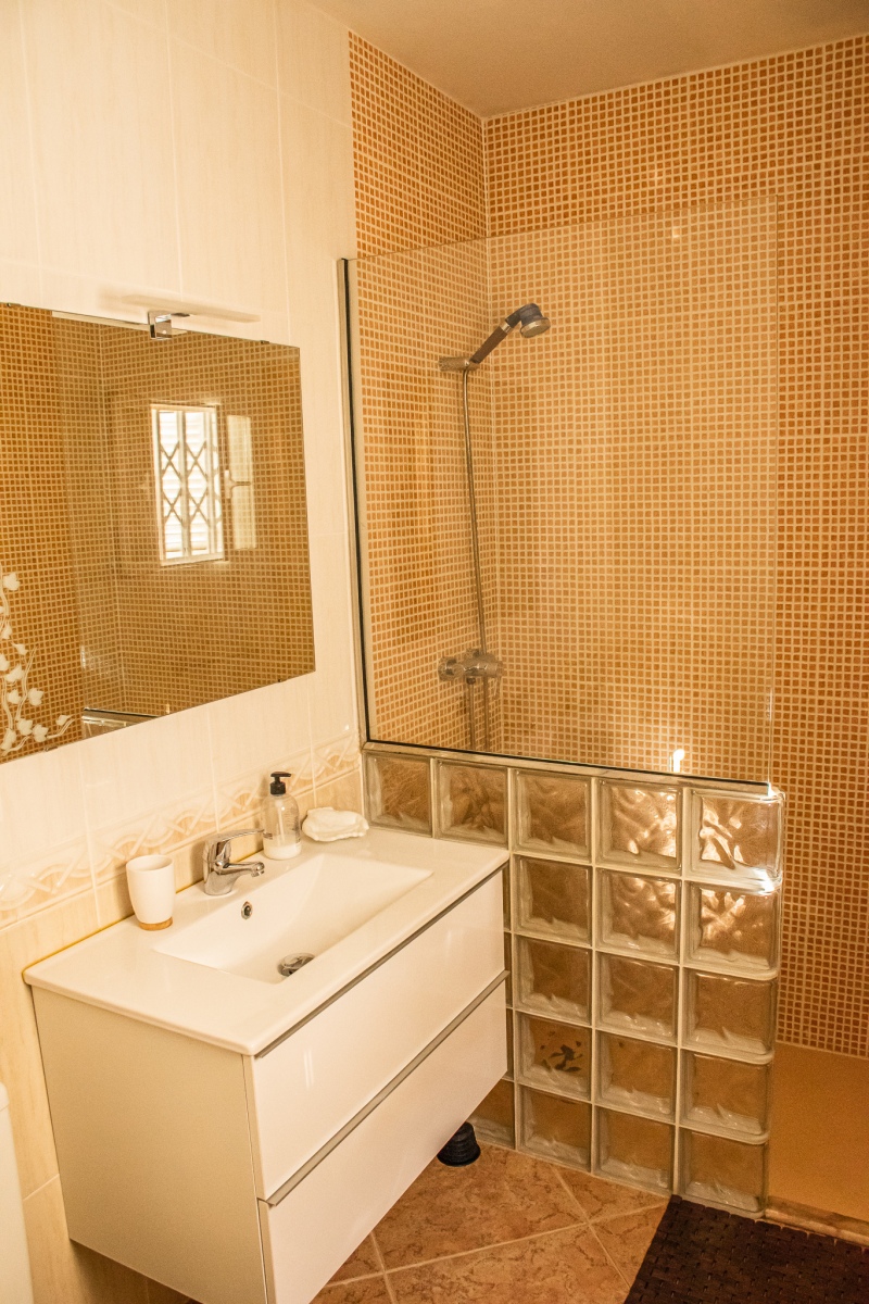 En la planta baja está compuesta de tres dormitorios, uno con cama de 160 cm con baño en suite (ducha), este dormitorio dispone de una gran terraza con plantas. Un segundo dormitorio con cama de 160 cm y un tercer dormitorio con una cama-extensible hasta 180 cm (para 2 personas), y un baño con ducha.