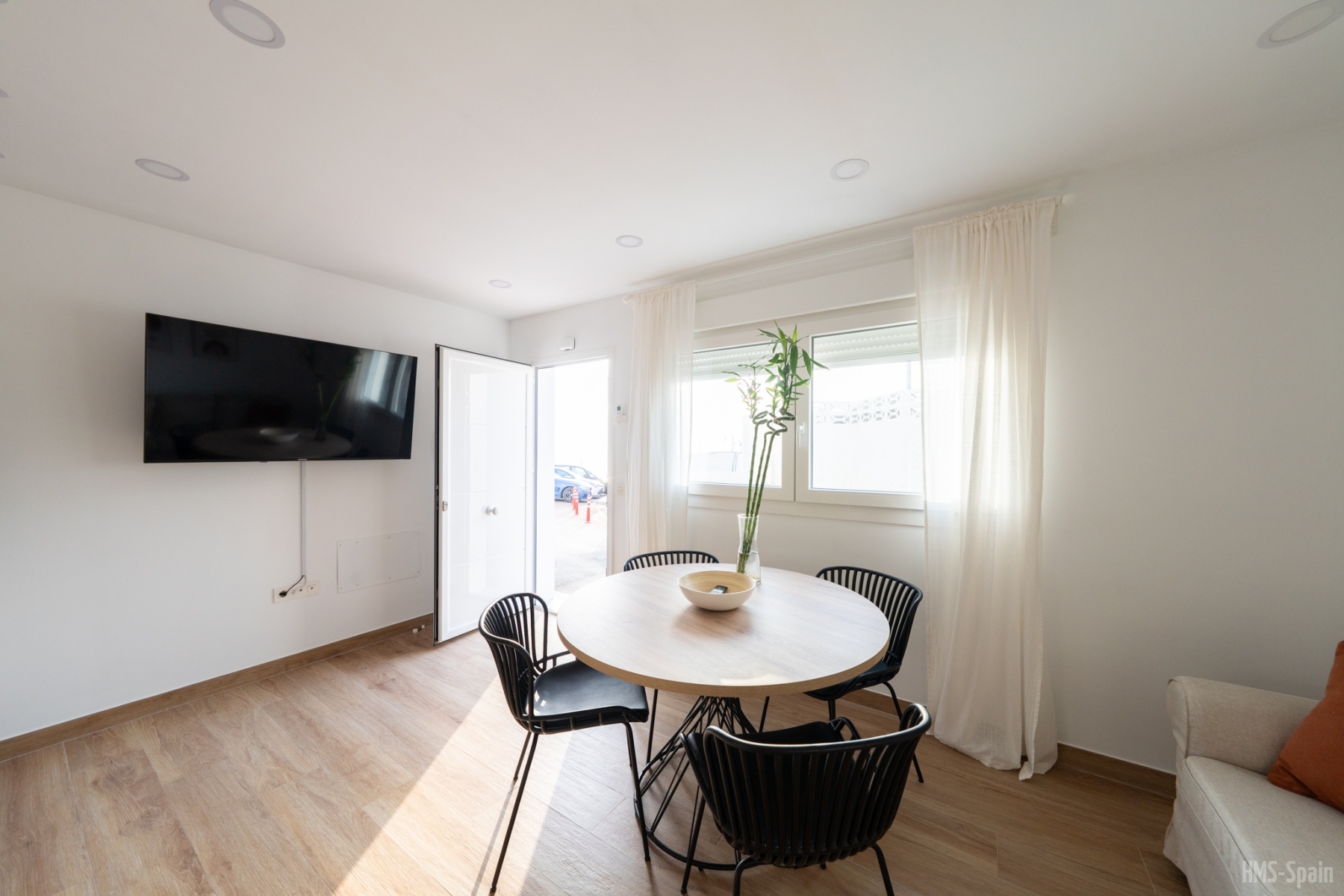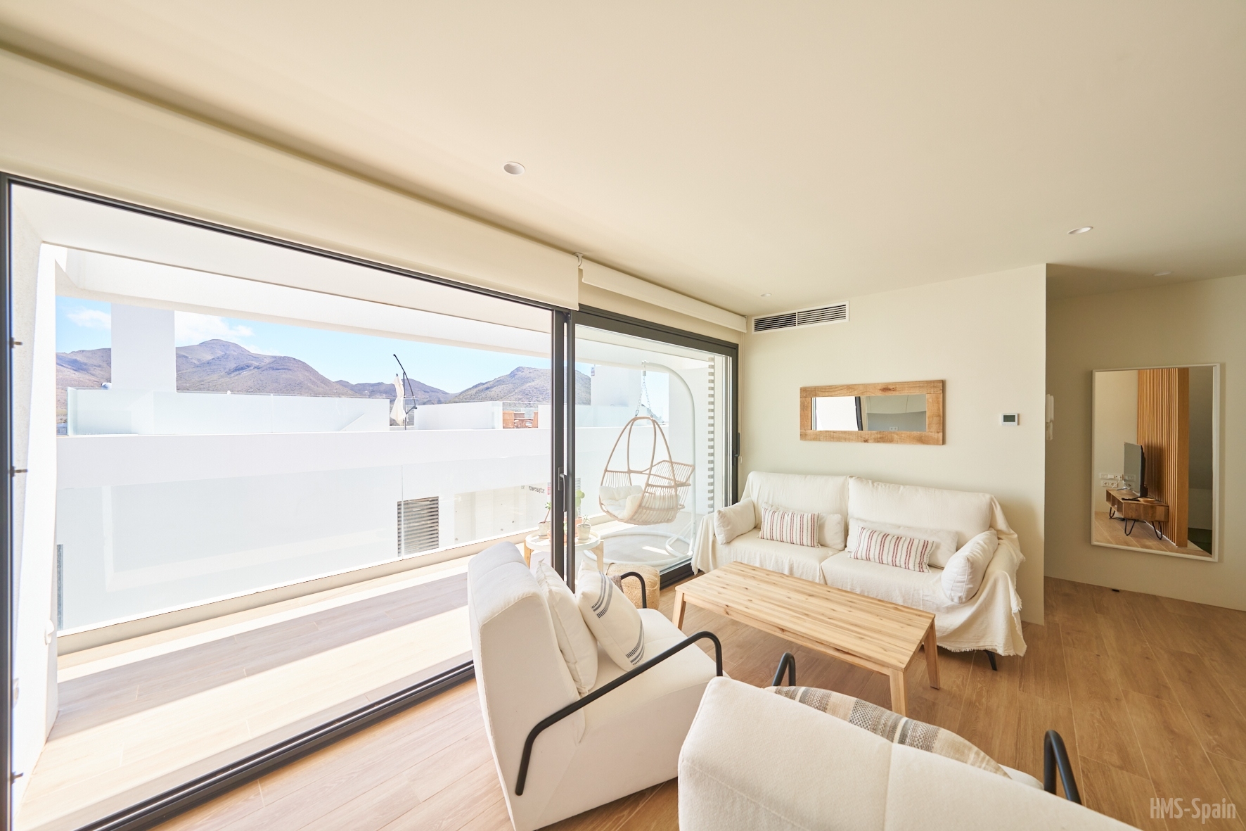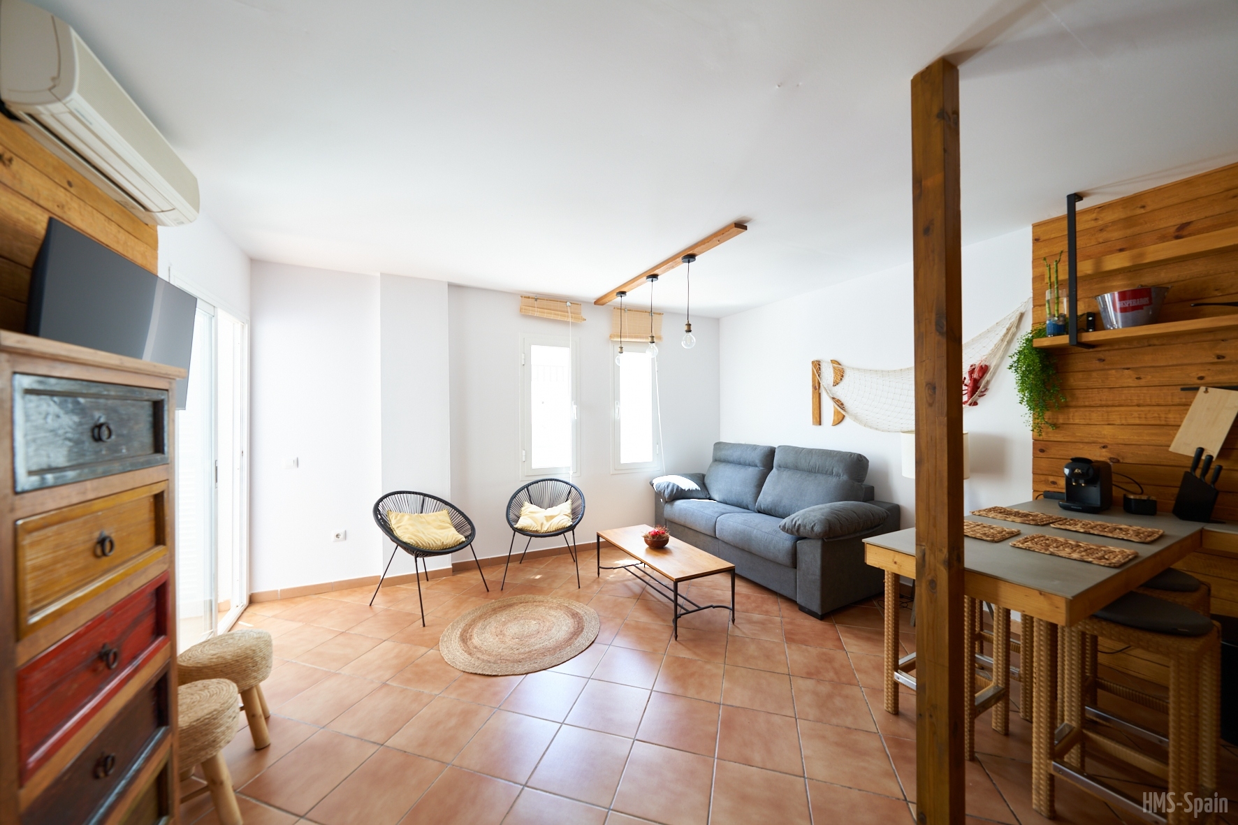 Precioso apartamento recién reformado en San José al lado de la playa. Dispone de 2 dormitorios, salón-cocina, baño y solárium con terraza y barbacoa. Ideal para pasar unas estupendas vacaciones en familia. A 50m a pie de la playa de La Calilla.