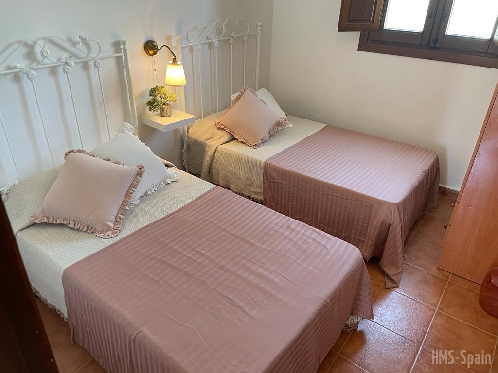 La casa está compuesta de dos plantas, en la primera planta tiene salón, cocina, aseo y un baño. En la segunda planta están los dormitorios uno con una cama doble , el otro con dos camas individuales y otro dormitorio en el sótano con cama de matrimonio .Solarium con mesas y sillas Tiene aire acondicionado en salón, ventiladores en los dormitorios y wifi gratis.